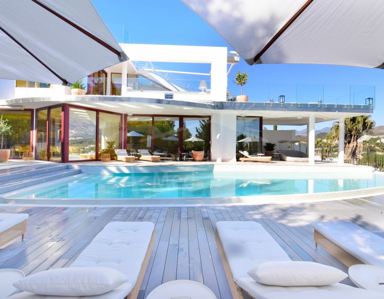 Situado en el corazón del prestigioso Valle del Golf de Nueva Andalucía, esta villa excepcional combina un lujo moderno con vistas panorámicas del Mar Mediterráneo y la emblemática Montaña La Concha. Frente al sureste, la villa destaca por su brillo,...