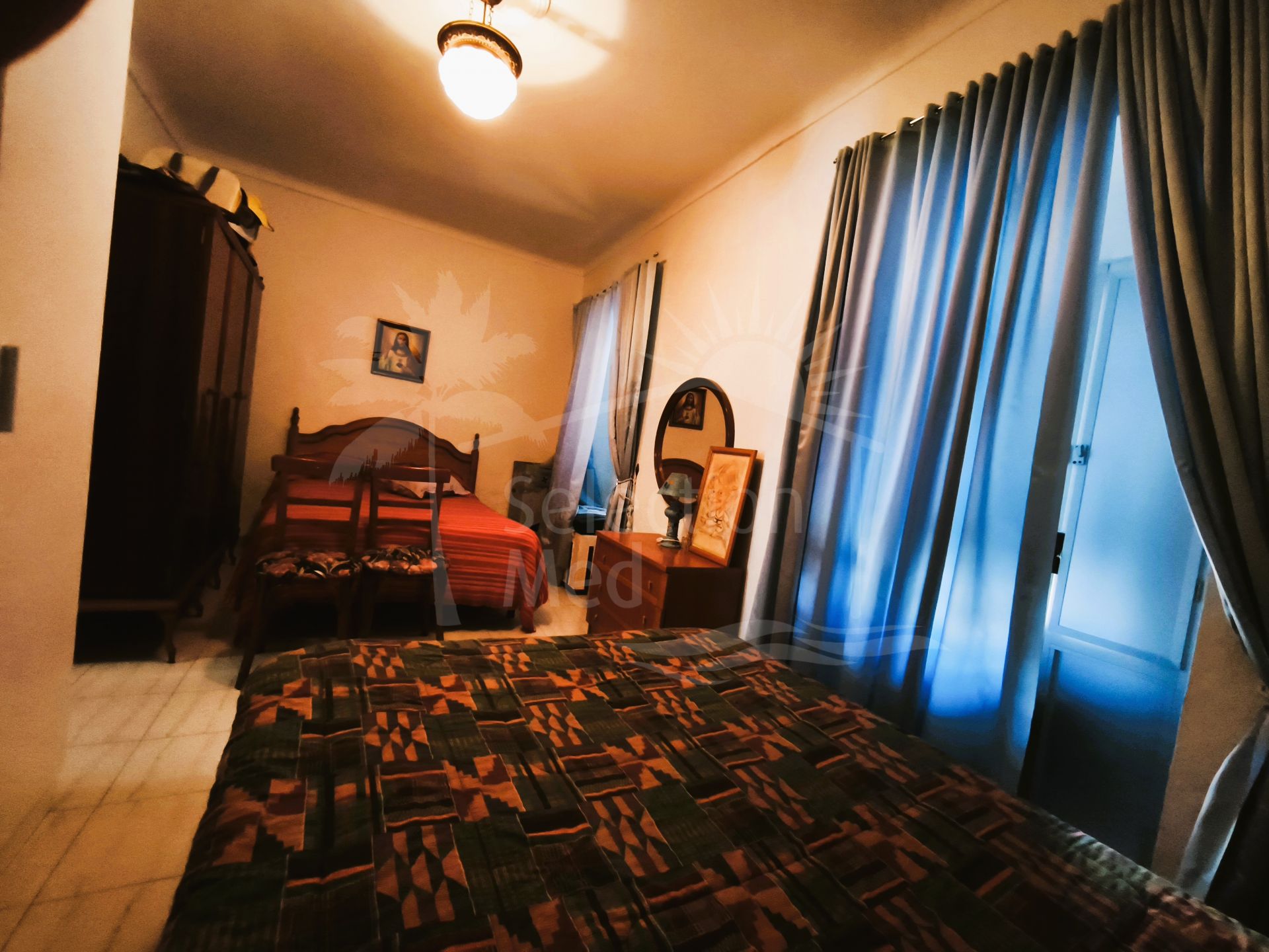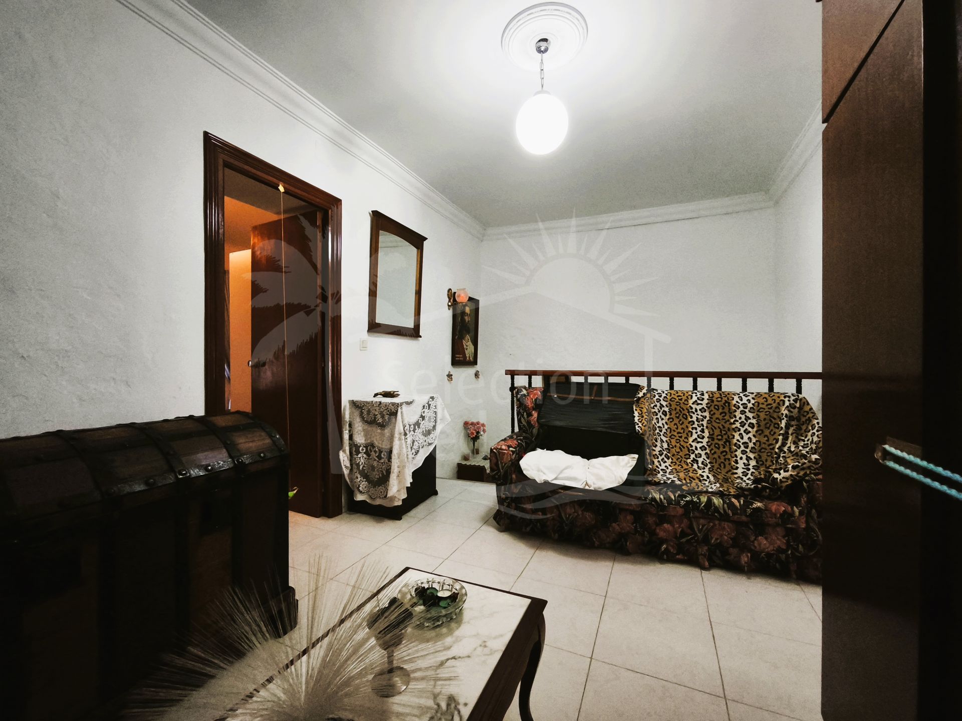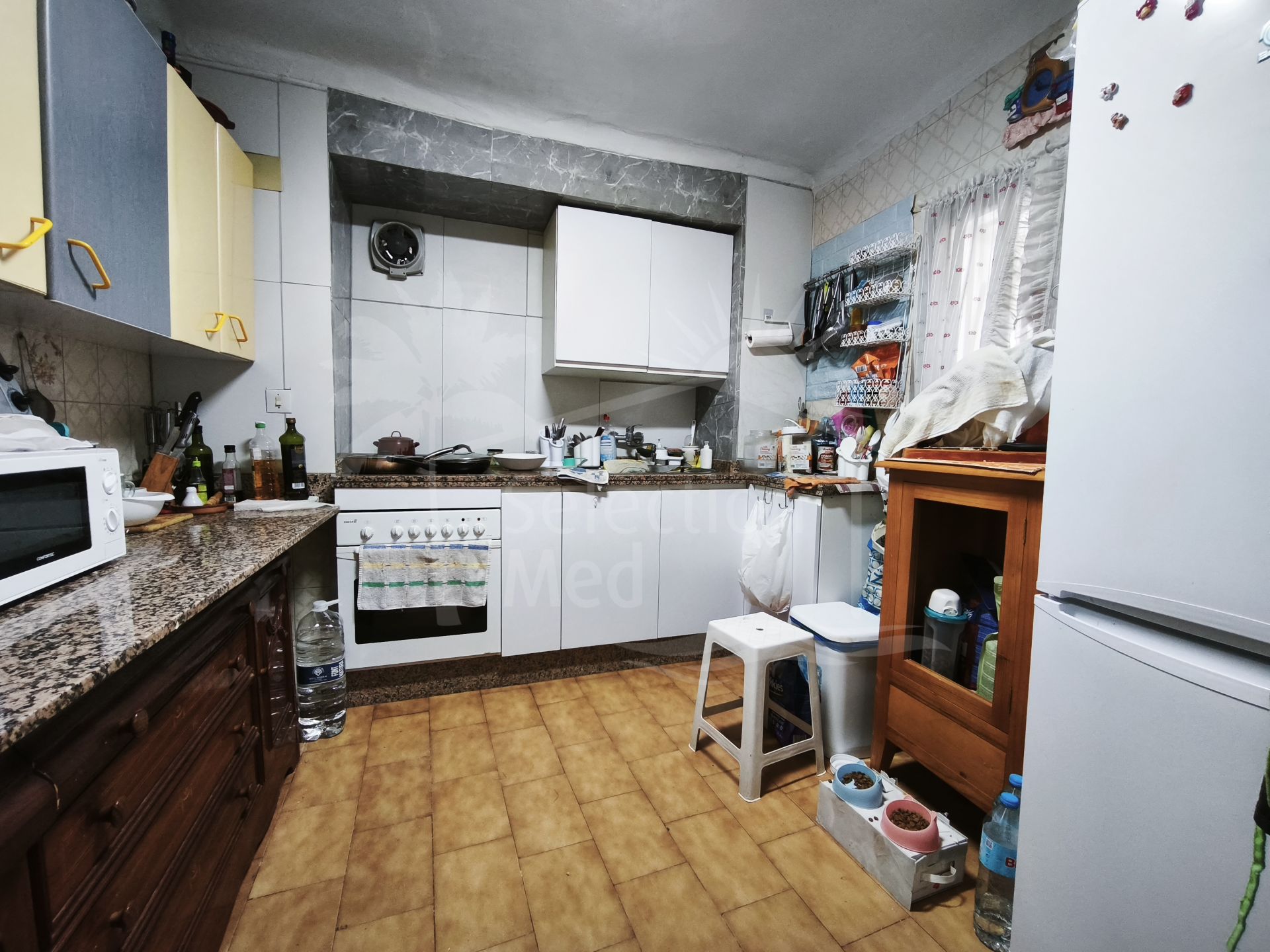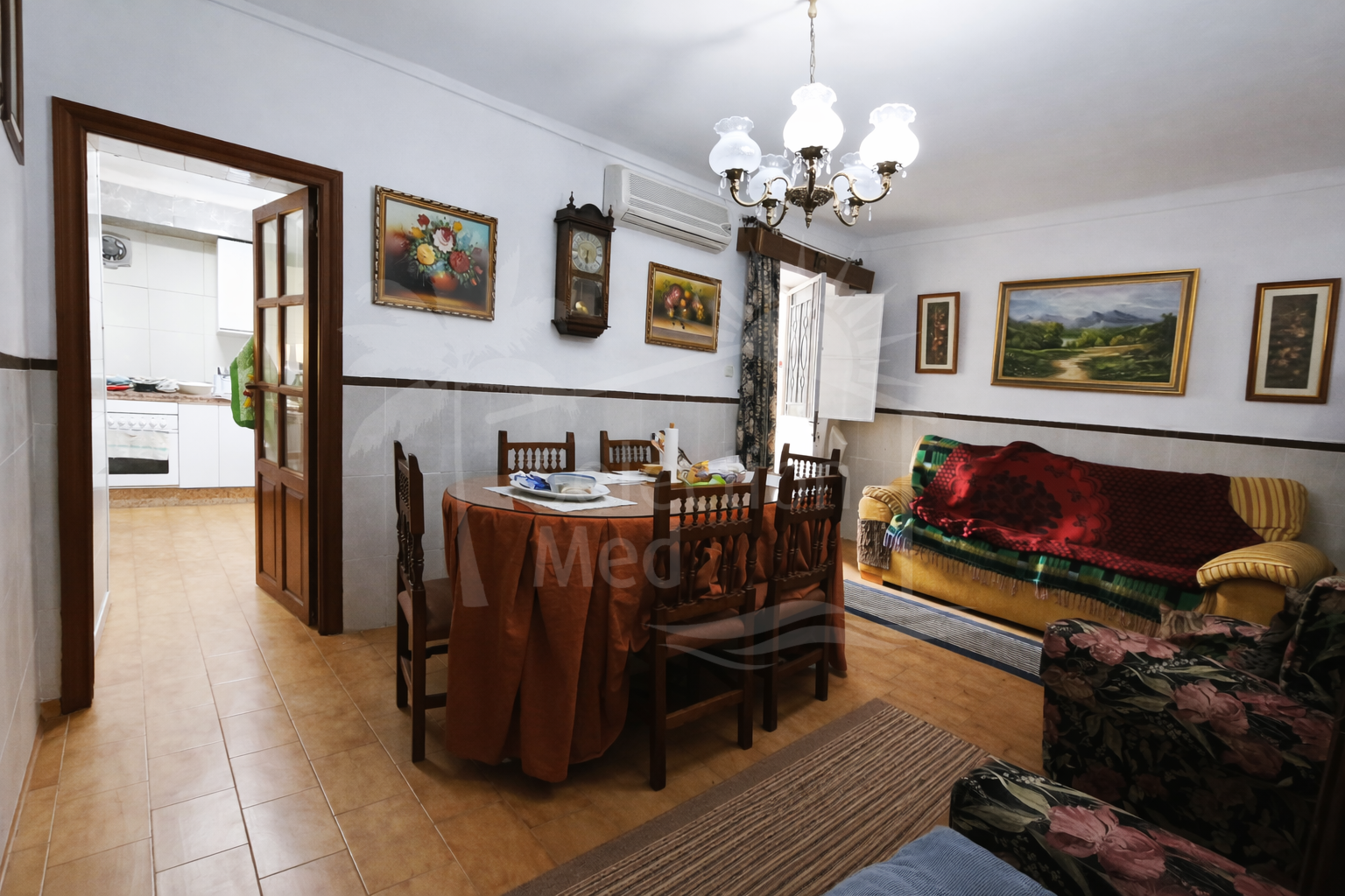 La maison s'ouvre ensuite dans un grand salon-salle à manger, le véritable cœur de la propriété, offrant un accès confortable à la cuisine indépendante et au patio intérieur. La cuisine est fonctionnelle et entièrement utilisable pour la vie quotidienne, conservant une partie de son cabinet vintage original, qui ajoute caractère et charme.
