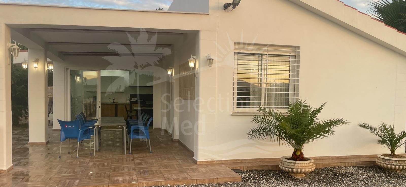 Extérieur: grand jardin avec piscine et solarium. Grande terrasse techada.