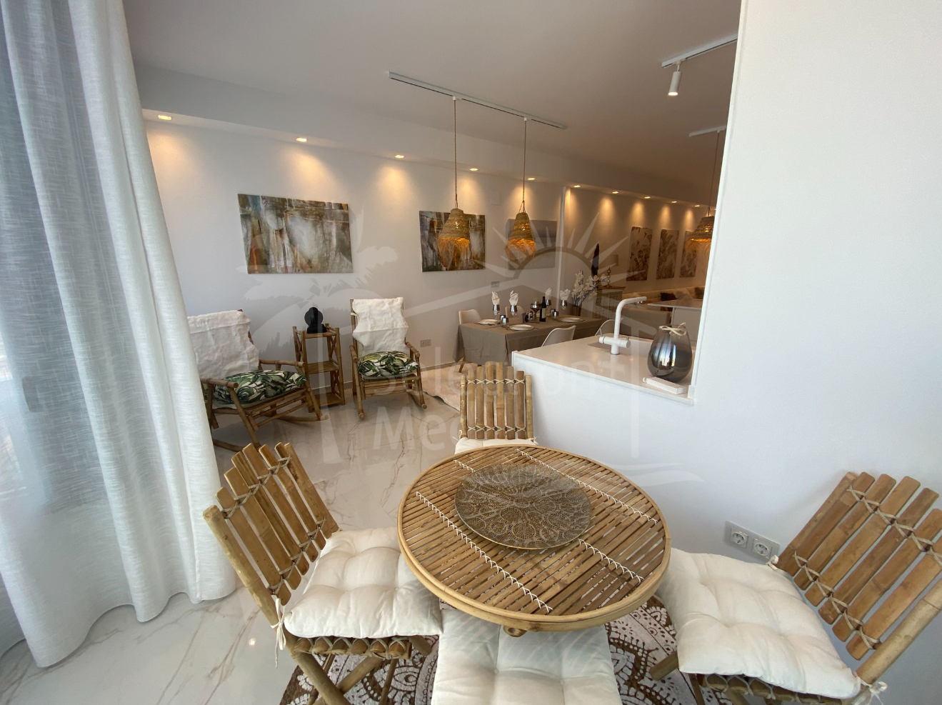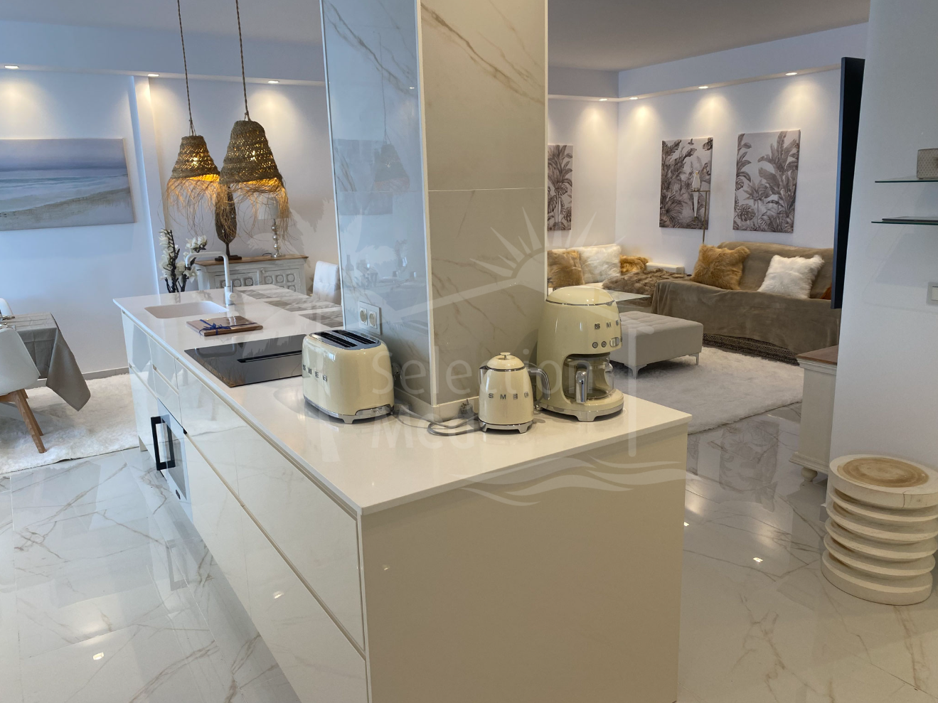 Lumineux et spacieux salon avec hauts plafonds, cuisine ouverte et salle à manger