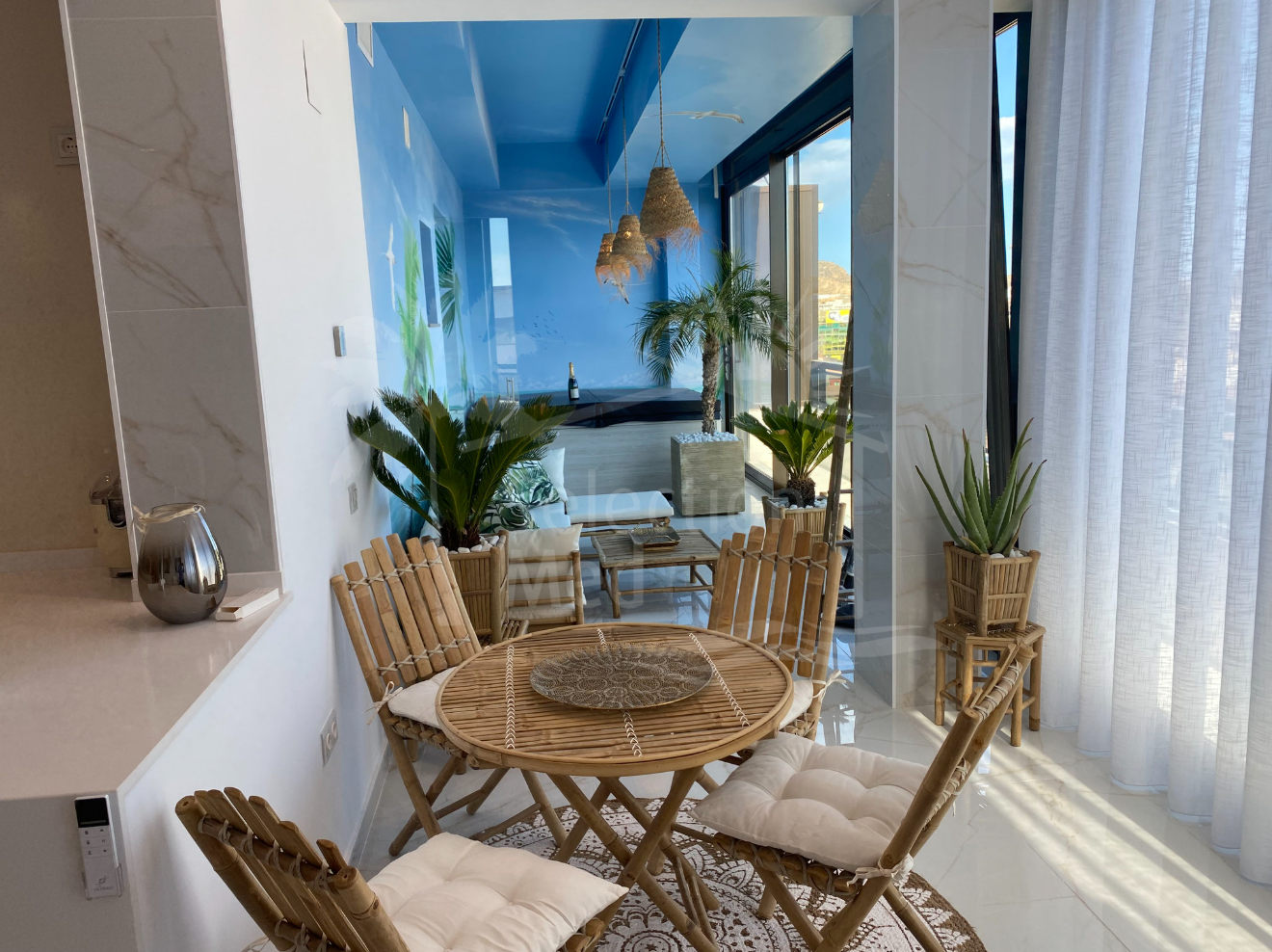 Grande terrasse privée avec jacuzzi, coin salon, mur d'art, et vue dégagée sur le château de Santa Bárbara et les taureaux