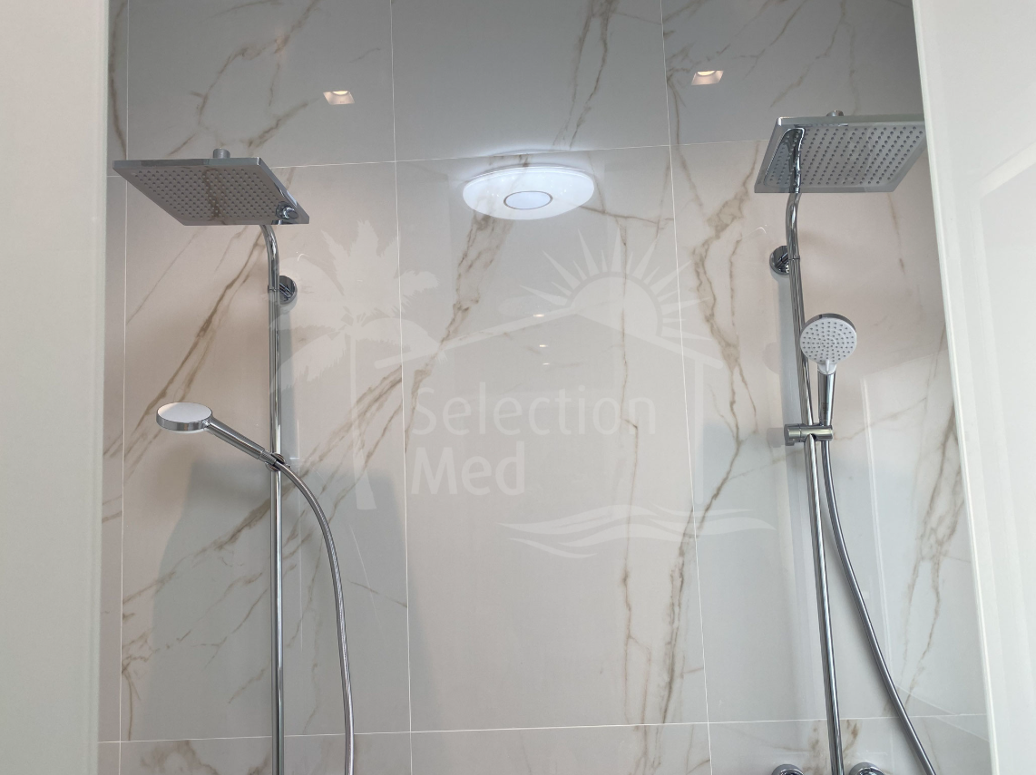 3 salles de bains modernes avec finitions premium, douches pluie et miroirs éclairés par LED