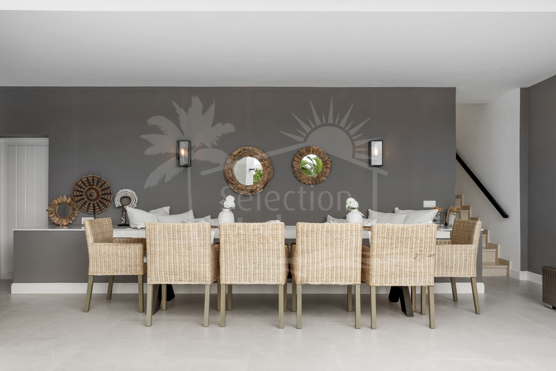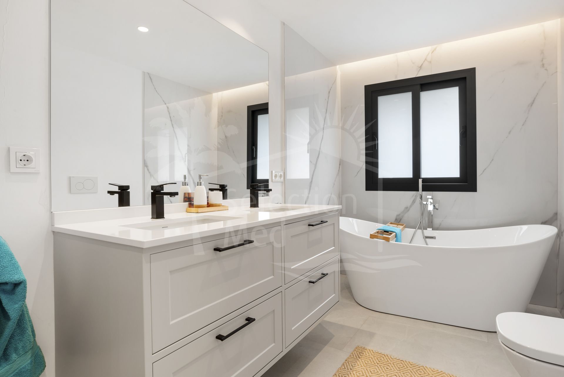 Villa à vendre et à louer à Altos del Paraiso, Benahavis avec 5 chambres, 5 salles de bains, 4 salles de bain en-suite, 5 toilets et a piscine (privé), garage (privé) et jardin (privé). Dimensions: 457m² construit, 1308m² parcelle et 200m² terrasse.