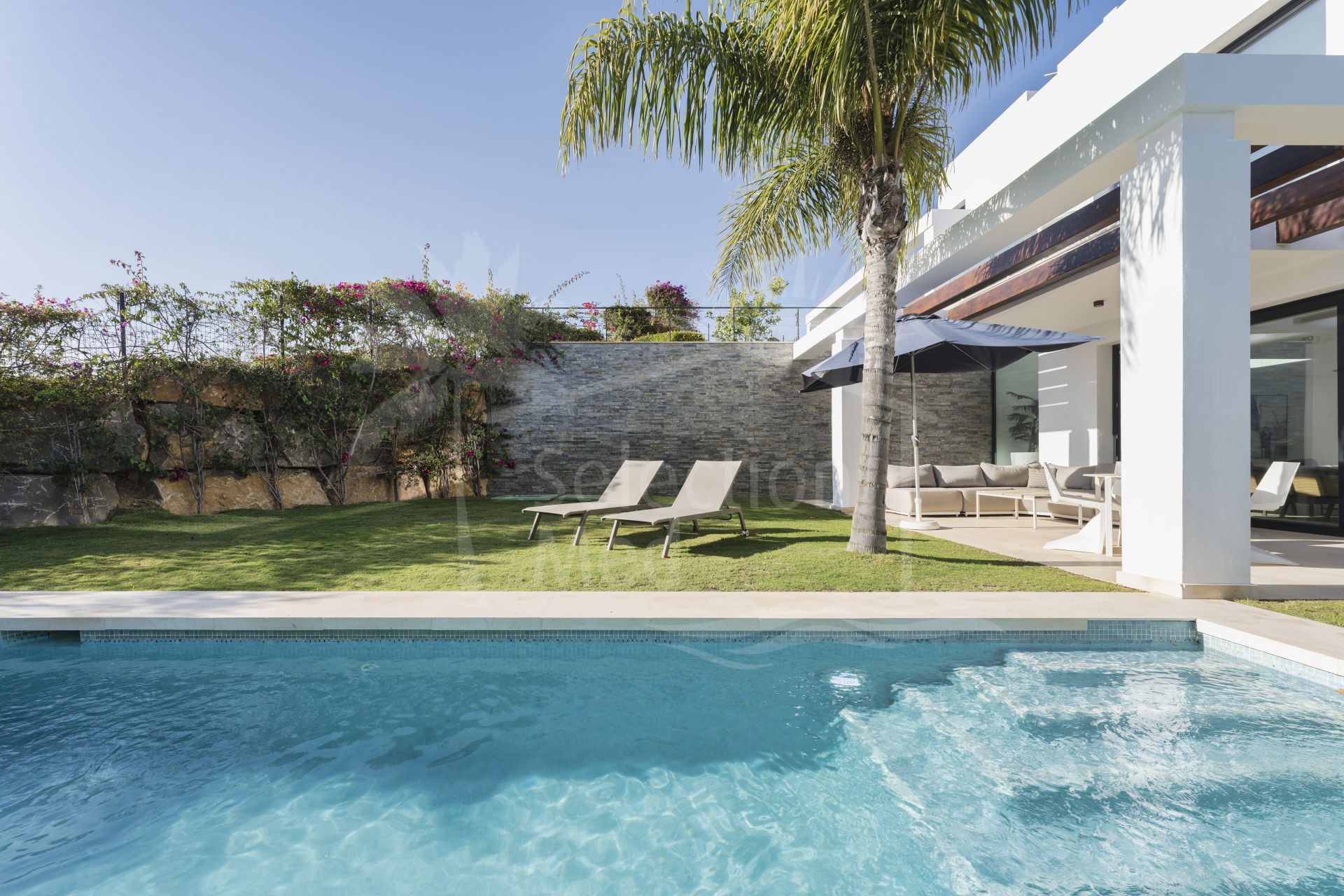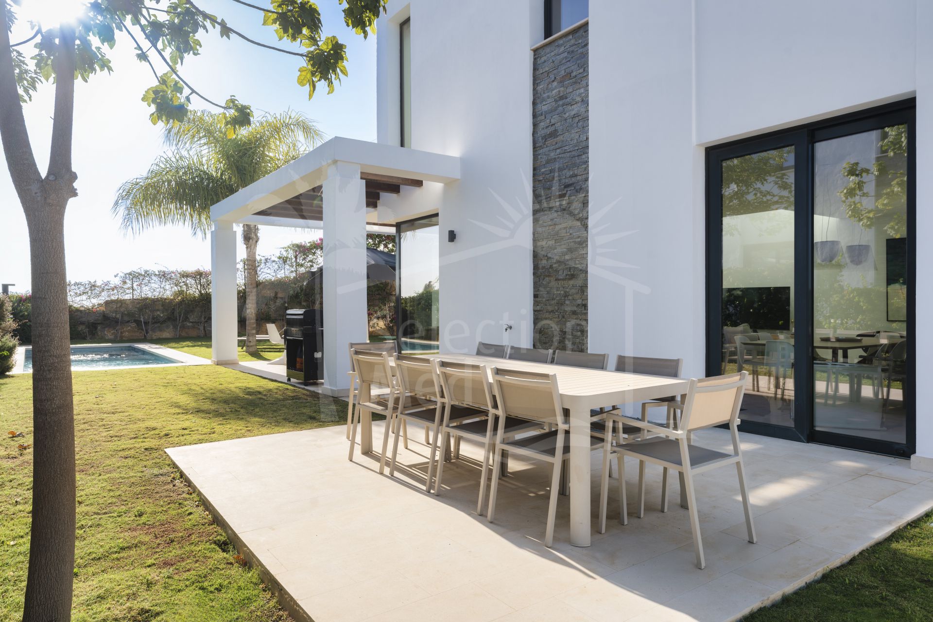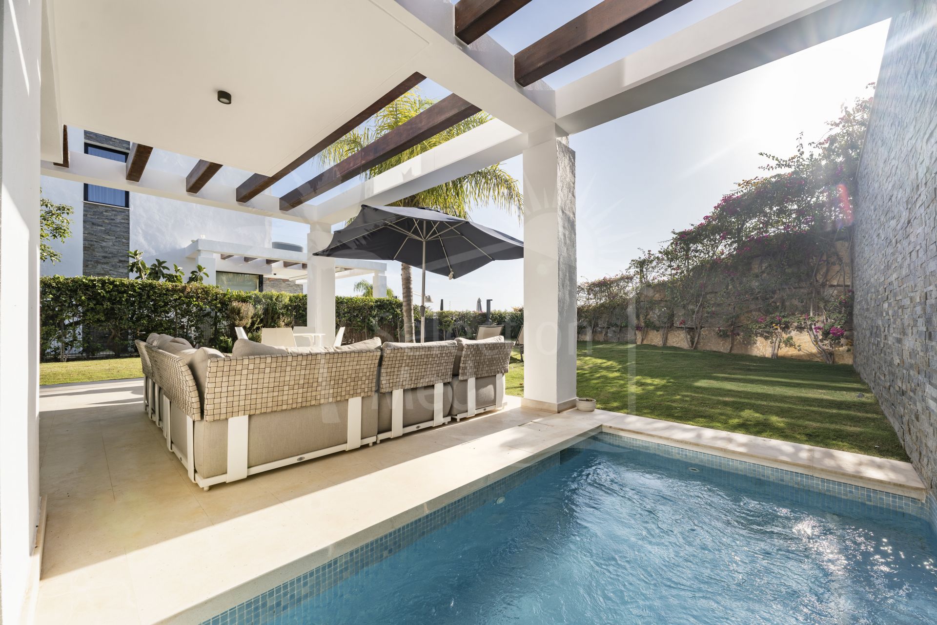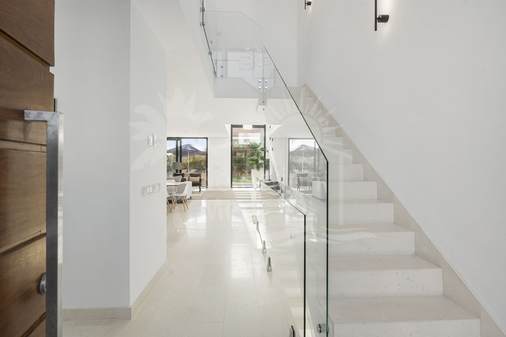 Villa à vendre à Cabopino, Marbella Est avec 5 chambres, 3 salles de bains, 4 toilets, construit à 2020 et a piscine (privé), garage (privé) et jardin (privé). Dimensions: 310m² construit et 360m² parcelle.