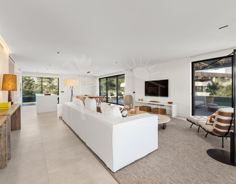 Villa à vendre à La Reserva, Sotogrande avec 5 chambres, 5 salles de bains. Dimensions: 680m² construit et 2305m² parcelle. Cette propriété dispose des commodités suivantes: salle de cinéma, climatisation, proche des écoles, entièrement meublé, vue mer, cuisine entièrement adaptée, pièce...