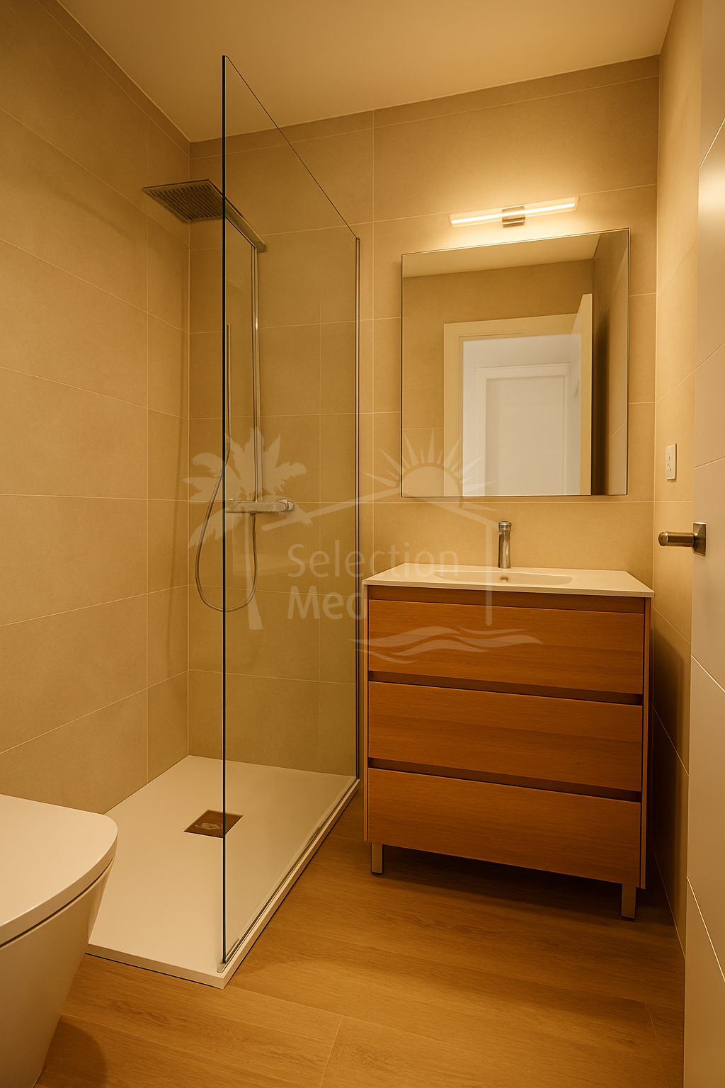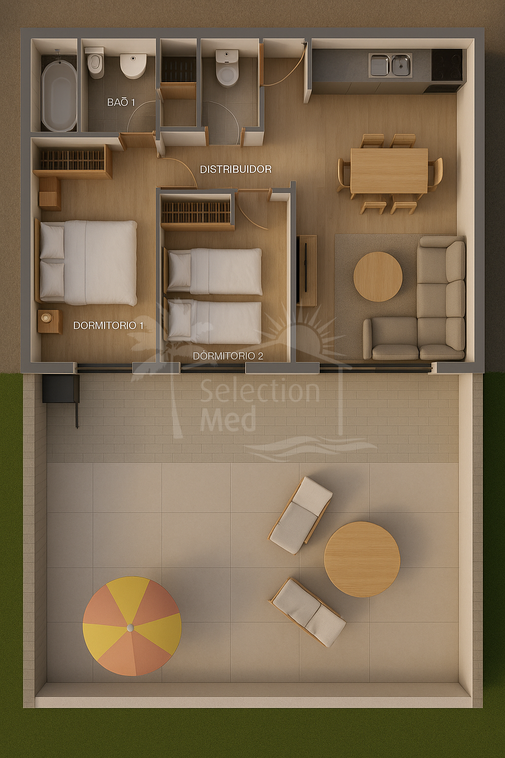 Avec 55 m2 construit, le logement offre une distribution confortable et fonctionnelle: deux chambres, deux salles de bains complètes, cuisine entièrement équipée, armoires intégrées et climatisation. Idéal à la fois comme résidence habituelle et investissement de saison.