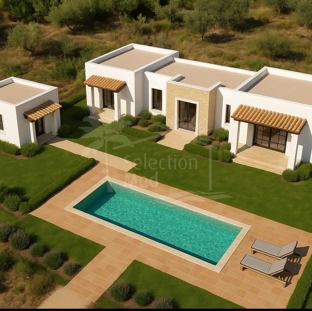 Le projet approuvé prévoit la construction d’une résidence principale avec trois chambres et deux salles de bains, ainsi qu’une maison d’invités indépendante comprenant une chambre et une salle de bains, pour un total de quatre chambres. La résidence principale dispose de deux salles de bains en suite, d’une salle de bains supplémentaire et de toilettes, offrant confort et fonctionnalité pour toute la famille et les invités. La surface construite prévue est de 224 m², répartie de manière efficace afin de maximiser le confort et la luminosité des espaces.