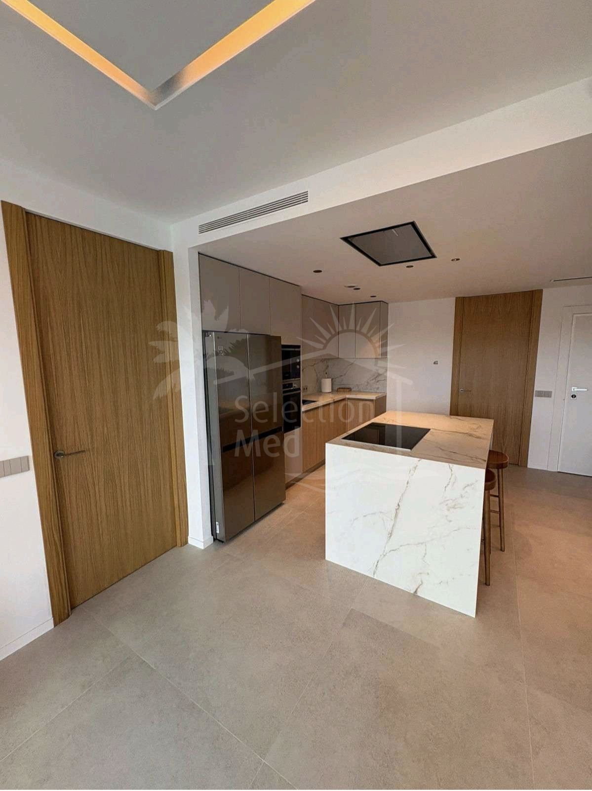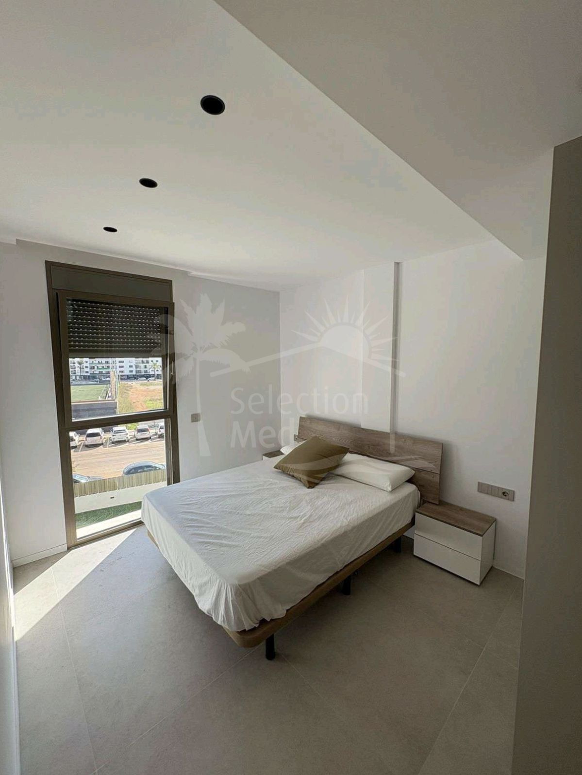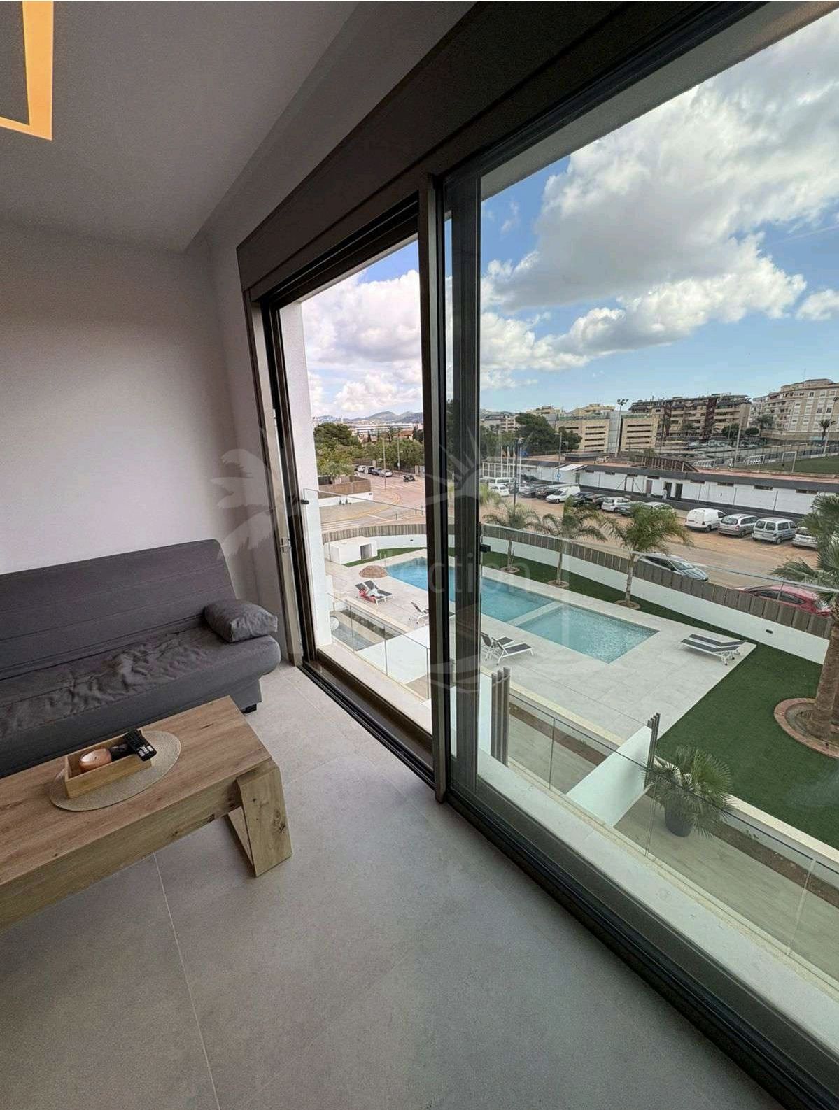 Le logement a une surface construite de 124 m2, dont 84,84 m2 correspondent à l'intérieur et 49,05 m2 à une grande terrasse privée, idéale pour profiter du climat méditerranéen et vue sur le jardin, la piscine et la ville. L'appartement dispose de trois chambres avec placards, deux salles de bains complètes (l'une en suite) et une cuisine entièrement équipée, ainsi qu'un lavabo pratique. Il est livré entièrement mobilisé et avec des finitions de haute qualité.