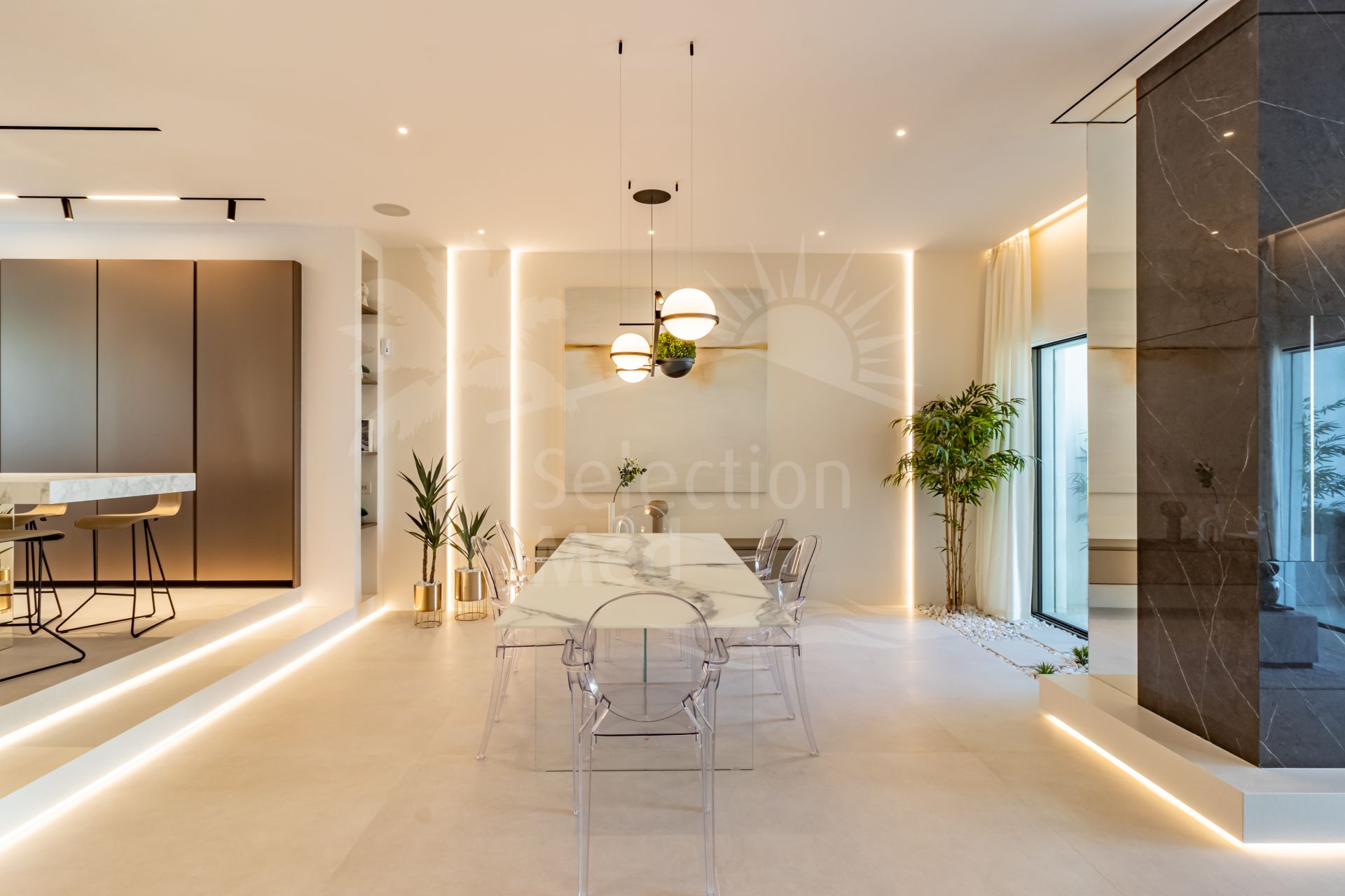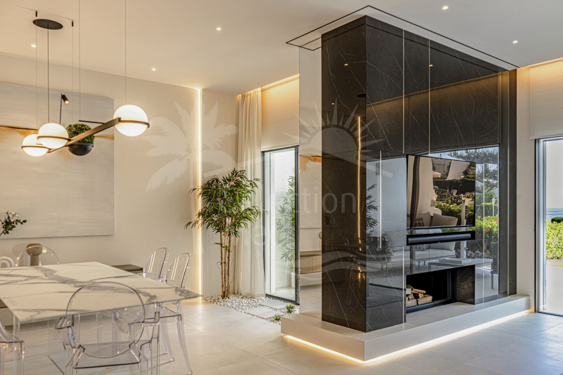 En entrant, vous êtes accueilli par un hall menant à une cuisine ultramoderne. Cet espace dispose d’un îlot central et est entièrement équipé d’appareils électroménagers de la plus haute qualité. Le spacieux salon-salle à manger, baigné de lumière naturelle, offre un cadre confortable pour se détendre ou recevoir, rehaussé par la chaleur d’une cheminée accueillante.