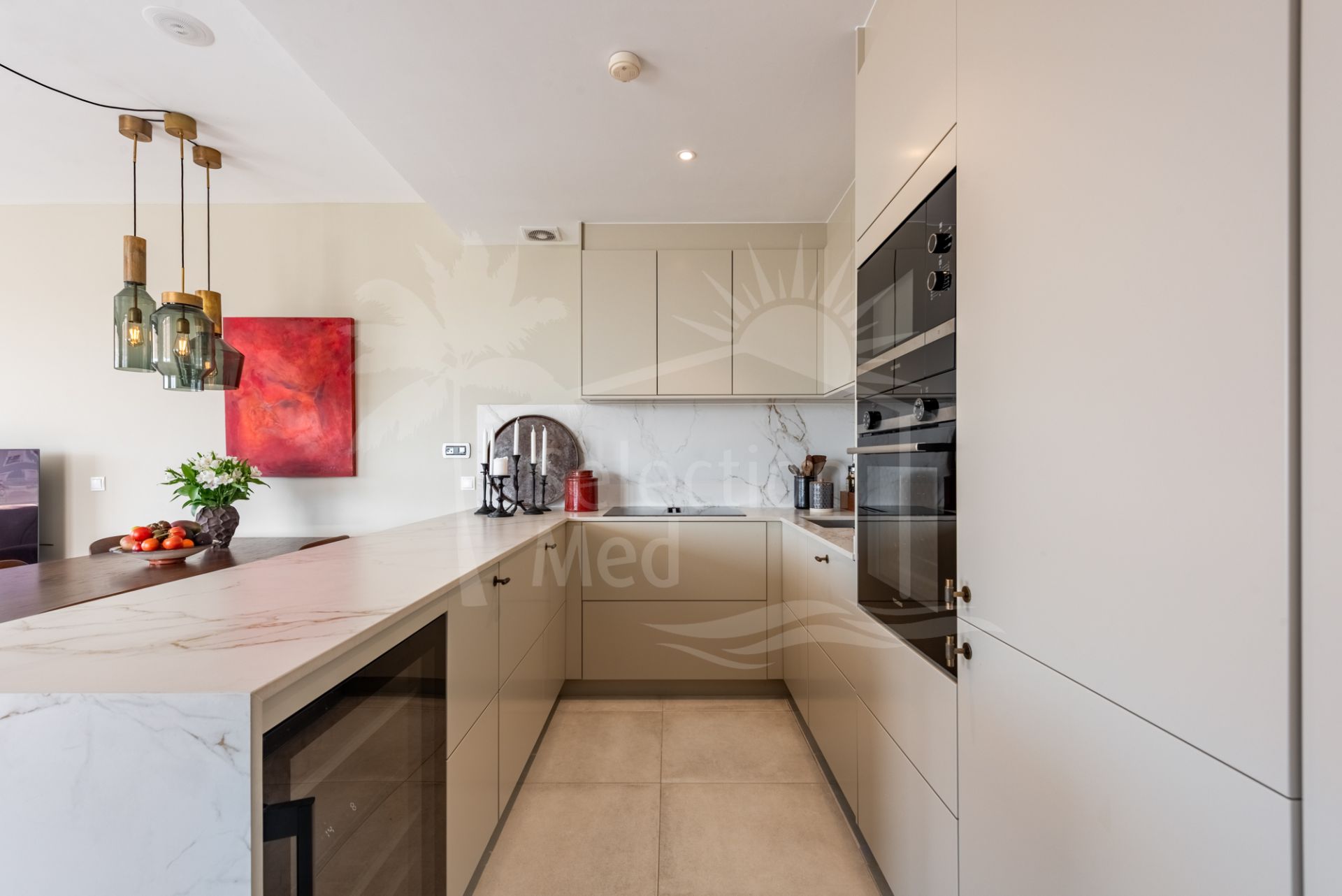 L’appartement s’étend sur deux niveaux. Le rez-de-chaussée accueille un hall d’entrée menant à une élégante pièce de vie ouverte composée d’un séjour, d’une salle à manger et d’une cuisine Ballingslöv sur-mesure. De là, de larges baies vitrées s’ouvrent sur une vaste terrasse aménagée avec espaces repas et salon, idéale pour profiter de la vie en plein air. Les deux terrasses disposent de stores électriques et manuels, offrant ombre et confort tout au long de la journée.