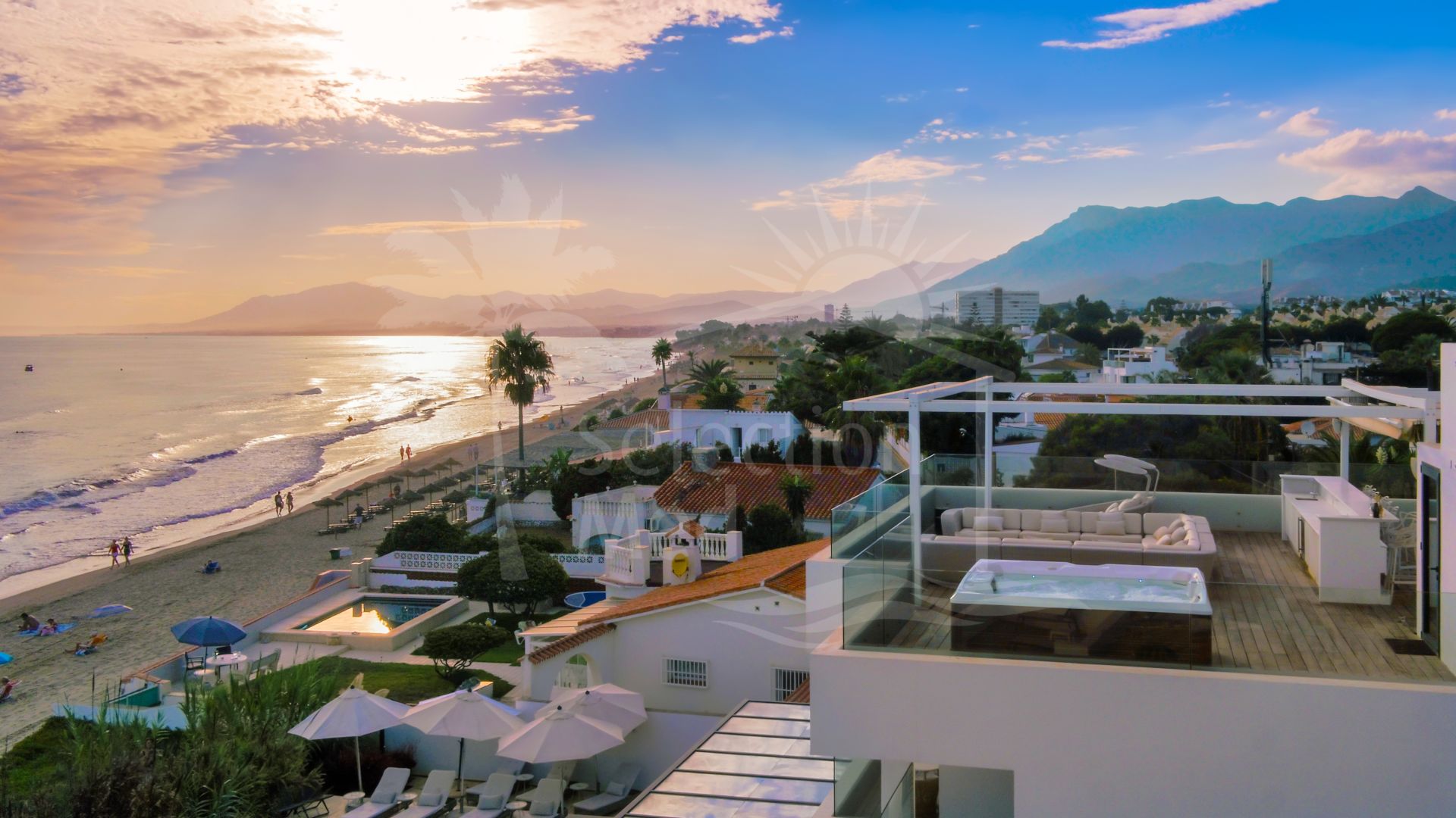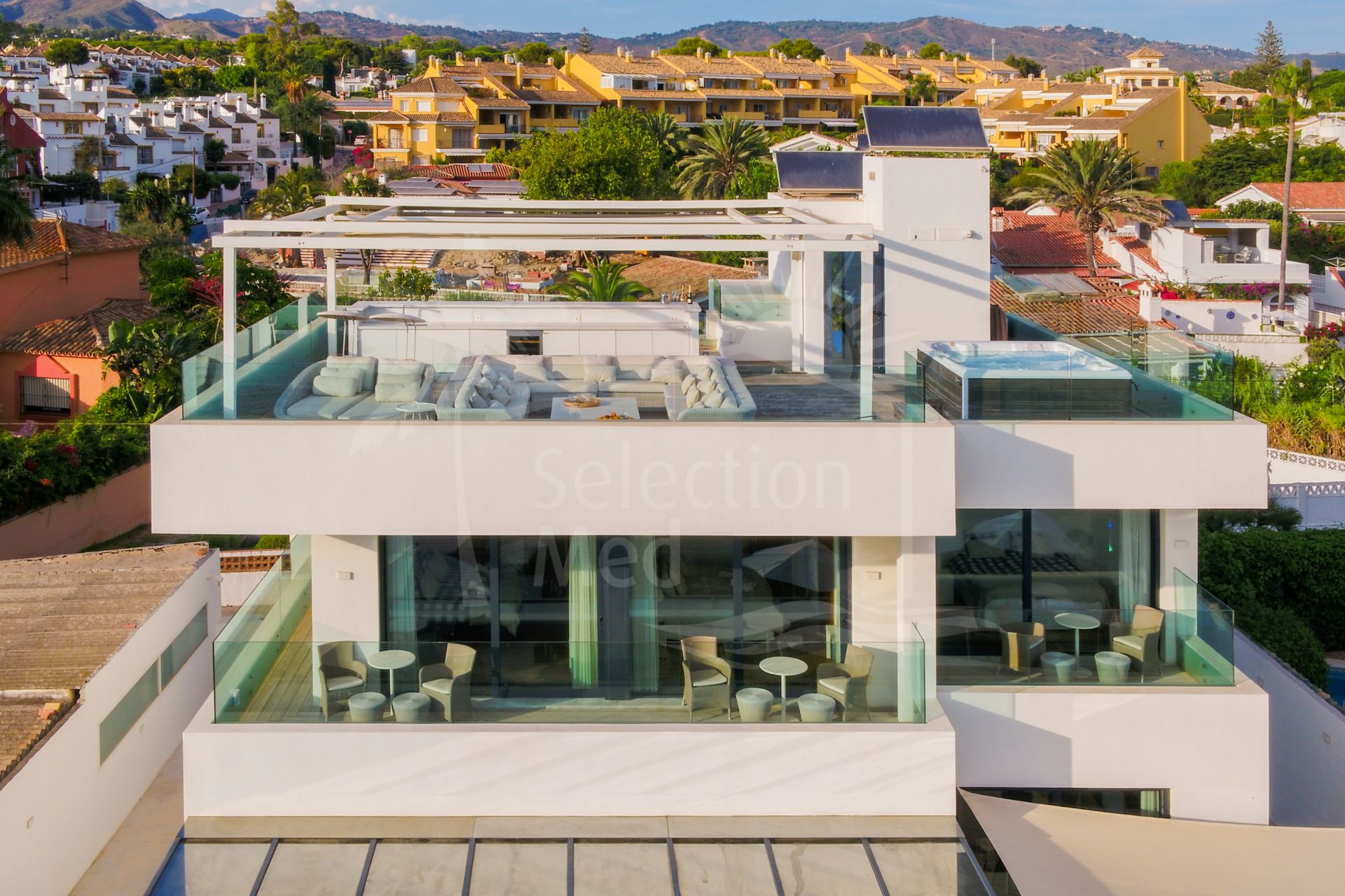 Cette superbe propriété, orientée sud-est, offre une vue panoramique sur la mer et des couchers de soleil à couper le souffle, combinant un design moderne avec les plus hauts standards de qualité et de confort. Au rez-de-chaussée, un élégant hall d'entrée double hauteur mène à un spacieux salon-salle à manger avec de grandes fenêtres donnant sur la mer, relié à une cuisine ouverte entièrement équipée avec des appareils de pointe. Ce niveau comprend également une chambre et une salle de bains entièrement équipée. Depuis le salon, il y a un accès direct à la terrasse principale, qui dispose d'une piscine chauffée à l'eau salée, d'un coin repas extérieur et de canapés pour se détendre. Un sentier privé traverse les dunes et mène directement à la plage, assurant intimité et exclusivité. À l'étage inférieur, la villa dispose d'un espace bien-être avec sauna et baignoire relaxante, d'une spacieuse buanderie, d'une salle de bains entièrement équipée et de deux chambres avec lumière naturelle. Le premier étage comprend trois chambres offrant une vue impressionnante sur la mer et un accès direct à la terrasse. L'une des deux salles de bains de ce niveau est particulièrement grande et a également accès à la terrasse, qui dispose d'un coin salon et salle à manger pour profiter de la vue spectaculaire. Enfin, l'étage supérieur abrite un magnifique toit solarium avec jacuzzi, espace de détente, tables et chaises, et une vue panoramique à 360° sur la mer et les montagnes. En outre, la propriété est équipée de chauffage au sol dans l'ensemble, panneaux solaires, climatisation centralisée, un système de son sans fil, éclairage LED, et un système d'irrigation automatique dans les zones extérieures. Il y a également un espace de stationnement extérieur pour jusqu'à cinq voitures, offrant un maximum de confort et de commodité. Une villa vraiment unique qui combine luxe, technologie et un emplacement privilégié en bord de mer, offrant un style de vie inégalé par la mer à Marbella.