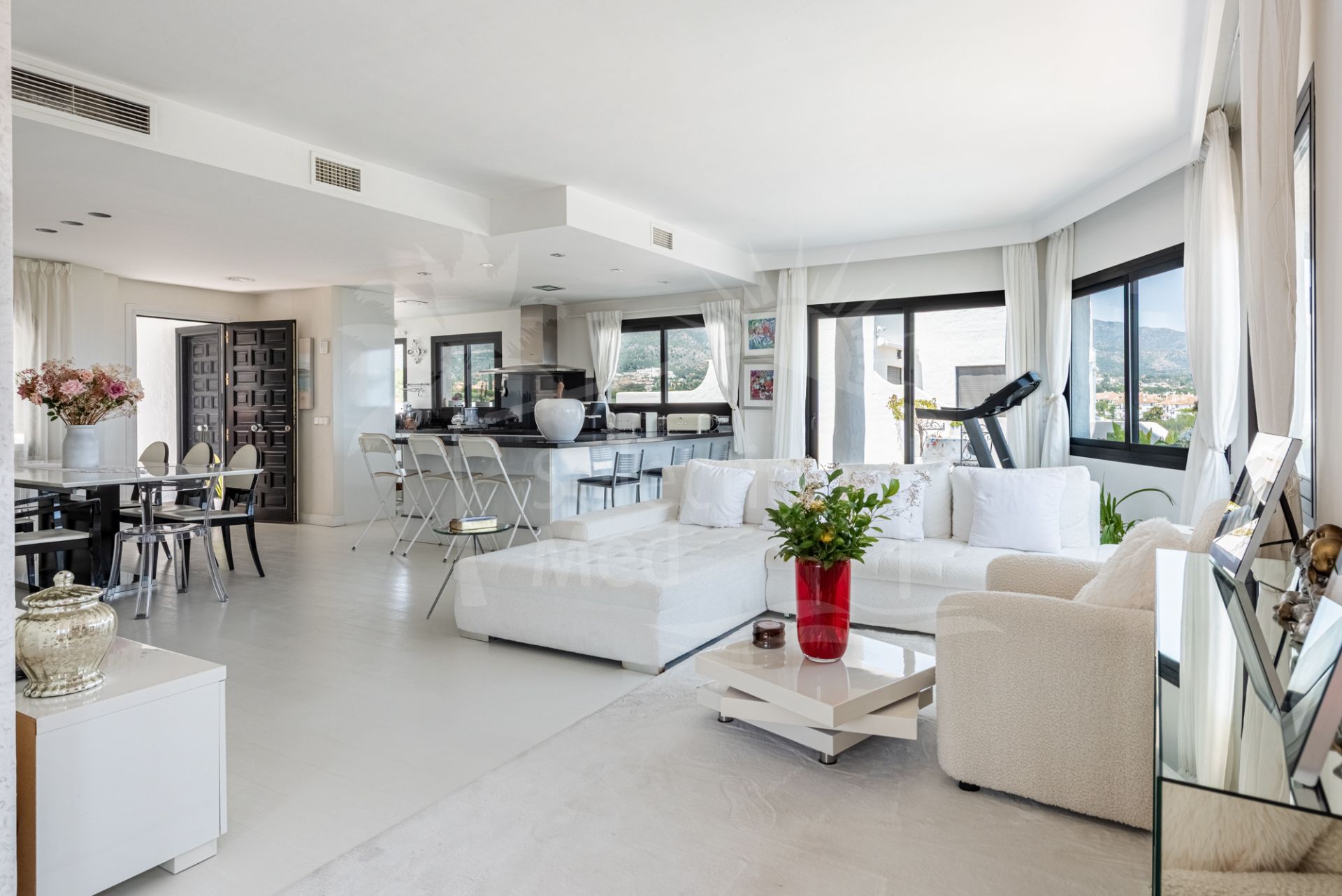 Cet exceptionnel penthouse est situé dans le prestigieux complexe Coto Real, sur le très convoité Golden Mile de Marbella, et se distingue par ses vues panoramiques véritablement spectaculaires. Depuis chaque recoin de la propriété, on peut profiter de vues ininterrompues sur la mer Méditerranée, la montagne emblématique de La Concha et les environs verdoyants de Lomas de Marbella Club. L’orientation et la position surélevée de l’appartement offrent une combinaison rare d’intimité, de tranquillité et de beauté naturelle.