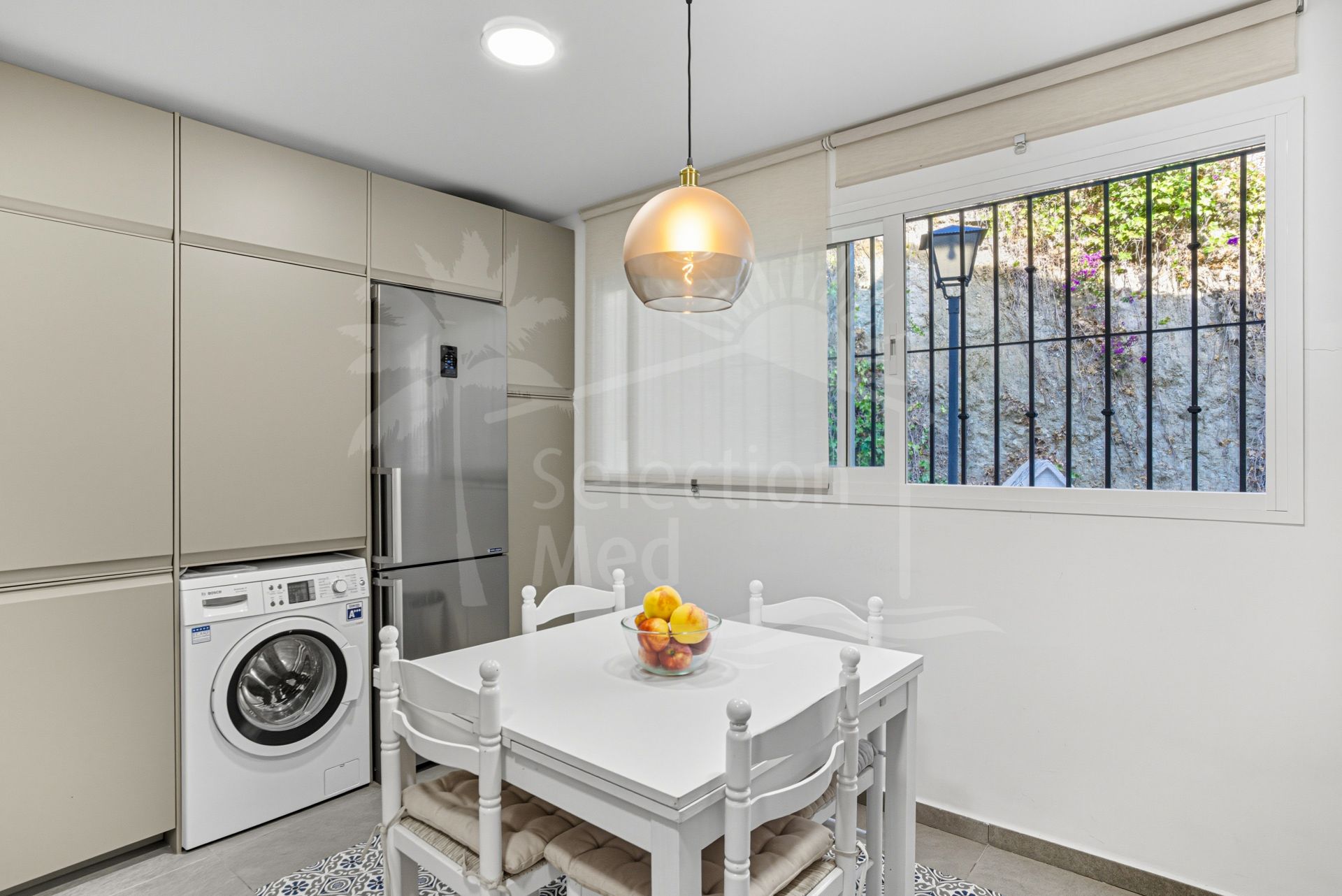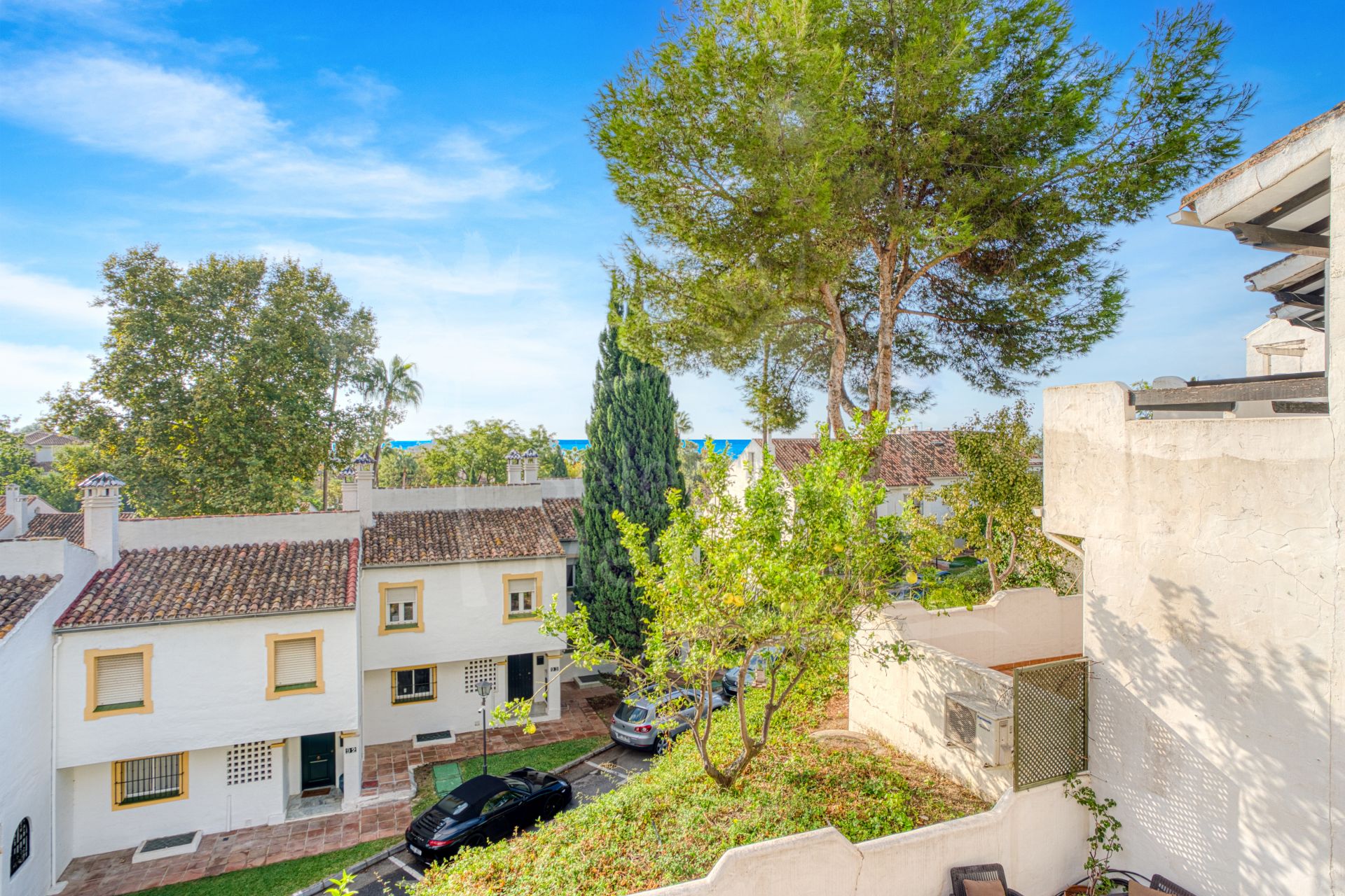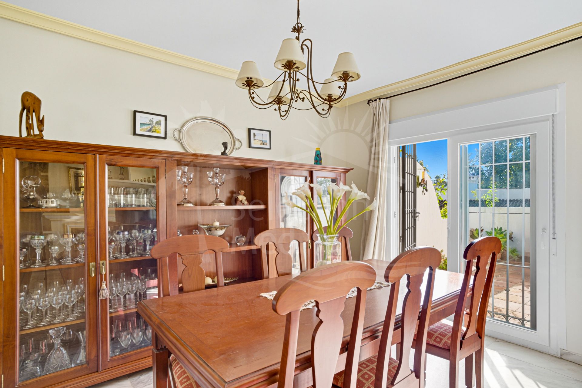 Cette charmante maison de ville de trois chambres, orientée sud, est située dans la célèbre communauté fermée d'El Capricho sur le Golden Mile de Marbella, offrant de vastes jardins tropicaux et deux piscines communes. Idéalement situé à distance de marche de la plage, des bars et des restaurants, et à quelques minutes en voiture de Marbella Center et Puerto Banús, l'établissement allie confort et charme. Le rez-de-chaussée dispose d'un salon et d'un coin repas lumineux avec cheminée et accès à une terrasse généreuse parfaite pour les repas en plein air, une cuisine séparée récemment rénovée, et une toilette invités. Les escaliers mènent à un grand sous-sol actuellement utilisé comme chambre et studio d'art avec sa propre salle de bains. A l'étage, la suite parentale est accompagnée de deux chambres d'hôtes et d'une salle de bains familiale. Les autres points forts comprennent des placards, des sols en marbre et un parking privé pour une voiture.
