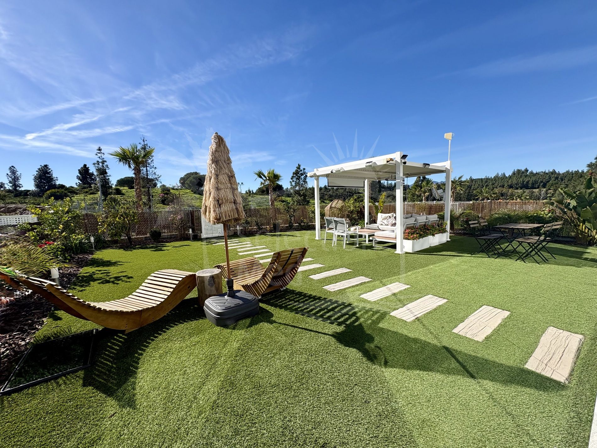 Les trois chambres ont un accès direct à la terrasse et au jardin. La chambre principale dispose d'une salle de bains privative, tandis que les deux chambres supplémentaires partagent une deuxième salle de bains. Une buanderie séparée est idéalement située dans le couloir.