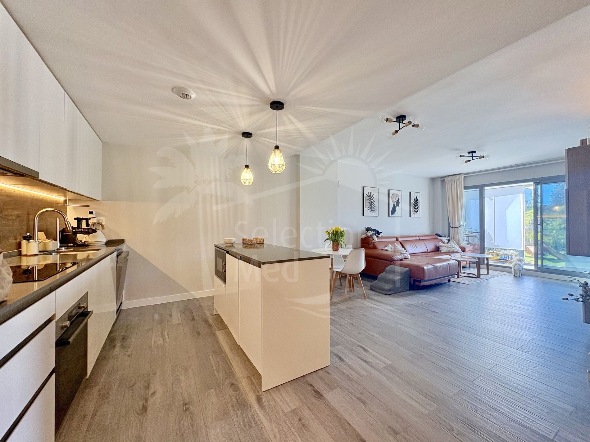 L'appartement est orienté sud-ouest et situé au rez-de-chaussée, offrant un espace de vie lumineux et spacieux. La cuisine moderne, entièrement équipée, dispose d'une île centrale et s'ouvre en toute transparence sur une grande terrasse, qui peut être fermée et est équipée de la climatisation. La terrasse est prolongée par un généreux jardin privé avec vue sur la nature ouverte, créant un espace de vie intérieur-extérieur parfait.