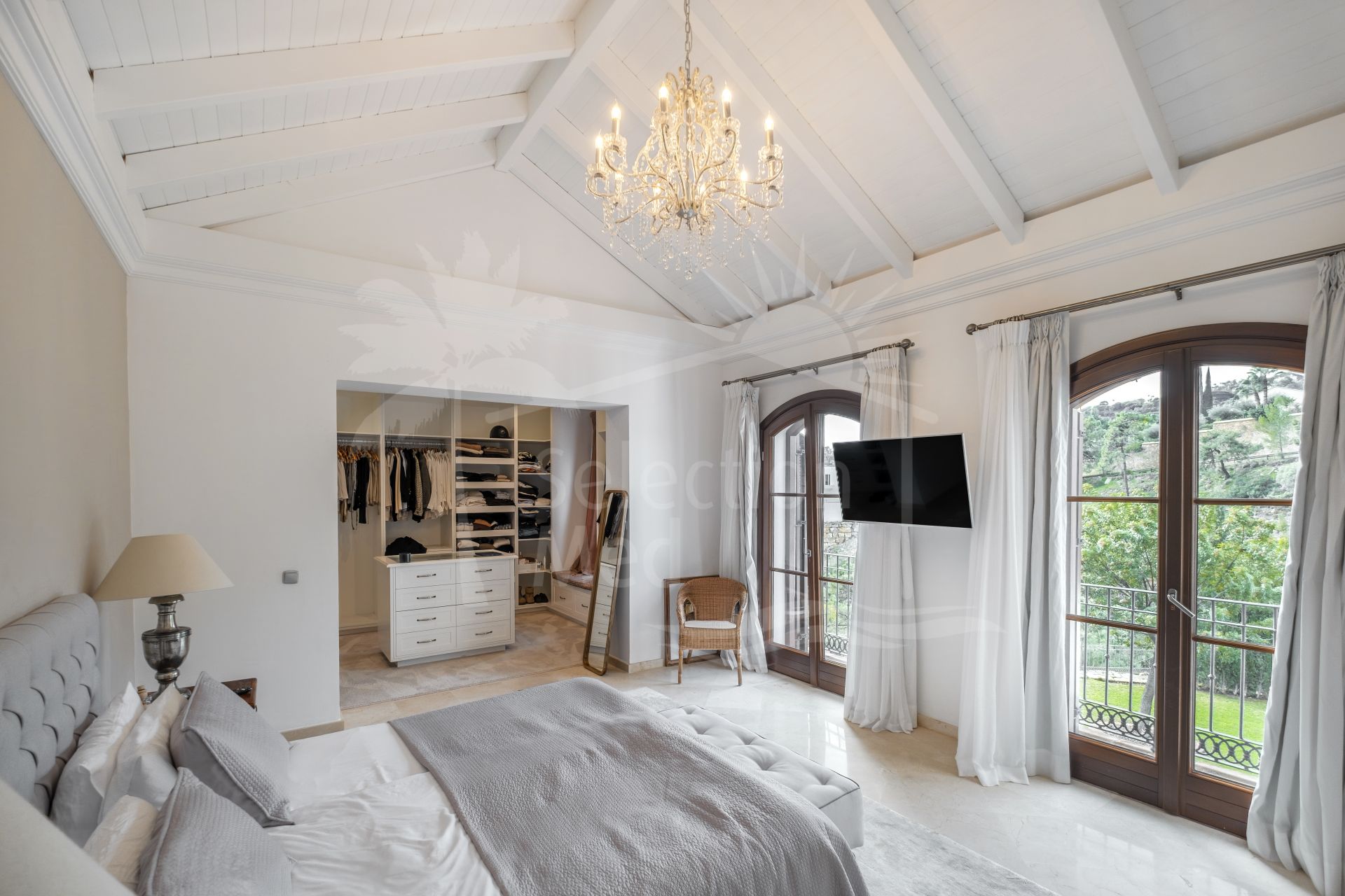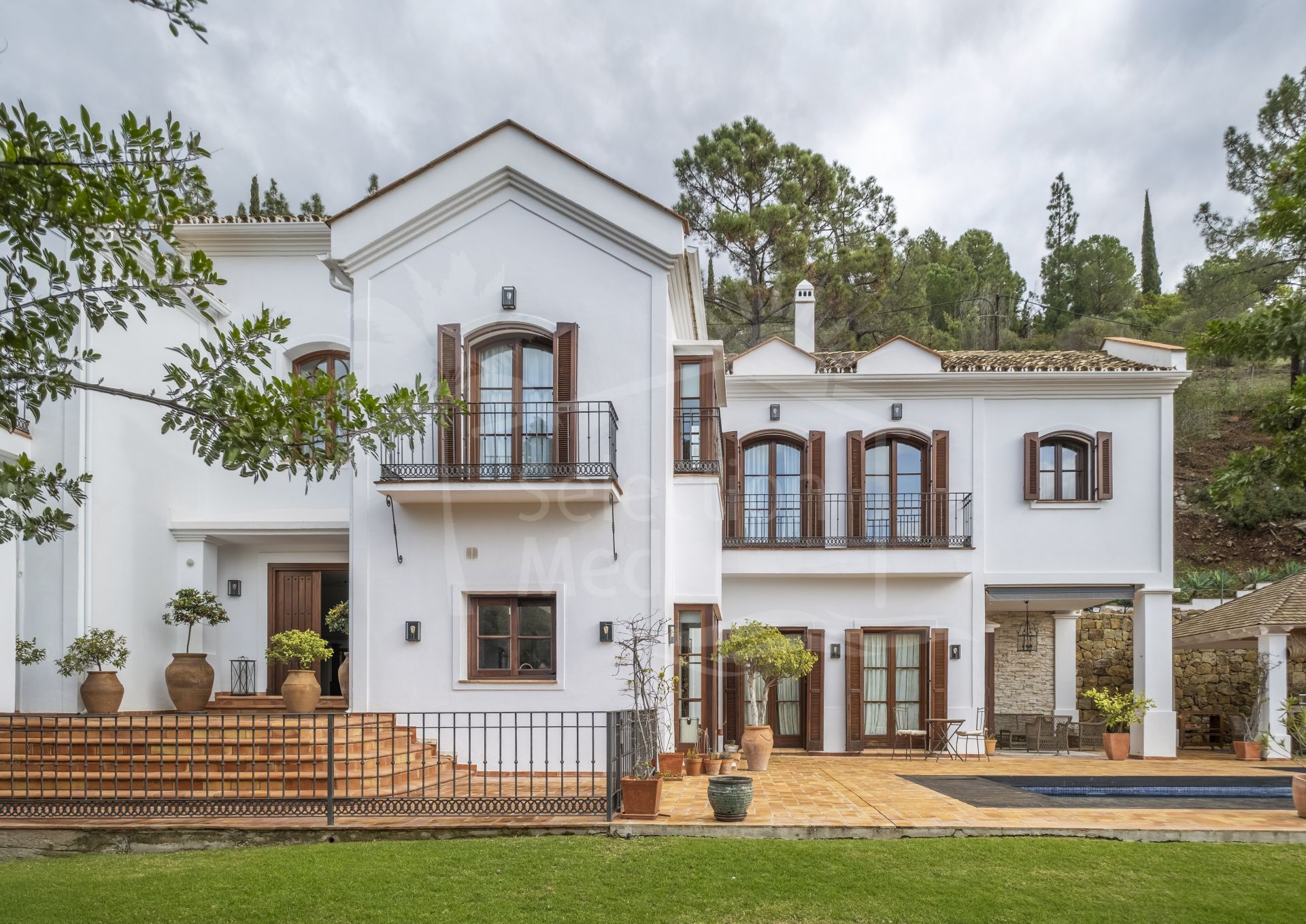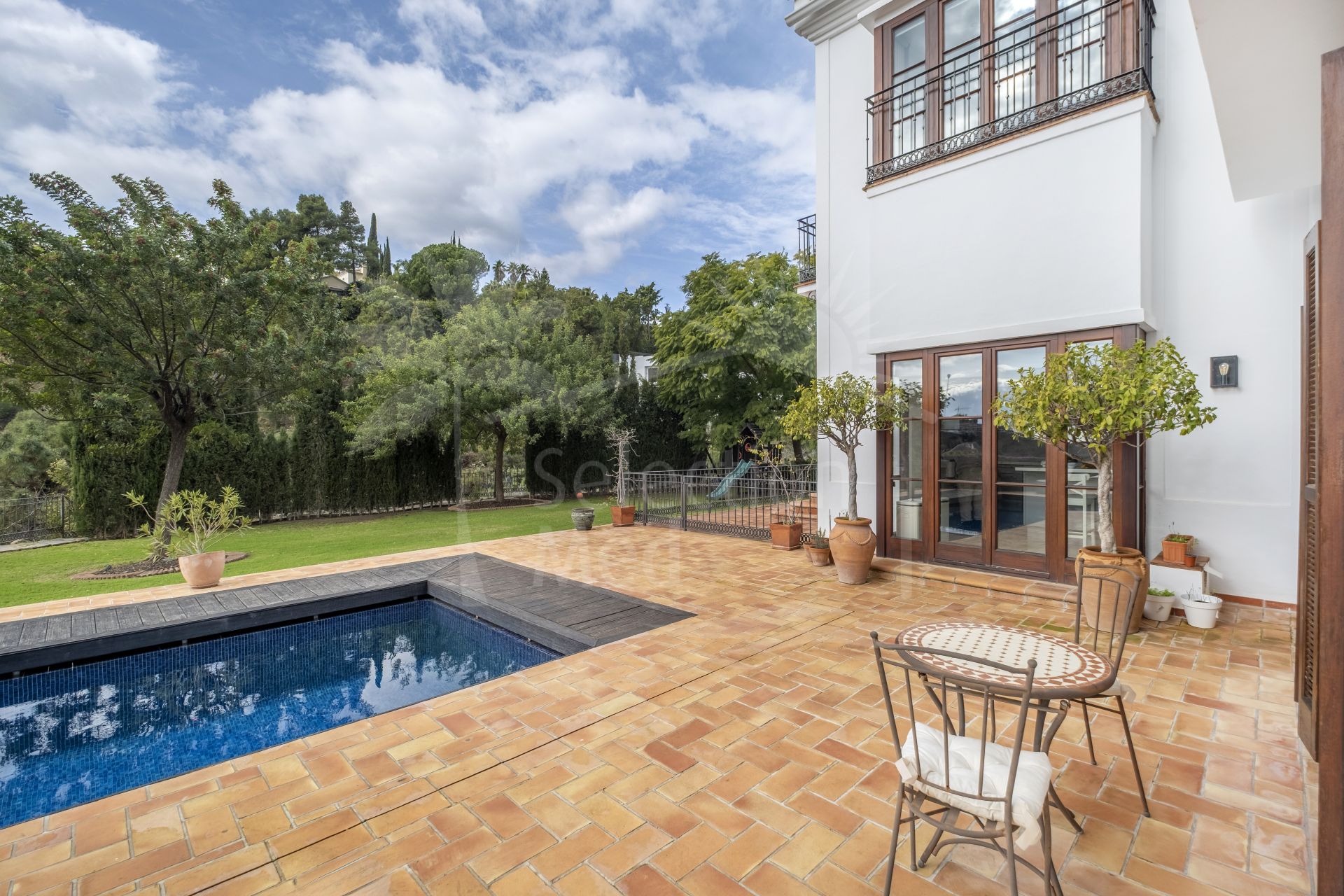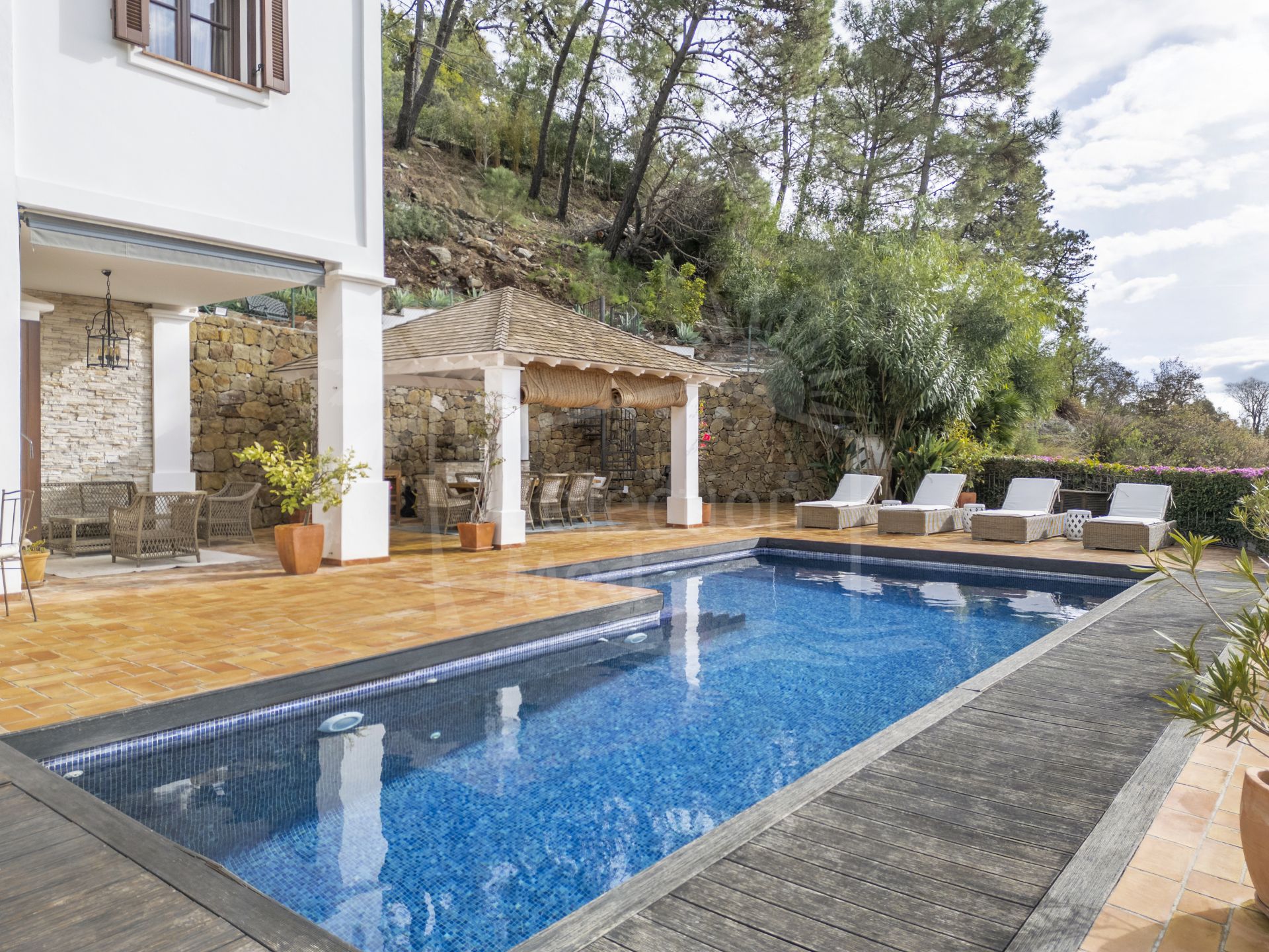 La villa allie charme espagnol traditionnel avec confort moderne bois naturel, marbre et finitions en pierre, chauffage au sol et appareils Miele. A l'extérieur, profitez de vastes terrasses, d'un grand jardin et d'un espace piscine serein avec vue panoramique.