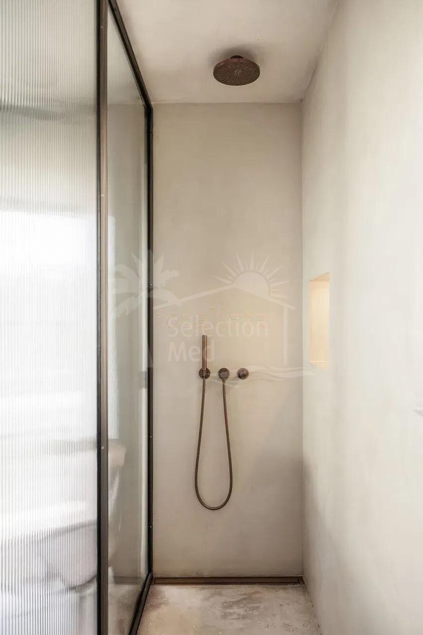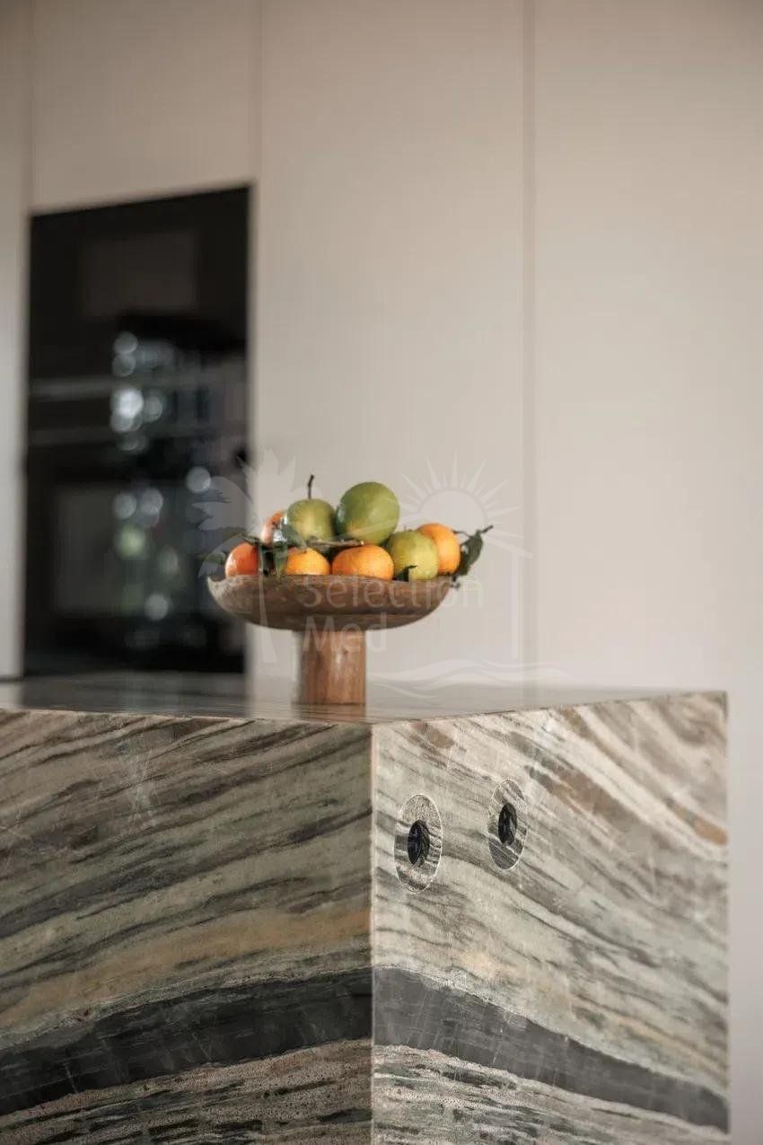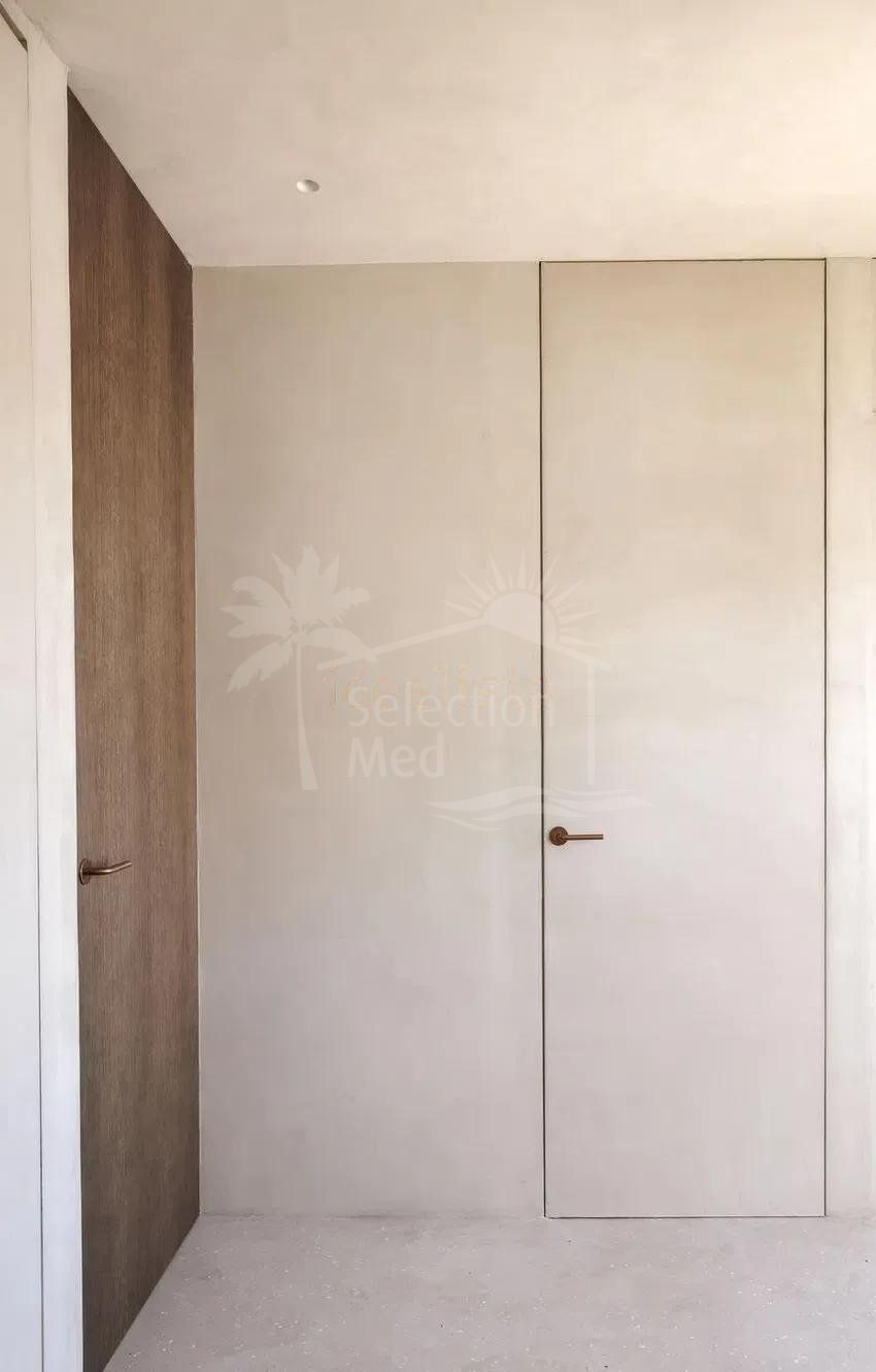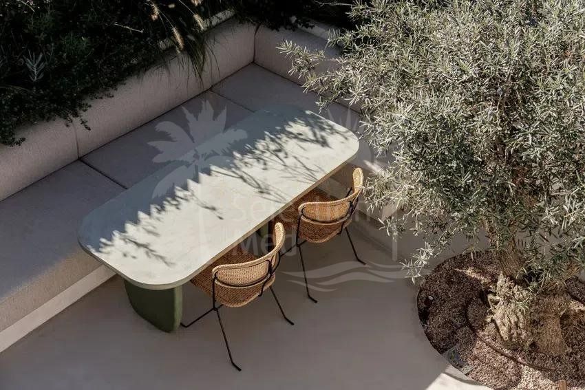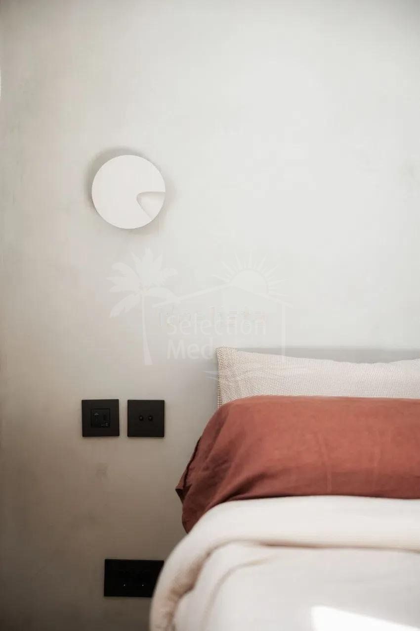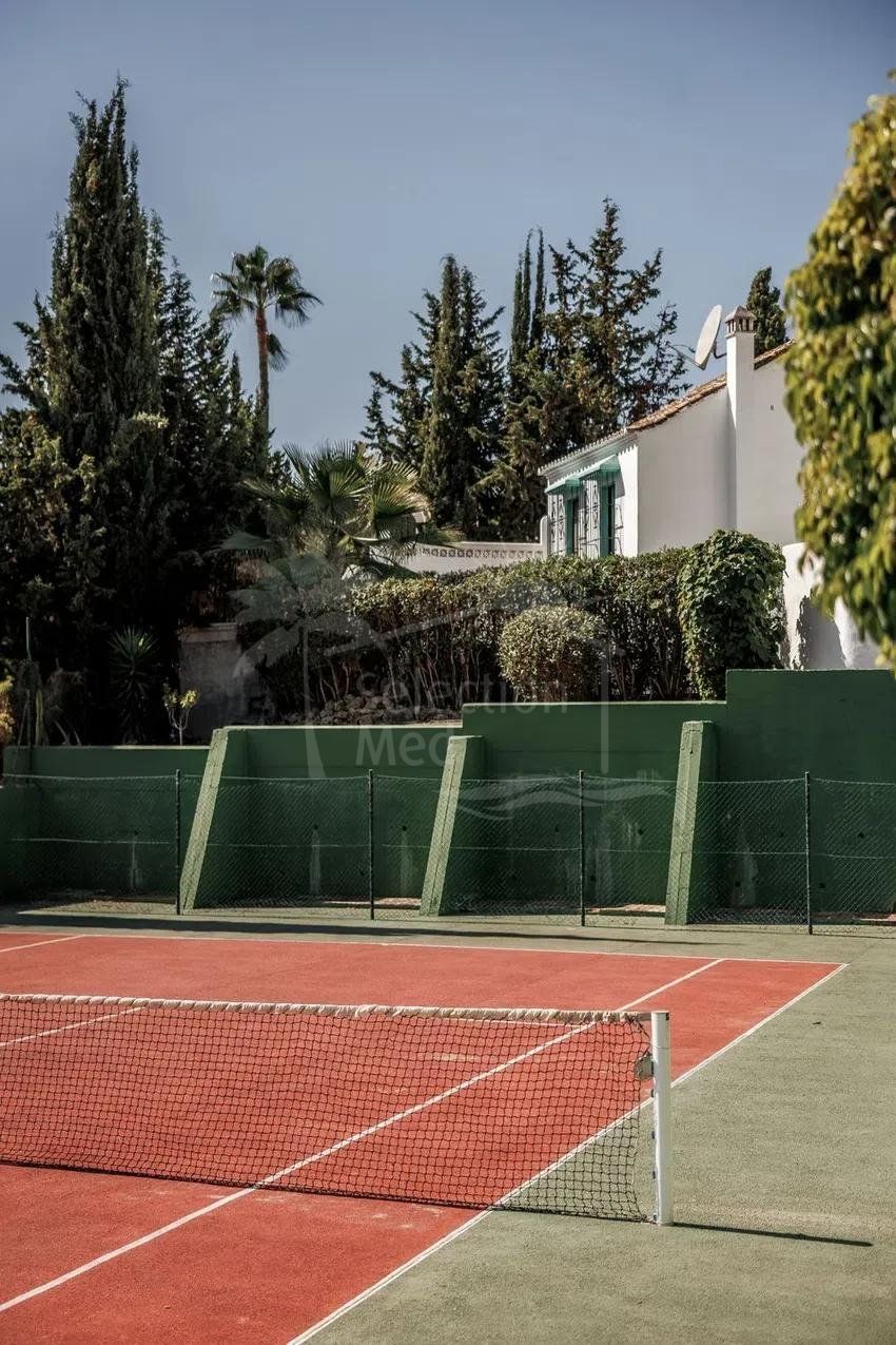 À l’étage, deux grandes chambres doubles, chacune avec salle de bains privative. Les balcons de style français offrent une excellente luminosité naturelle et de jolies vues : l’un sur la montagne de La Concha, l’autre sur les jardins communautaires soigneusement entretenus et ornés de bougainvilliers. En complément, la maison dispose d’un parking fermé au sein du complexe.