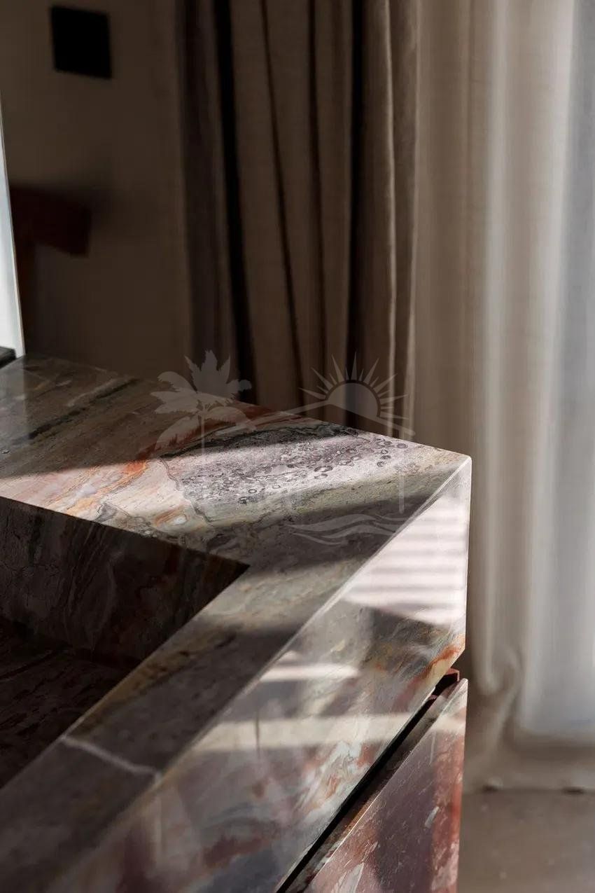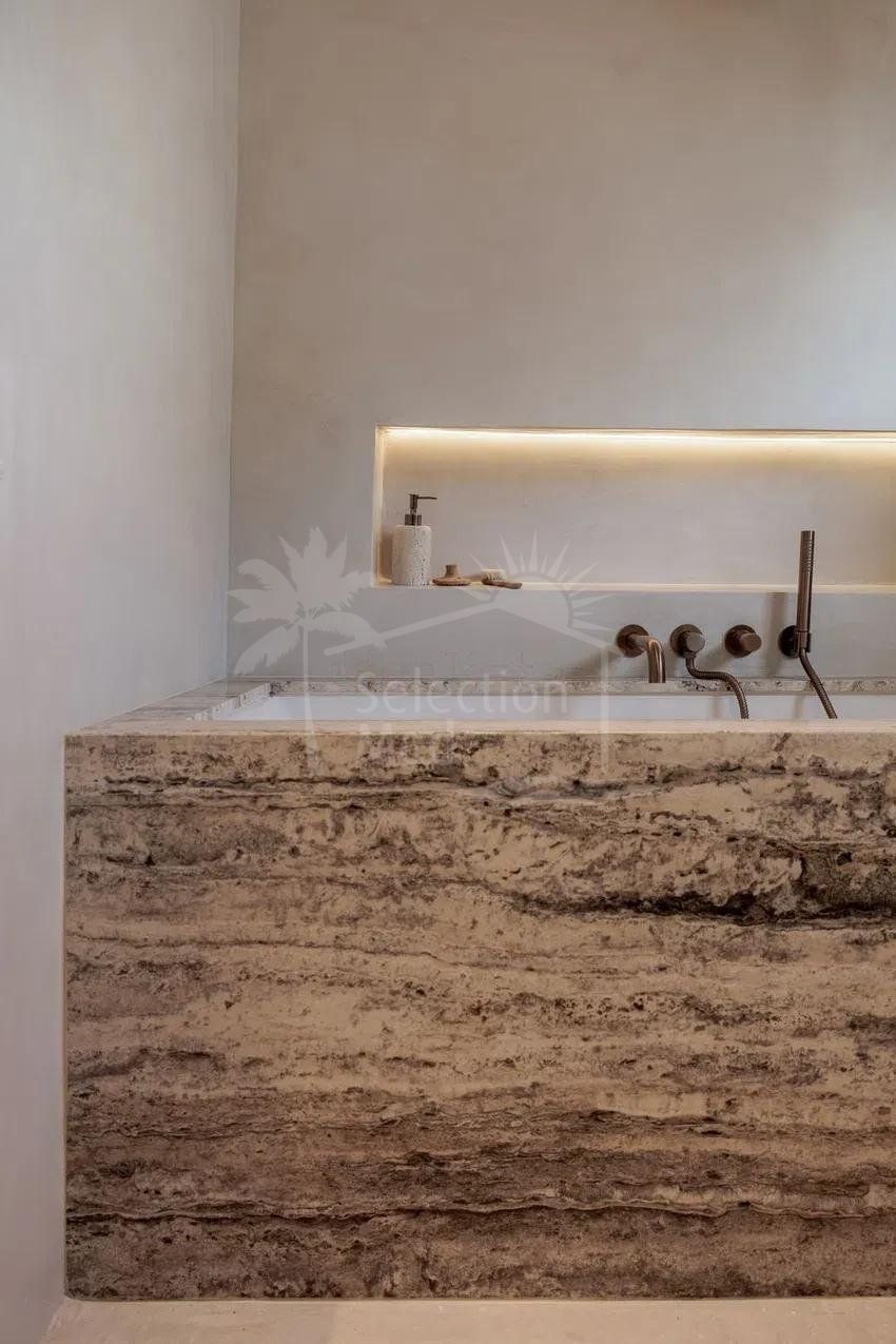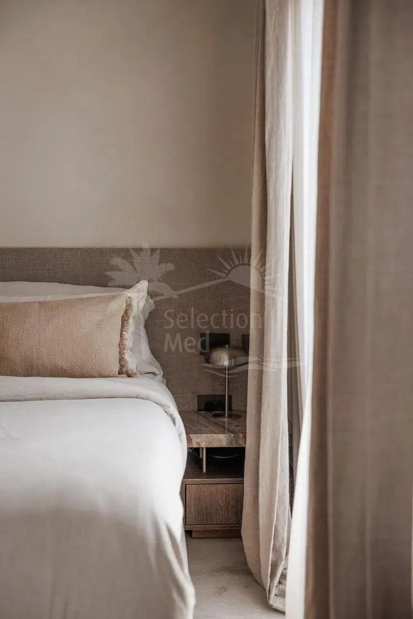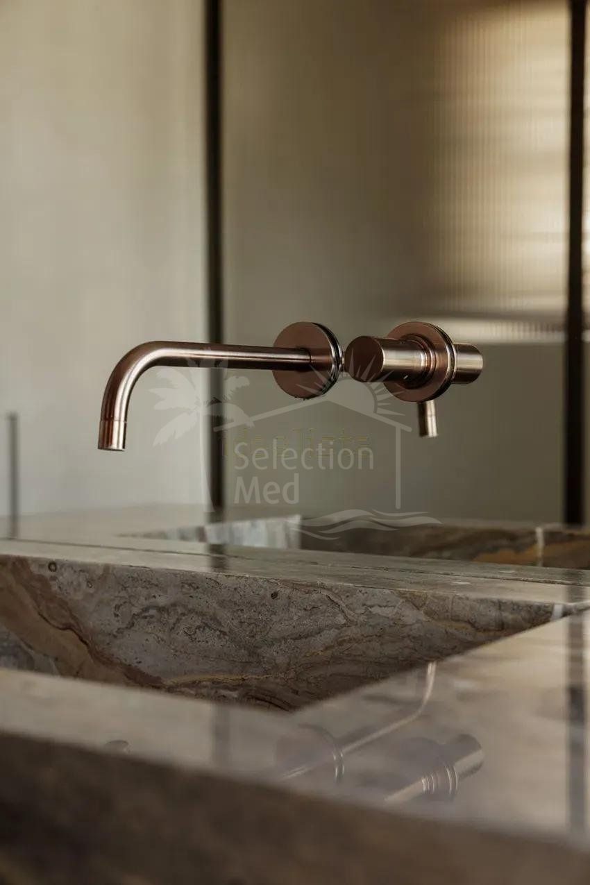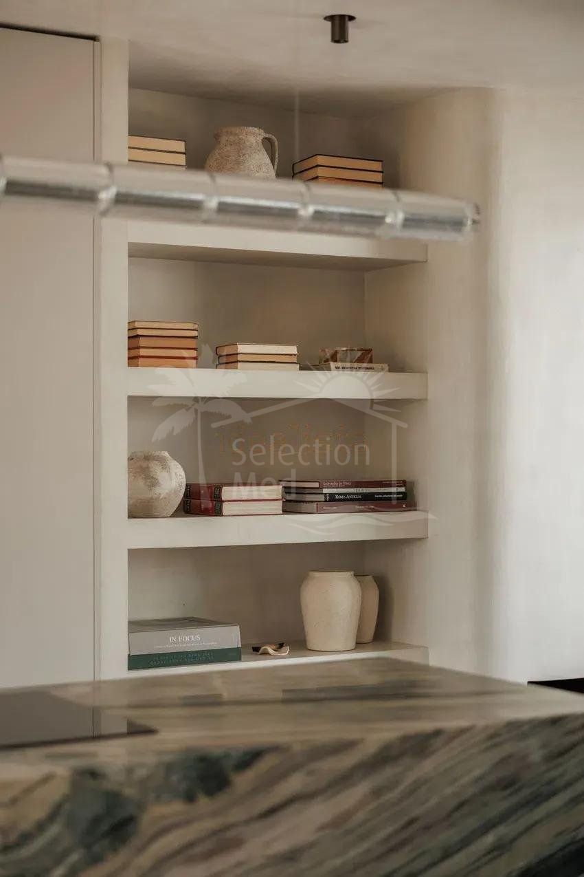 À l’étage, deux grandes chambres doubles, chacune avec salle de bains privative. Les balcons de style français offrent une excellente luminosité naturelle et de jolies vues : l’un sur la montagne de La Concha, l’autre sur les jardins communautaires soigneusement entretenus et ornés de bougainvilliers. En complément, la maison dispose d’un parking fermé au sein du complexe.