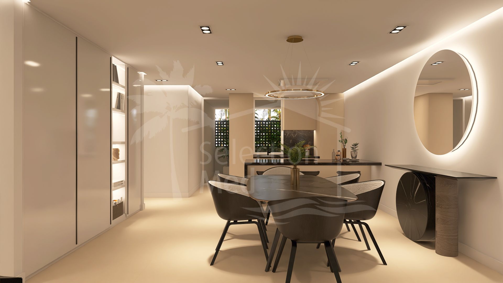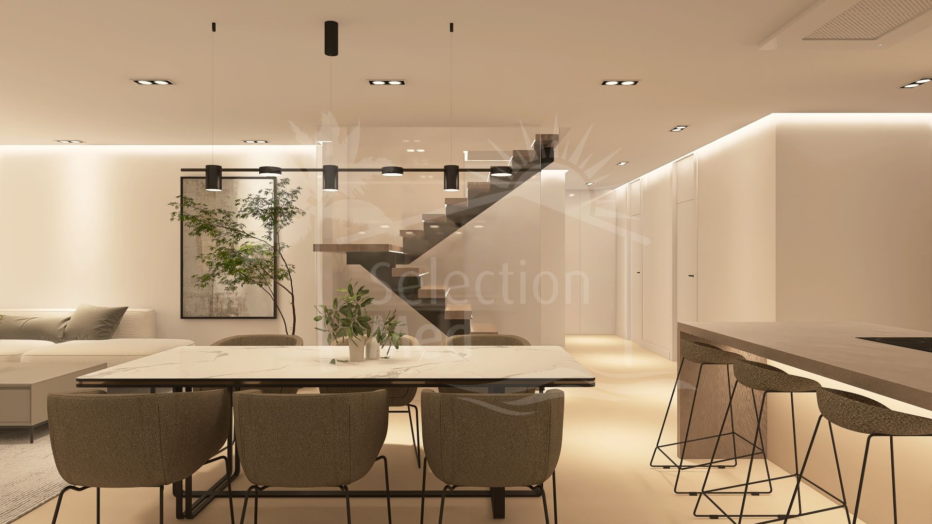 Cet appartement en duplex de style villa de 5 chambres a la cuisine, la buanderie et le salon à l'étage supérieur, où il y a aussi une chambre principale avec salle de bains privative, et une deuxième chambre et salle de bains invités. Le salon et la chambre principale ont accès directement à la grande terrasse avec piscine.