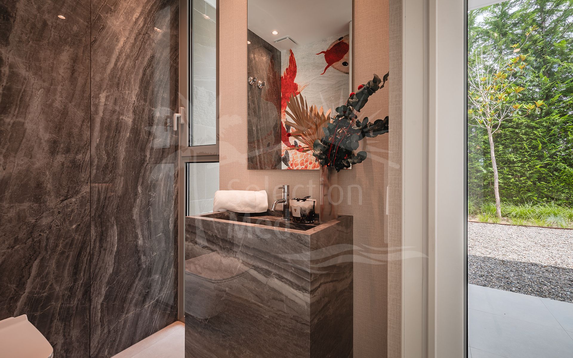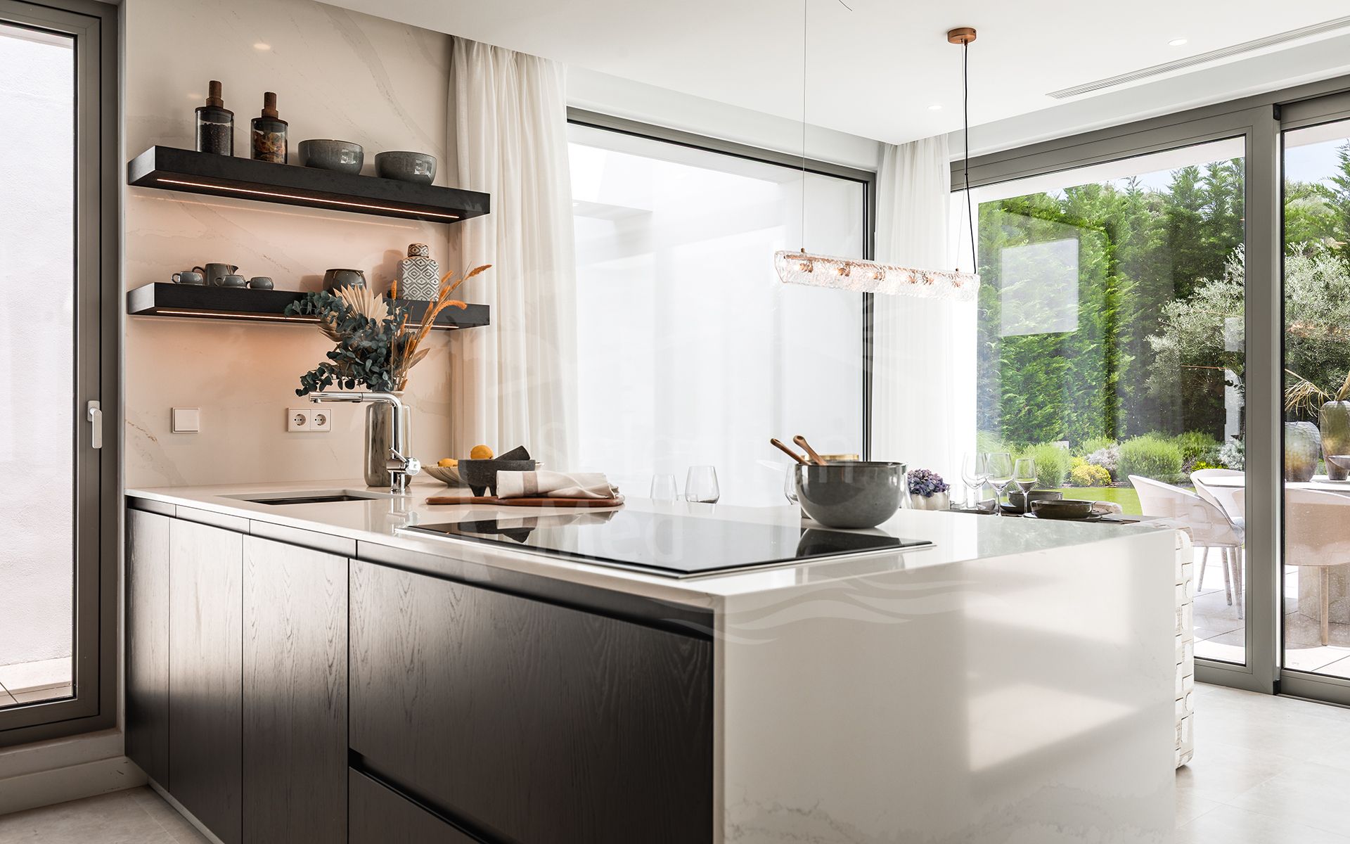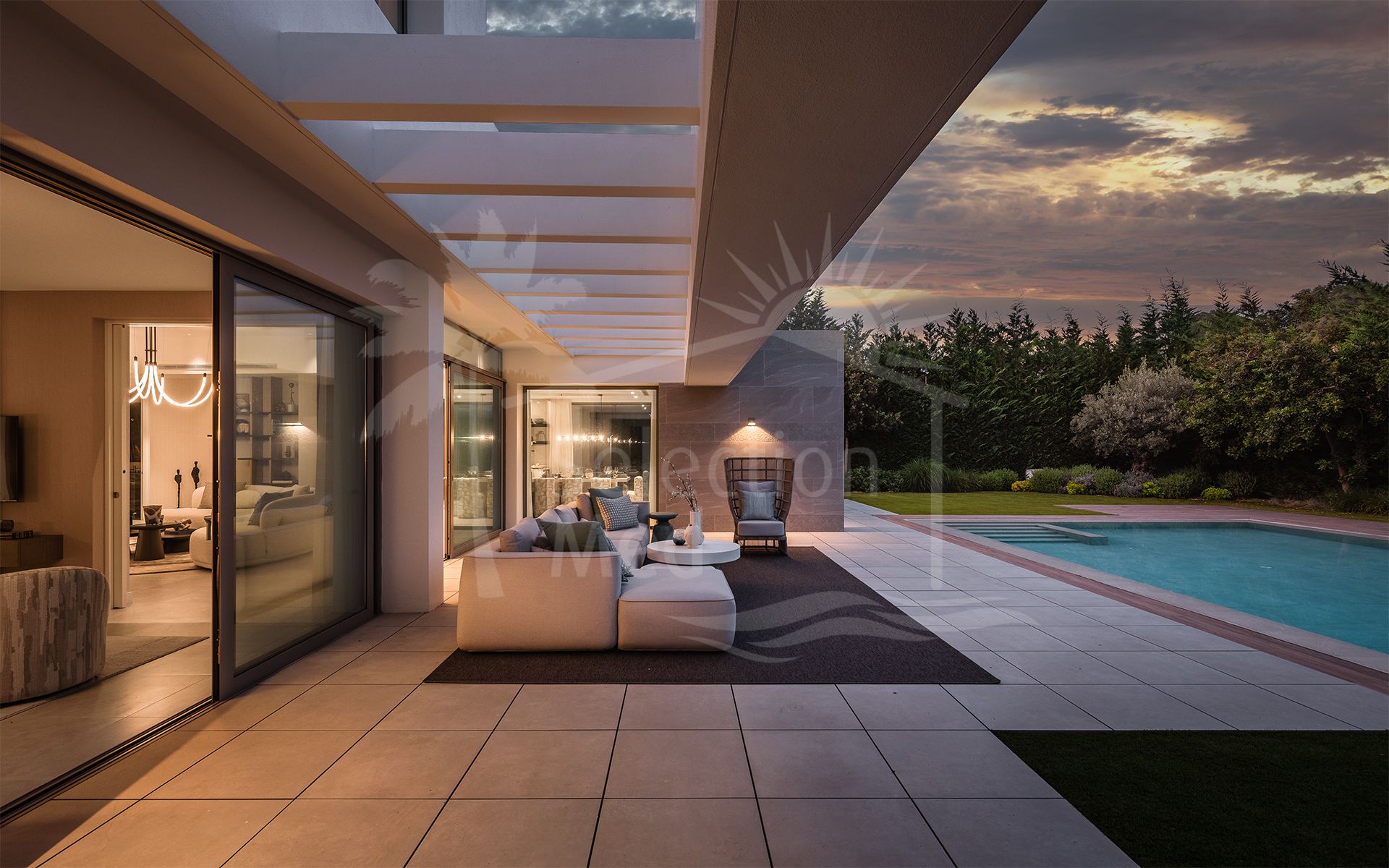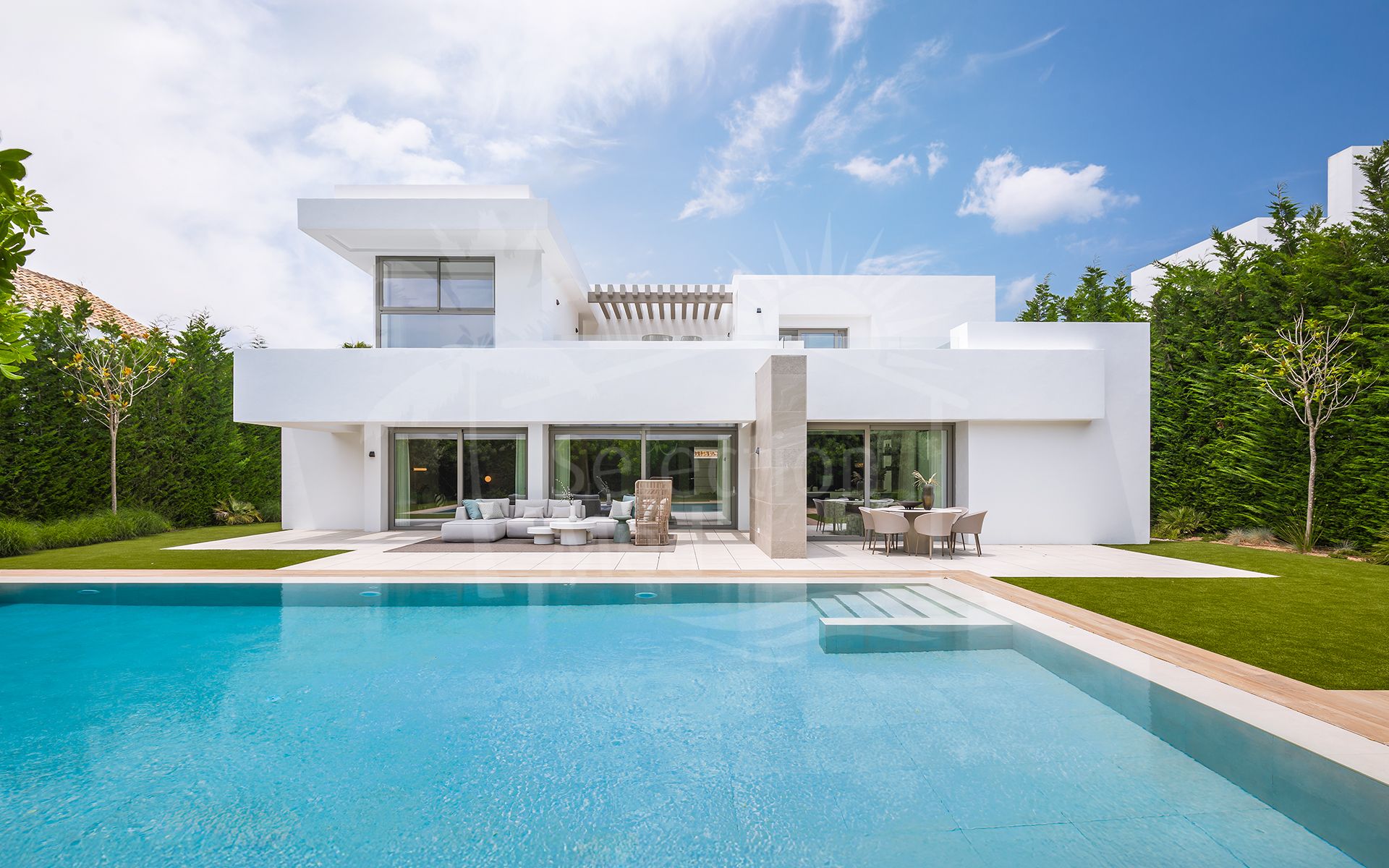 Villa à vendre à El Paraiso, Estepona Est avec 5 chambres, 5 salles de bains, 5 salles de bain en-suite, 1 toilettes, construit à 2022 et a piscine (privé), garage (abri voiture) et jardin (privé). Dimensions: 628m² construit, 807m² parcelle, 406m² intérieur et 222m² terrasse.