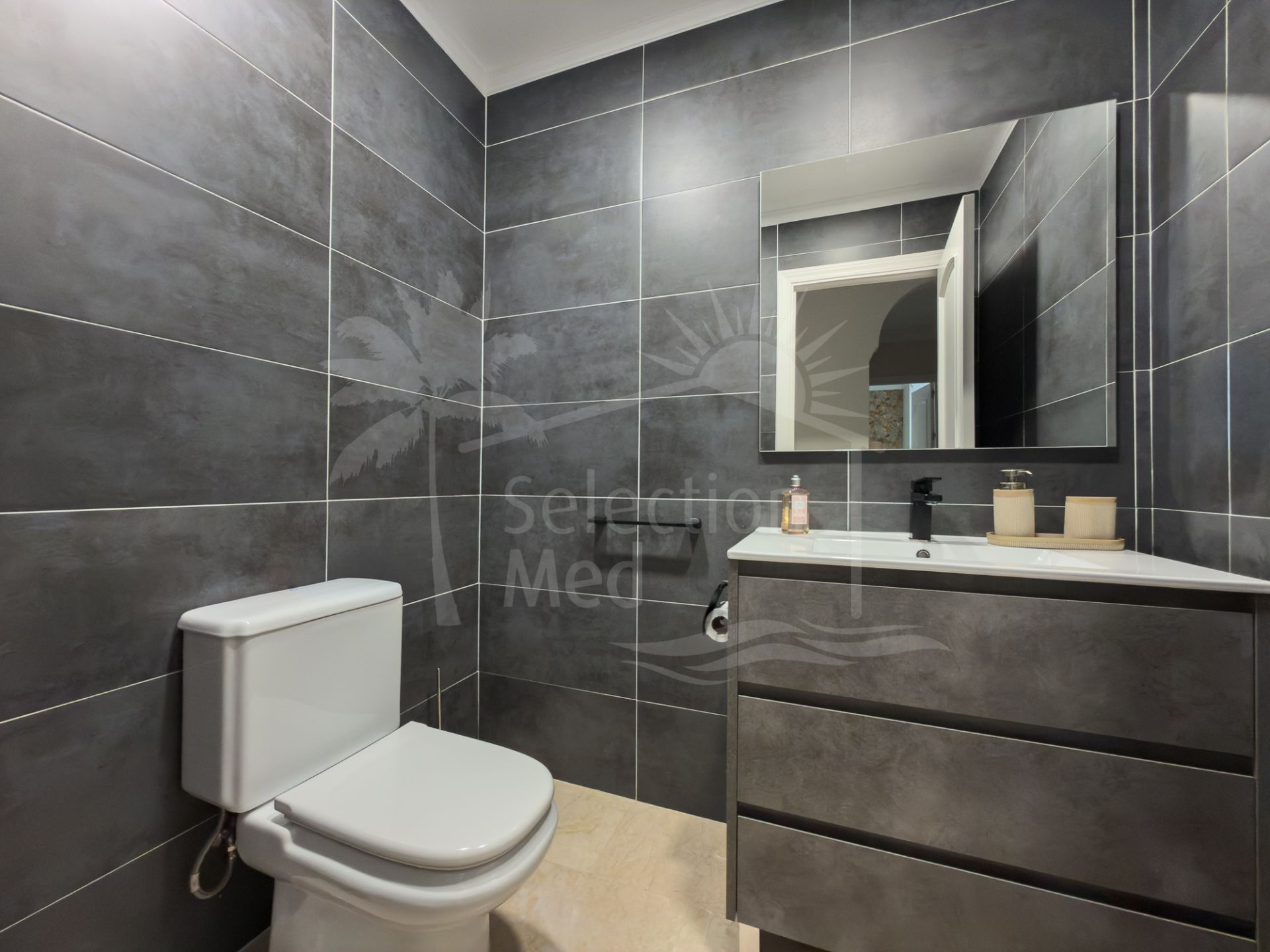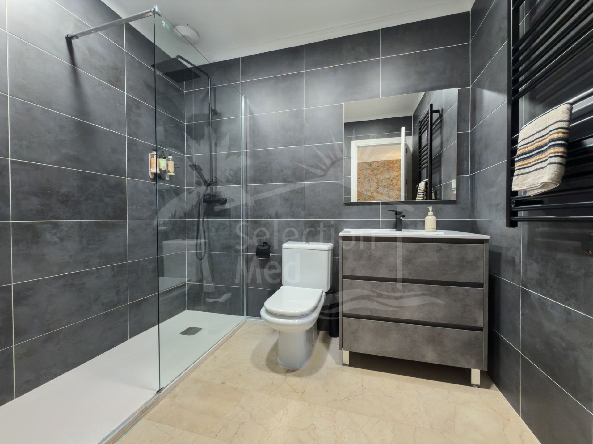 À l'intérieur, la propriété dispose d'un aménagement spacieux et ouvert avec un immense salon avec accès à la terrasse. La cuisine ouverte moderne avec coin repas est conçue pour la vie quotidienne et divertissante. Il y a quatre grandes chambres, chacune avec sa propre salle de bains privative, ainsi qu'une toilette supplémentaire, assurant un maximum de confort et d'intimité pour la famille et les invités.
