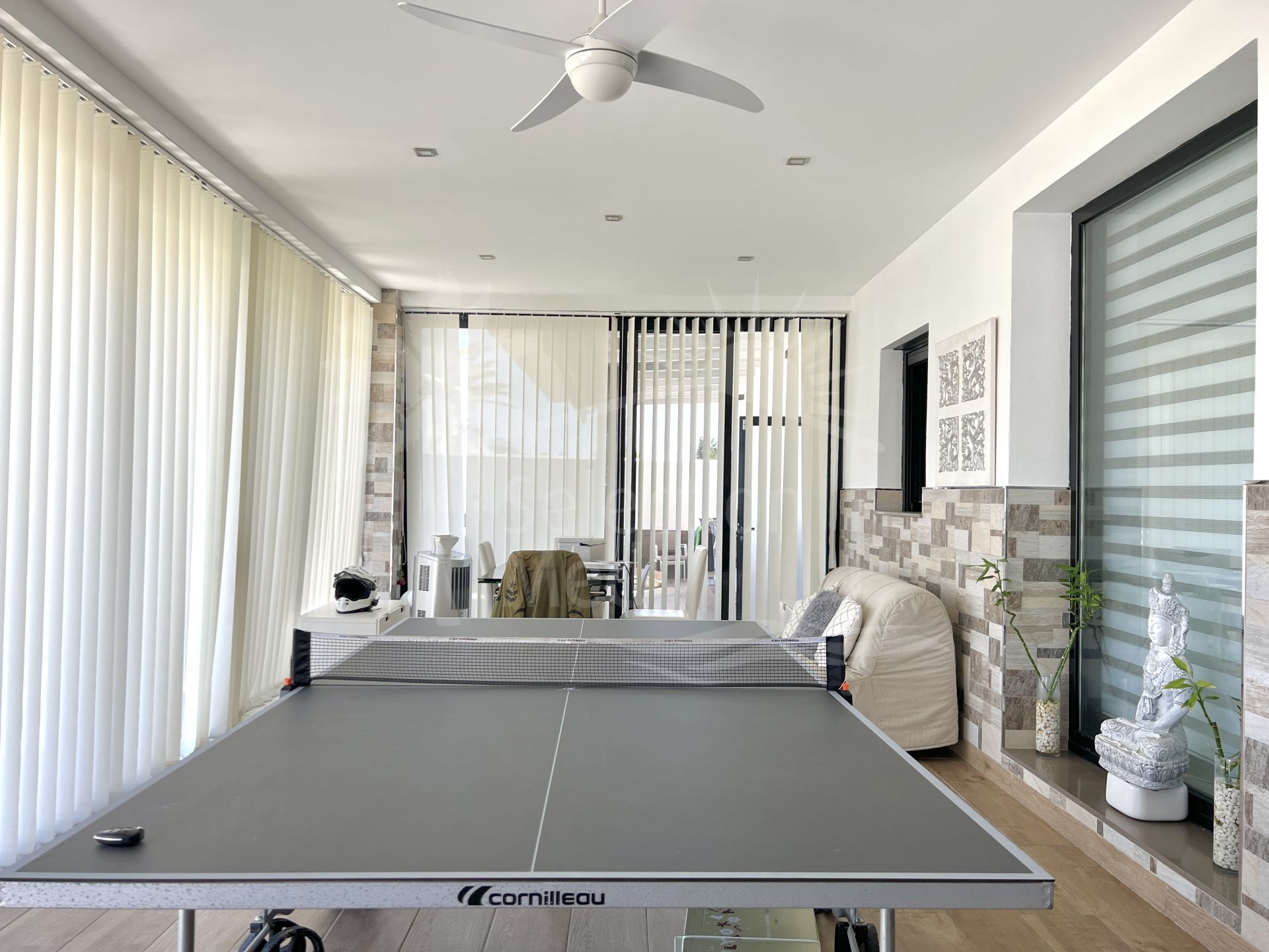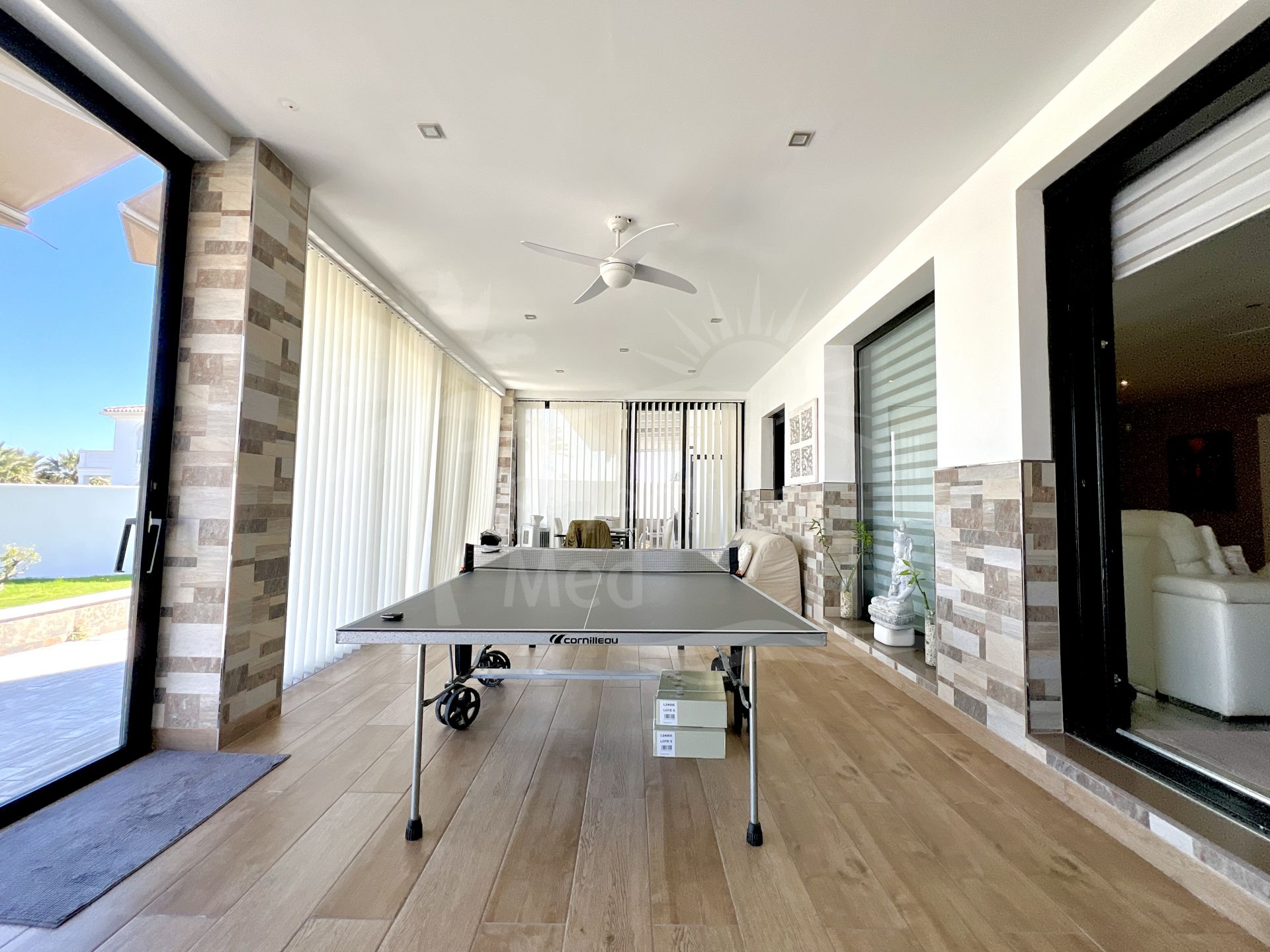 La terrasse extérieure est fermée par des fenêtres à double vitrage de haute qualité avec serrures de sécurité. Il y a une autre terrasse extérieure avec des auvents électriques de pointe et un espace barbecue et détente pour profiter en famille et entre amis.