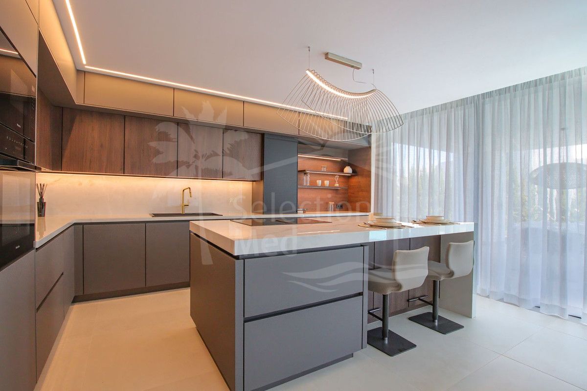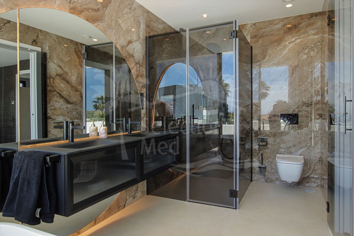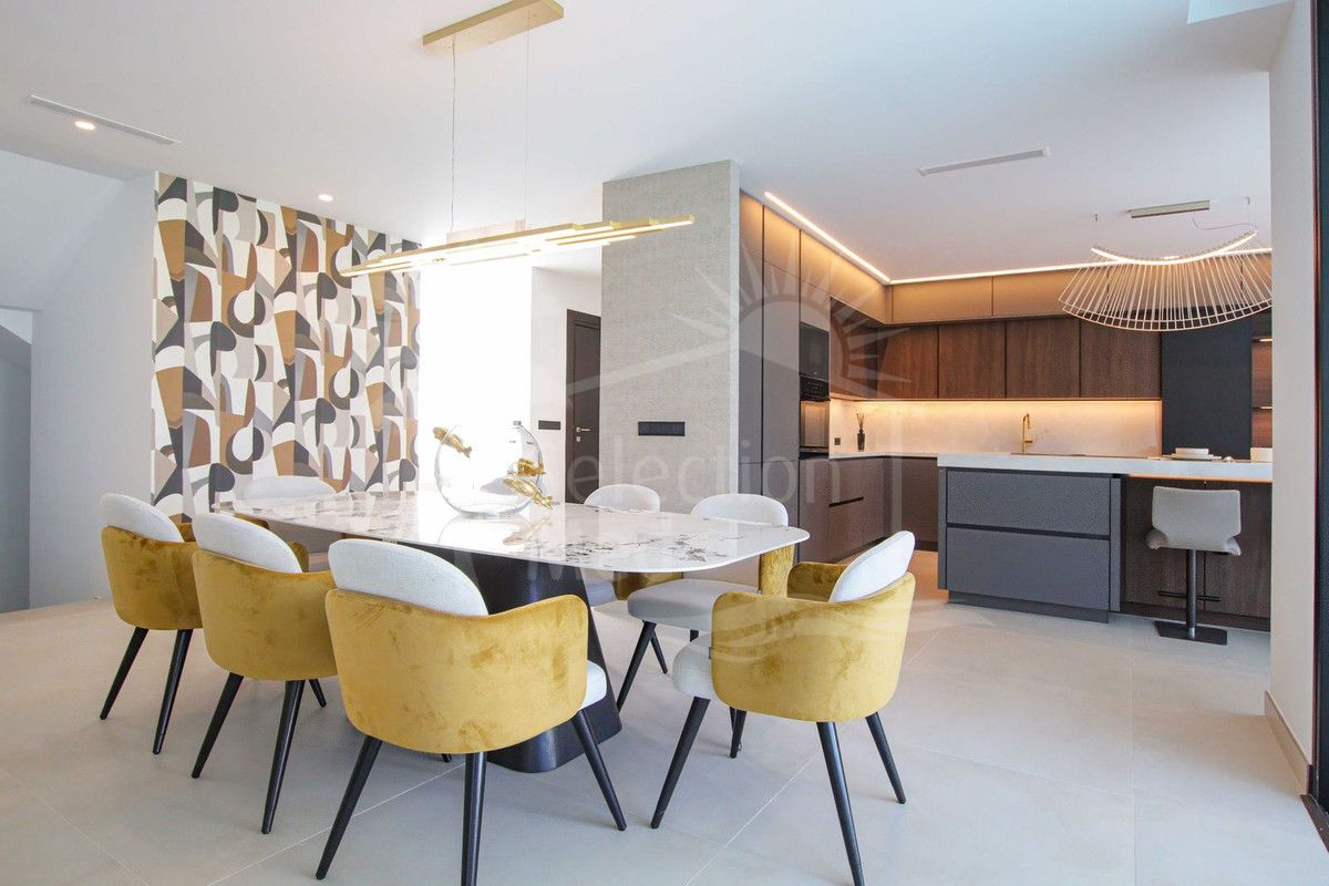 Cette superbe villa dispose de 4 chambres, 4 salles de bains et 1 WC, répartis sur 3 étages. Au rez-de-chaussée, vous pourrez profiter d'une vue partielle sur la mer, tandis que le premier étage et le solarium offrent une vue panoramique spectaculaire sur la mer, les montagnes et le golf.