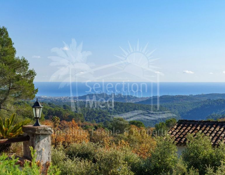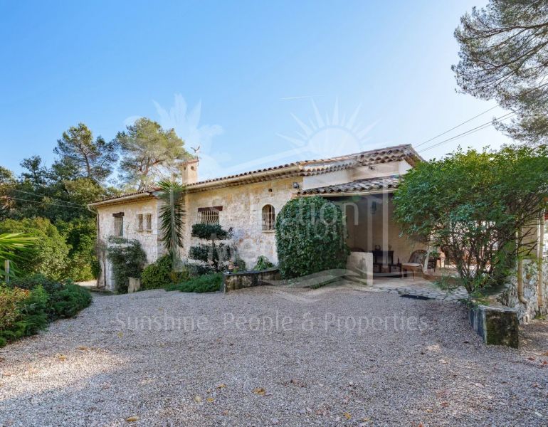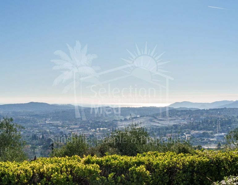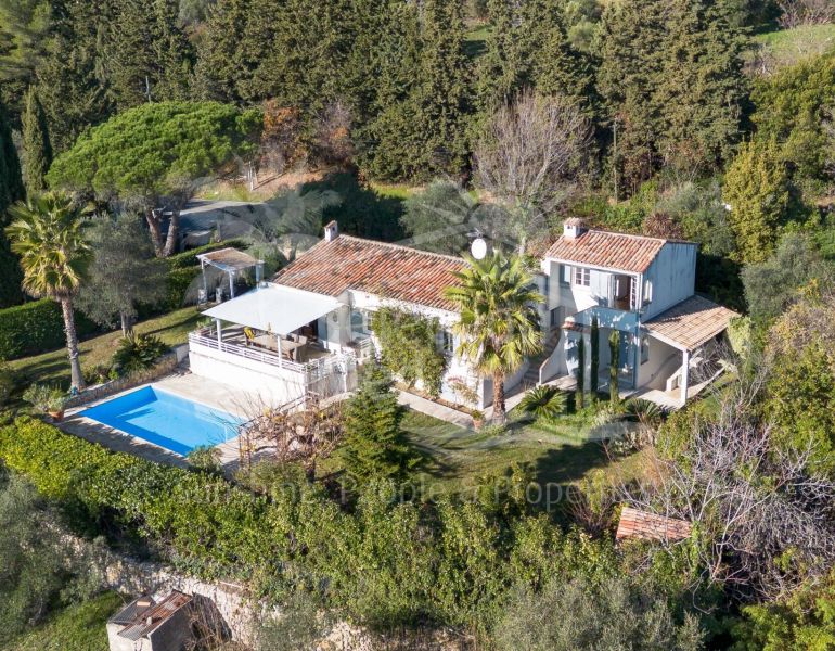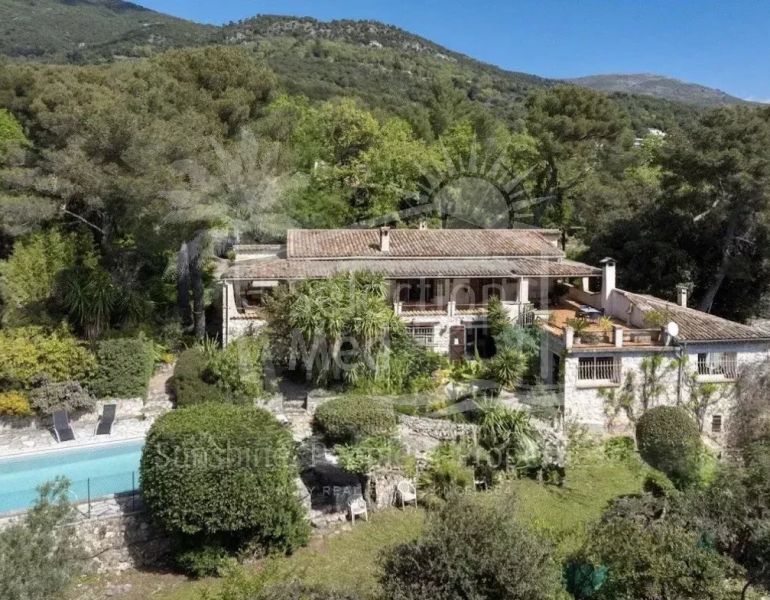 Villa à vendre à Tourrettes-sur-Loup avec 4 chambres, 3 salles de bains, construit à 1975 et a garage. Dimensions: 271.87m² construit et 4450m² parcelle. Cette propriété, orientation sud, dispose des commodités suivantes: chambre de études, climatisation, vue mer, cheminée, bon état...