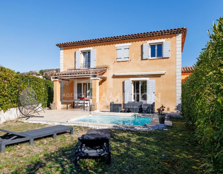Villa à vendre à Le Rouret avec 3 chambres, 2 salles de bains, construit à 2004 et a piscine et garage. Dimensions: 368m² parcelle et 98m² intérieur. Cette propriété dispose des commodités suivantes: bon état et tv par satellite.