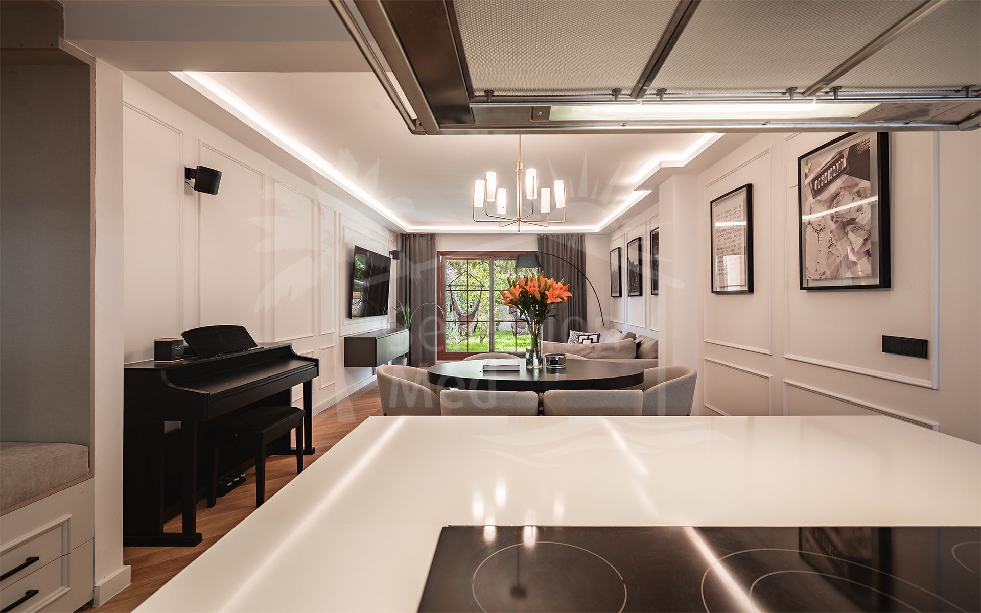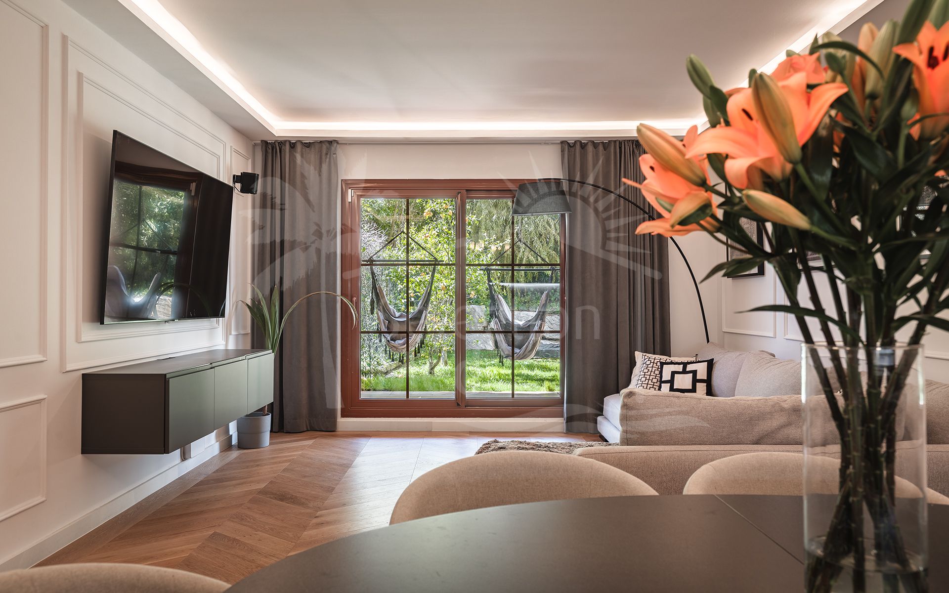 L'appartement se compose d'un salon/salle à manger avec accès à une terrasse couverte orientée sud-ouest et à un jardin privé de 70 m2, d'une cuisine ouverte avec coin buanderie/panterie, d'une chambre principale avec salle de bains privative et de deux chambres se partageant une salle de bains.