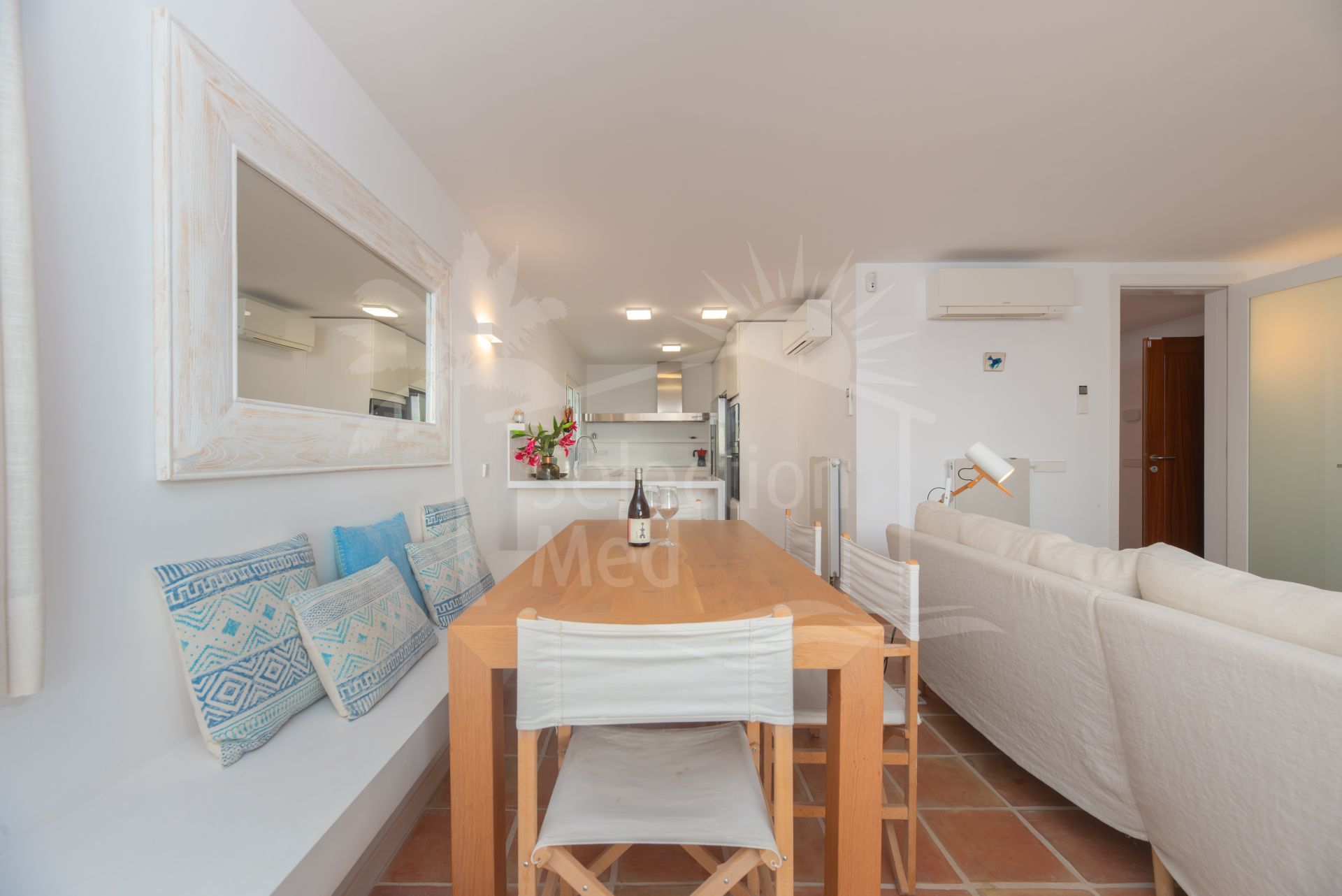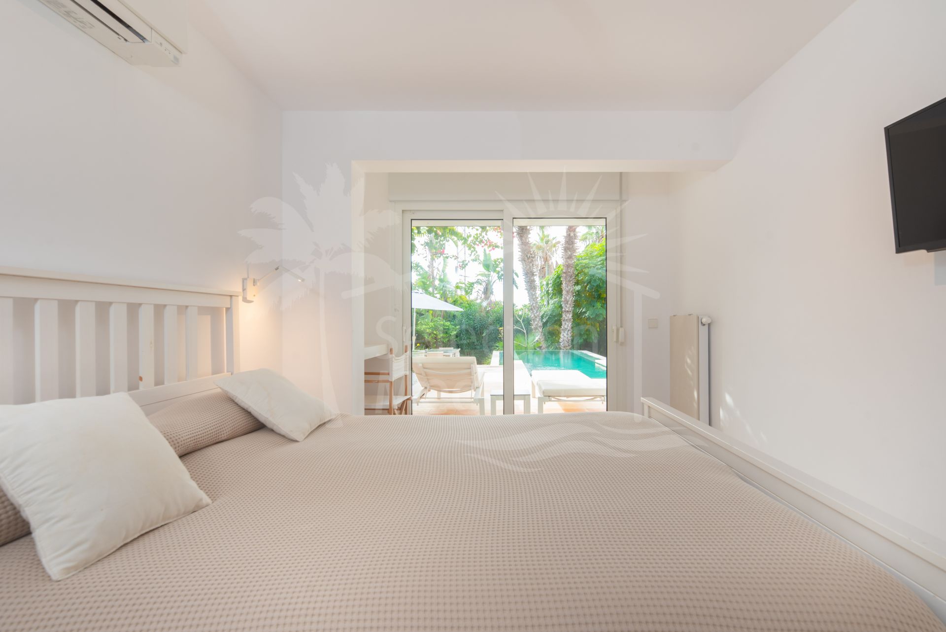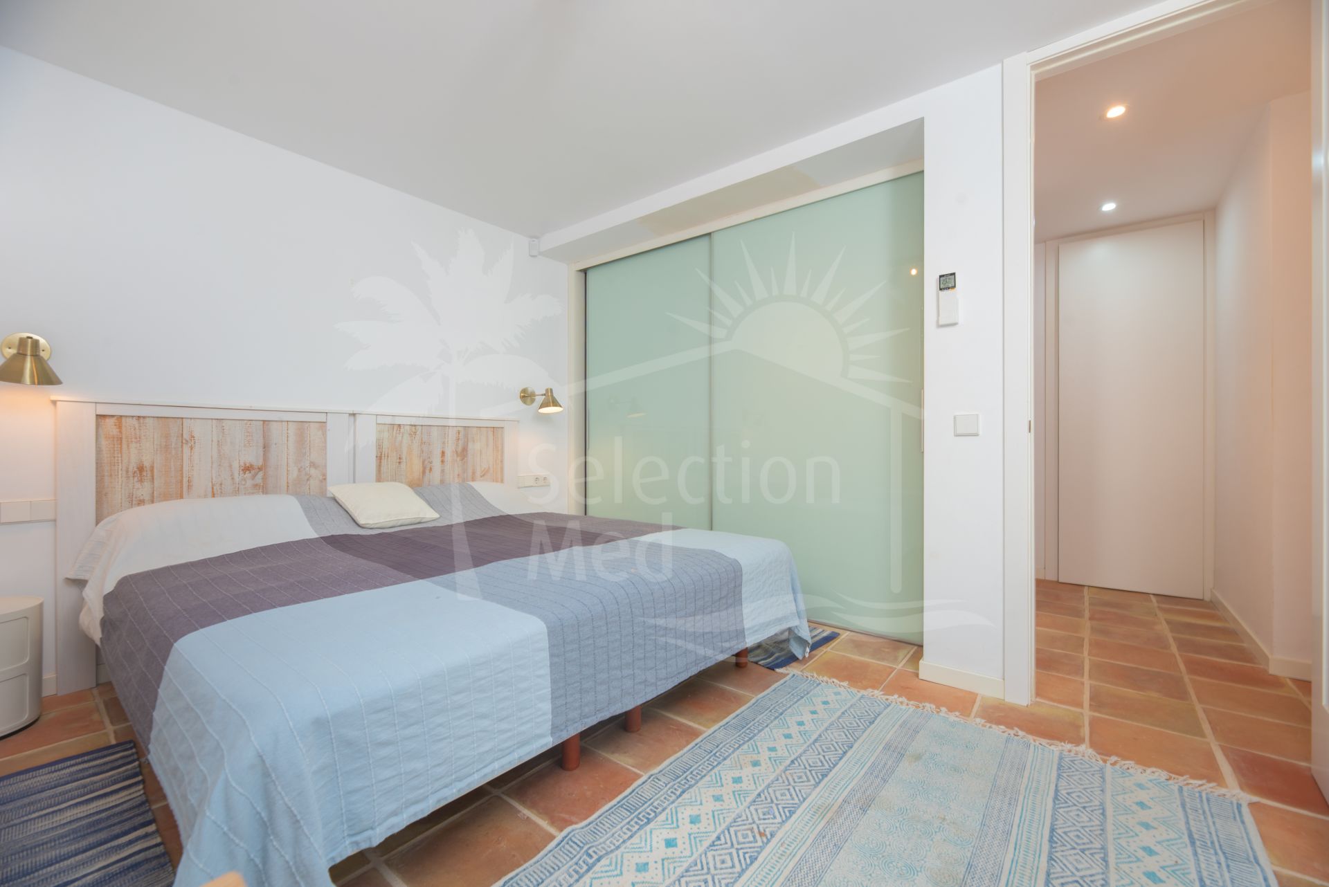 La salle principale s'ouvre sur le jardin et la piscine privée, créant une atmosphère lumineuse avec vue agréable sur l'environnement et la mer. Le logement est meublé et équipé, liste pour entrer en direct.