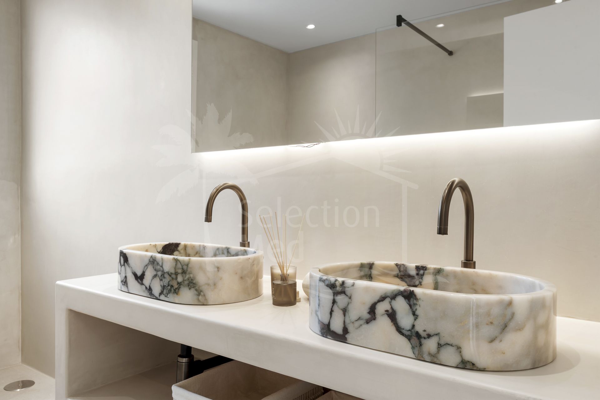 Chacune des quatre chambres a été conçue avec un goût exquis, offrant un havre de tranquillité et d'intimité pour les résidents et les invités. L'étage supérieur dispose d'une terrasse privée avec vue partielle sur la mer, idéal pour profiter d'un café le matin ou de moments de détente au coucher du soleil.