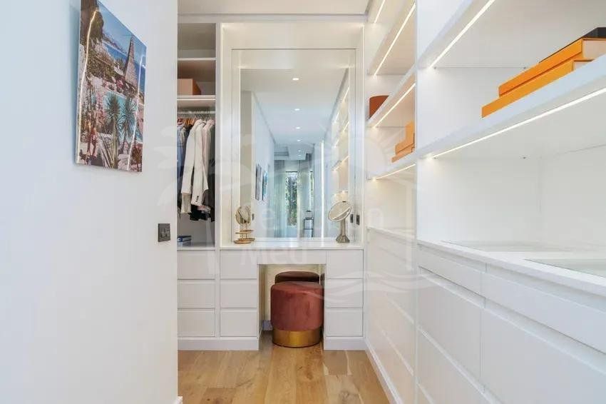 Étage supérieur : salon supplémentaire, une suite pour invités et la chambre principale, qui dispose d’un dressing et d’une terrasse privée avec vue sur la mer.
