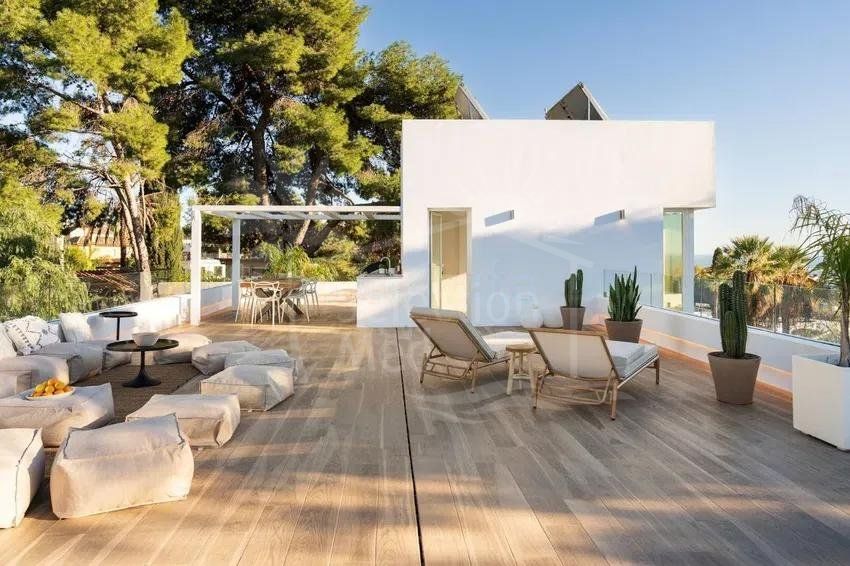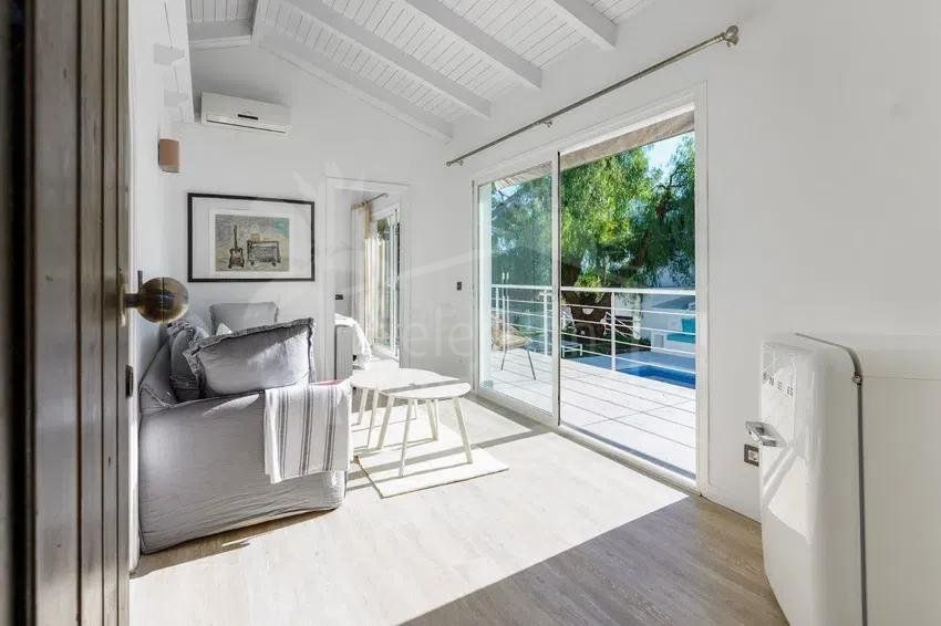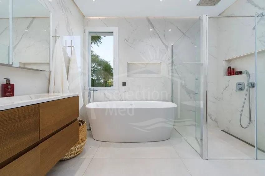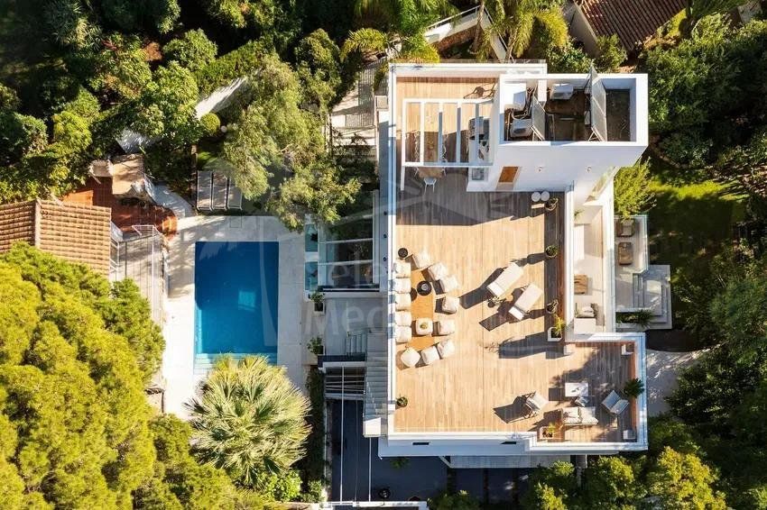 La villa a été entièrement rénovée, intégrant un nouvel étage supérieur, une terrasse solarium lumineuse et une maison d’invités indépendante, augmentant considérablement sa valeur et sa polyvalence.