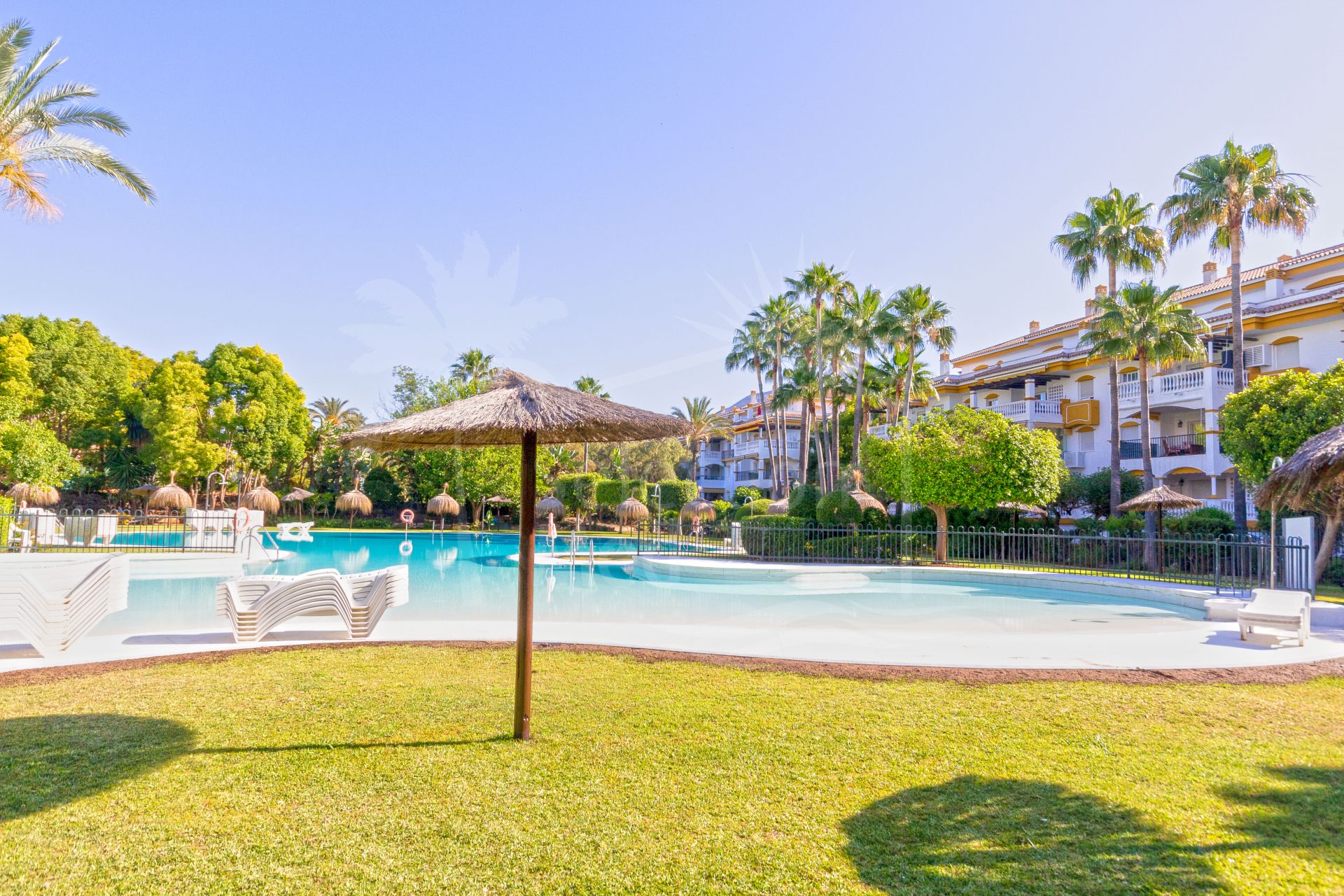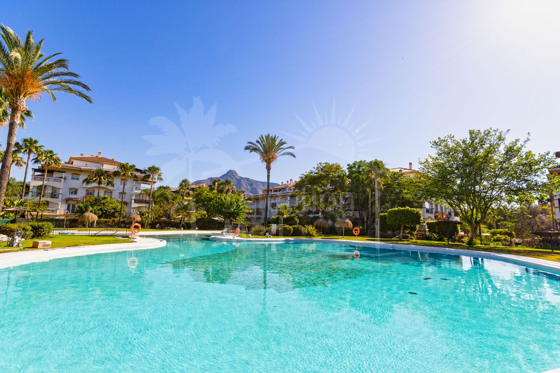 Appartement rez de chaussée à vendre à La Dama de Noche, Nueva Andalucia avec 2 chambres, 2 salles de bains, 1 salles de bain en-suite, construit à 2003 et a piscine (communautaire), garage (communautaire) et jardin (privé). Dimensions: 96m² construit, 135m² parcelle, 68m² intérieur et 18m² terrasse.