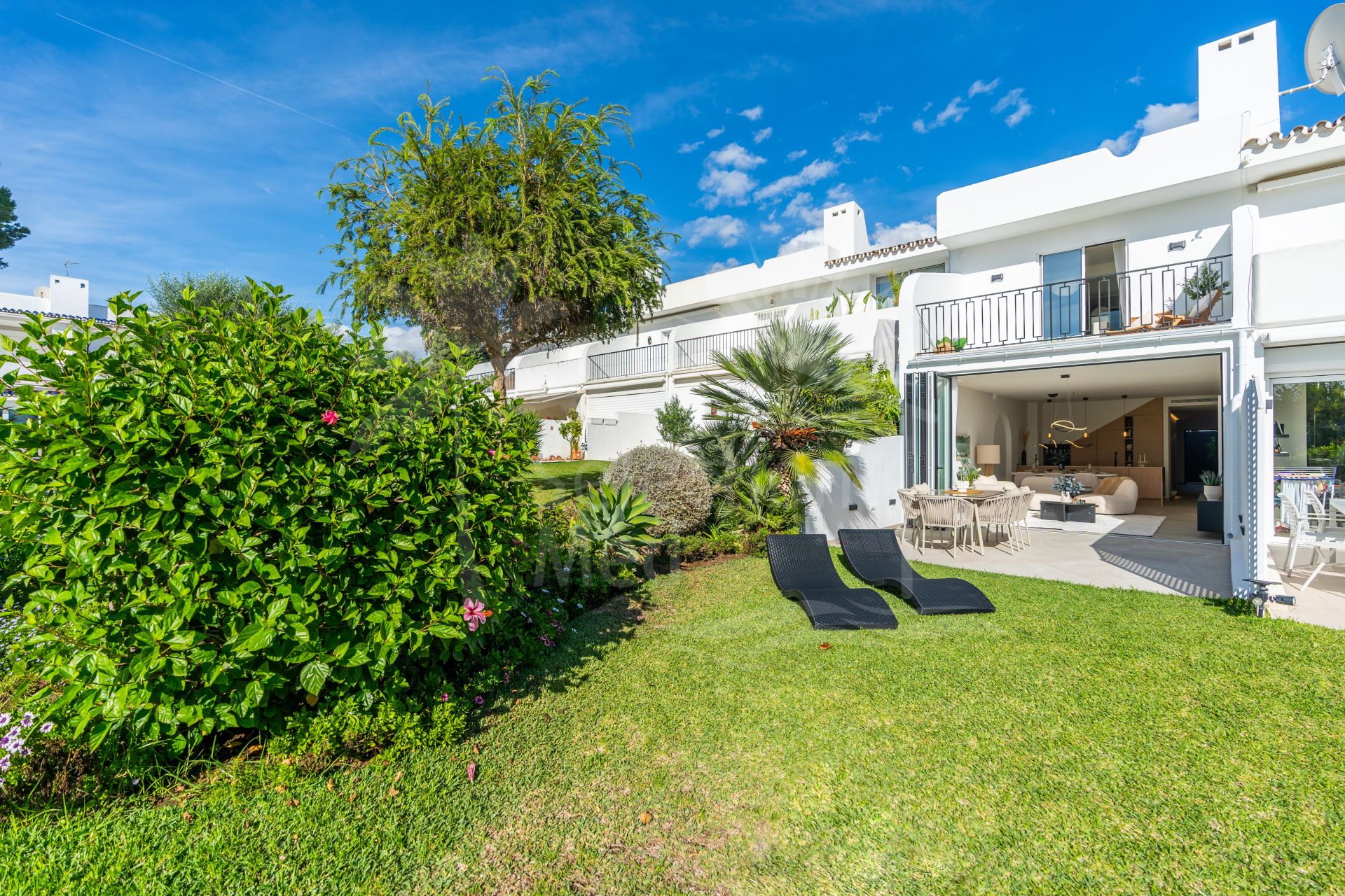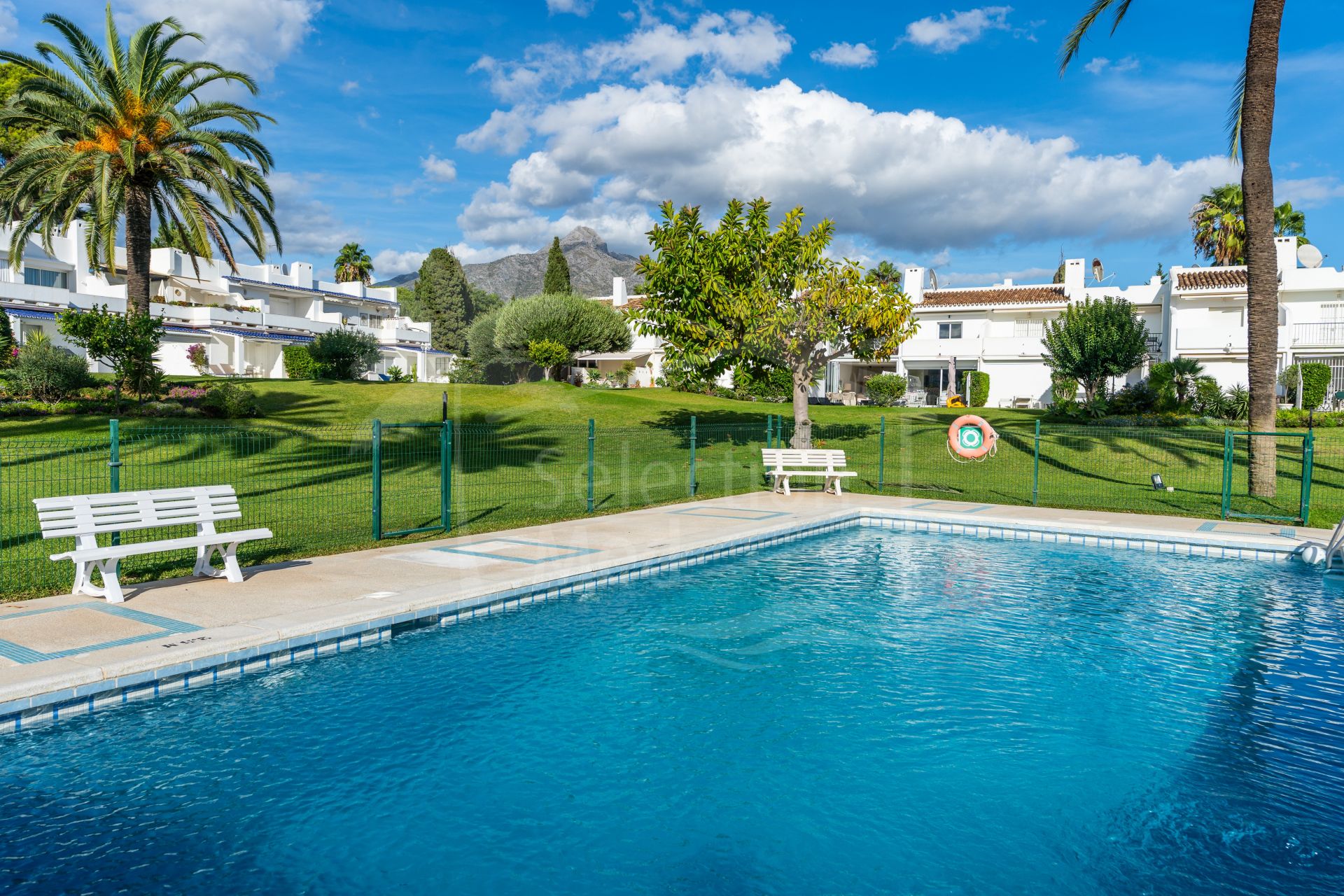 Maison de Ville à vendre à La Rinconada, Nueva Andalucia avec 4 chambres, 3 salles de bains, 2 salles de bain en-suite, 1 toilettes, construit à 1983 et a piscine (communautaire), garage (abri voiture) et jardin (privé). Dimensions: 230m² construit, 170m² intérieur et 60m² terrasse.