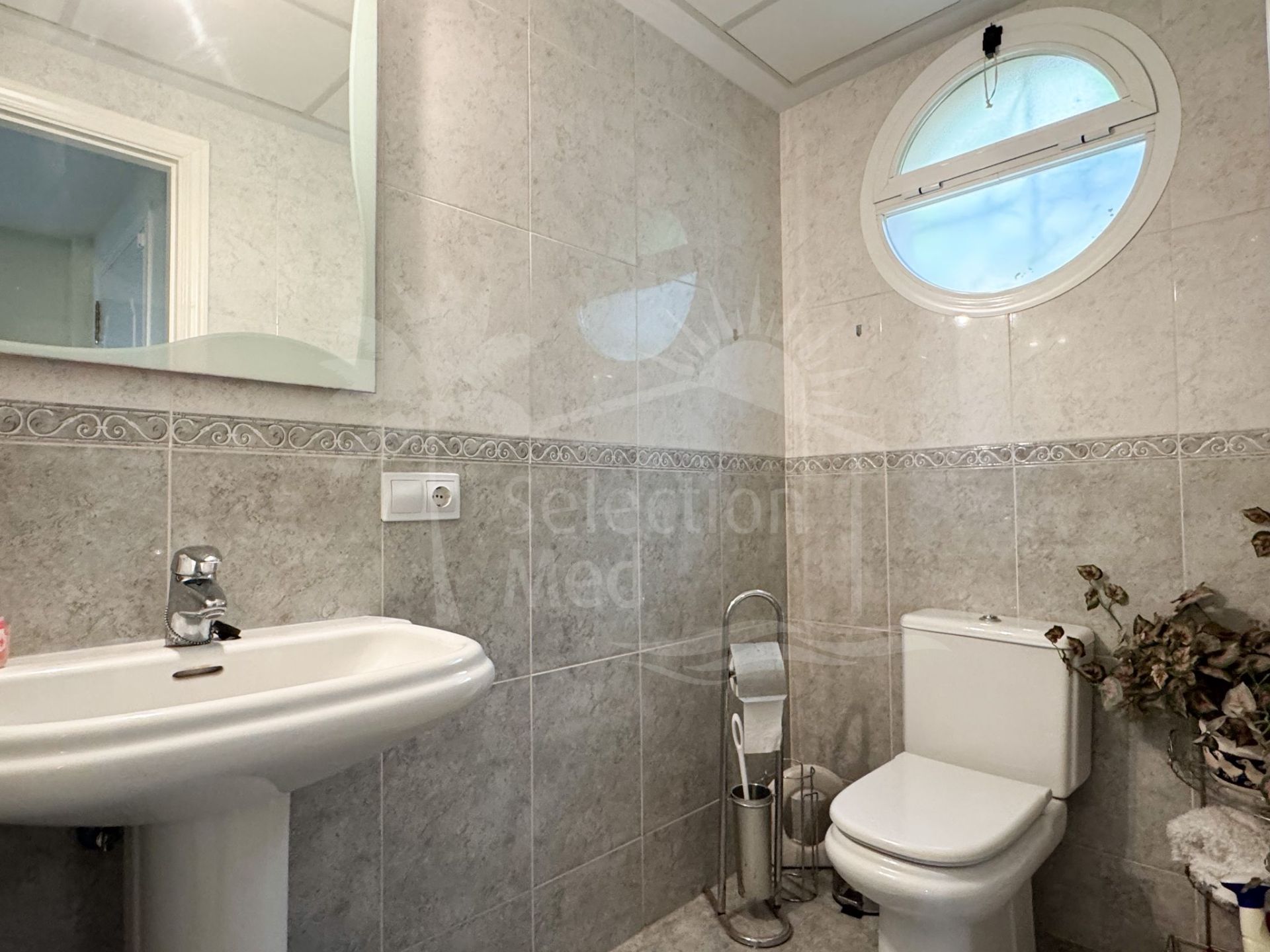 La propriété est exceptionnellement spacieuse et dispose de finitions de haute qualité, avec 3 terrasses, et un toit solarium, parfait pour se détendre ou profiter de repas en plein air. Le logement dispose d’une entrée privée avec porche couvert, un hall d’entrée attrayant menant à la généreuse salle à manger, avec cheminée et portes patio menant sur la grande terrasse. La terrasse est idéale pour se divertir, avec vue panoramique sur la campagne environnante jusqu’à la mer, et est équipée de canapés-lits, autour d’une table avec foyer intégré, chaises longues, et une petite piscine jacuzzi avec des sièges en bois.