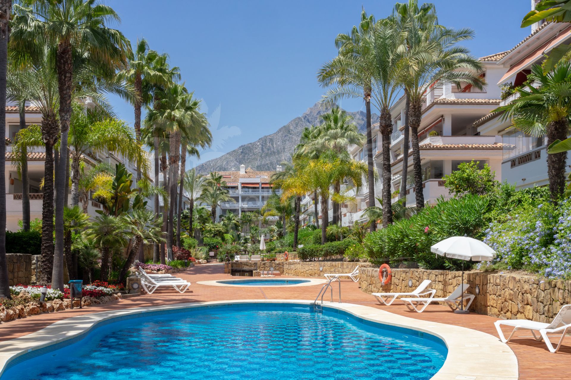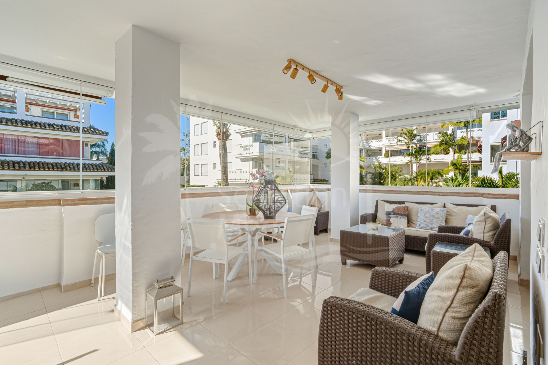 Excellent, entièrement rénové, appartement de trois chambres au premier étage sur Marbella, Golden Mile, dans la communauté de plage recherchée en première ligne Las Cañas Beach, avec service de sécurité 24h, plusieurs piscines communes et jardins tropicaux. En plus d'être à quelques pas de nombreux bars, magasins et restaurants. Casablanca La plage, l'un des meilleurs de la côte, est juste devant la porte d'entrée. L'appartement dispose d'un spacieux salon ouvert et salle à manger avec portes françaises menant à la terrasse privée qui est fermée par des curtiens en verre; cuisine entièrement équipée; suite parentale avec accès à la terrasse; deux chambres d'hôtes et une salle de bains. D'autres caractéristiques comprennent la climatisation chaude et froide, ainsi que des placards.