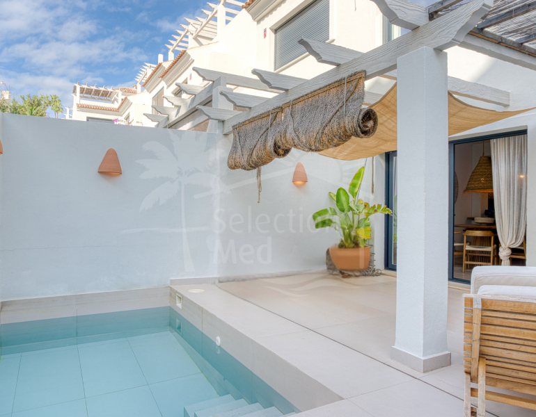 NOUVELLE EXCLUSIVITE À quelques pas de la mer, cette townhouse rénovée est située dans l’urbanisation très prisée de Laguna Beach à Estepona. Répartie sur deux niveaux, la propriété offre 2 chambres, 2 salles de bains (dont une en suite), un WC...