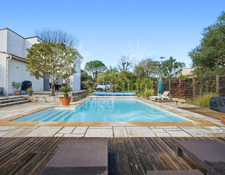 Maison à vendre à Valbonne avec 3 chambres, 2 salles de bains, 2 toilets, construit à 1972 et a piscine et garage. Dimensions: 992m² parcelle et 107m² intérieur. Cette propriété dispose des commodités suivantes: salle de séjour, salle à manger séparée,...