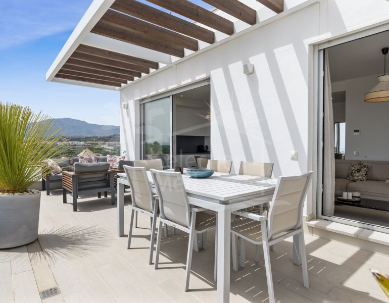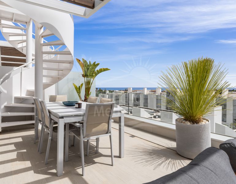 Appartement Terrasse à vendre à New Golden Mile, Estepona Est avec 3 chambres, 3 salles de bains, construit à 2003 et a piscine (communautaire), garage et jardin (communautaire). Dimensions: 154m² construit et 203m² terrasse. Cette propriété, orientation sud-ouest, dispose des commodités...
