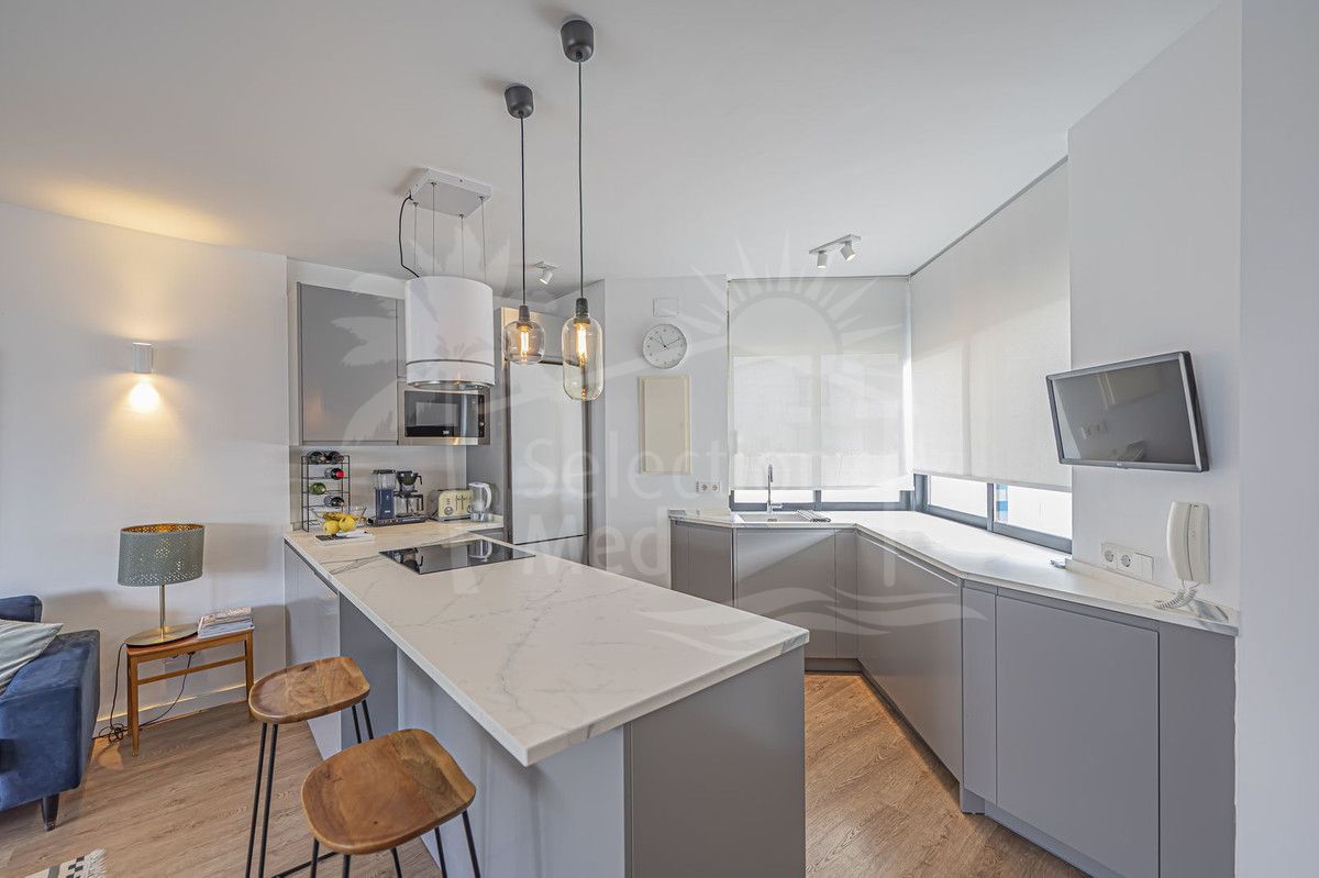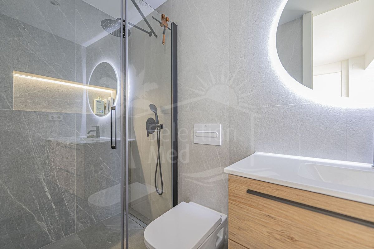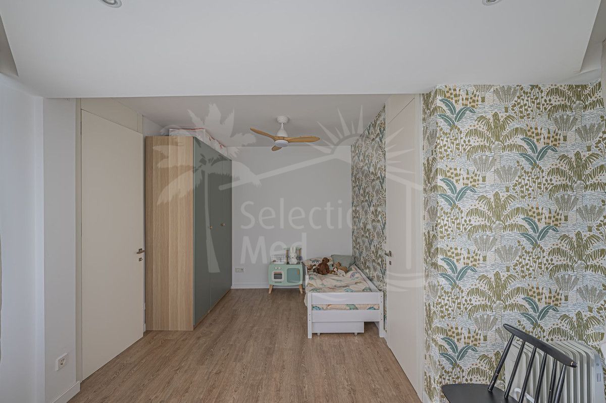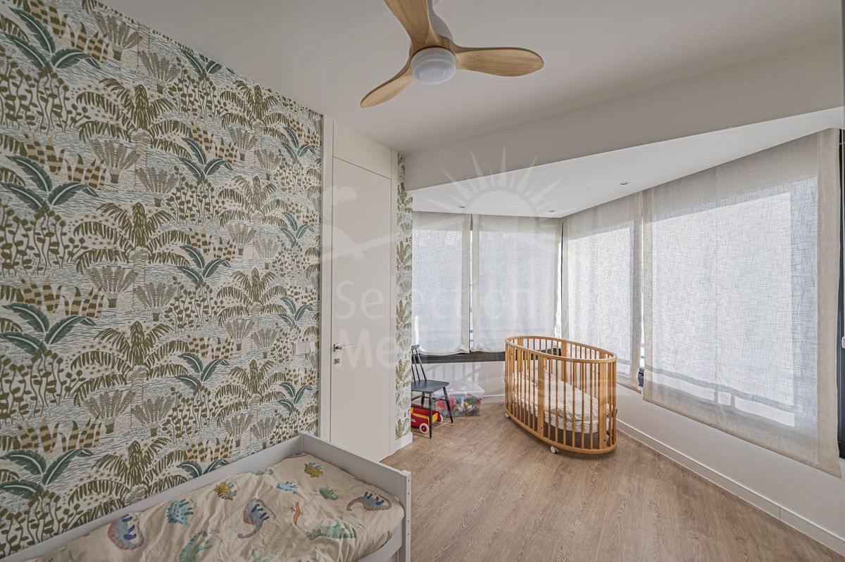 À l’étage supérieur se trouvent deux chambres avec salles de bains privatives, toutes deux avec des finitions de première qualité. La chambre principale comprend un espace détente ou lecture confortable avec vue partielle sur la mer. Le logement dispose au total de trois chambres et trois salles de bains, ainsi que de placards intégrés optimisant le rangement.
