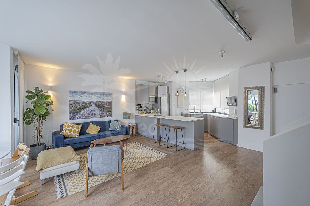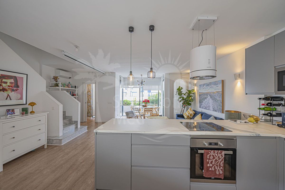 Au rez-de-chaussée se trouve un vaste salon avec accès direct à une terrasse orientée à l’est et à l’ouest, idéale pour profiter du soleil une grande partie de la journée. La cuisine, intégrée à l’espace, est équipée d’appareils électroménagers haut de gamme et présente un design contemporain qui apporte chaleur et fonctionnalité. À ce même niveau, il y a également des toilettes pour les invités.