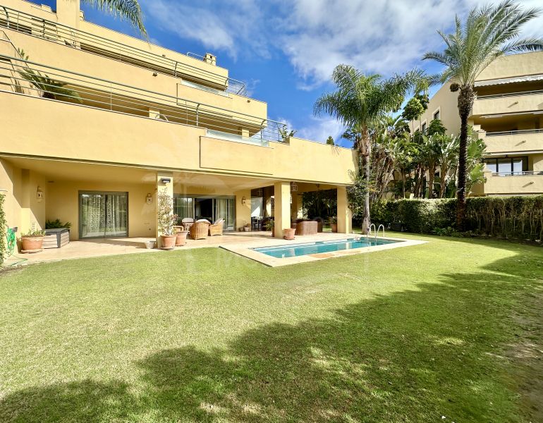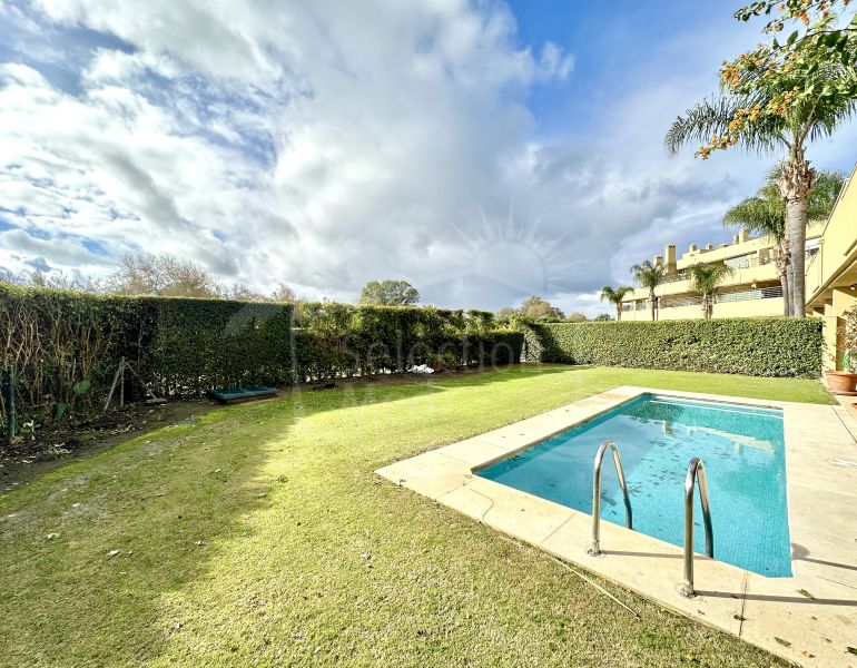 Appartement rez de chaussée à vendre à Ribera del Rio, Marina de Sotogrande avec 4 chambres, 3 salles de bains, 2 salles de bain en-suite, 1 toilettes, construit à 2005 et a piscine (privé), garage (privé) et jardin (privé). Dimensions:...