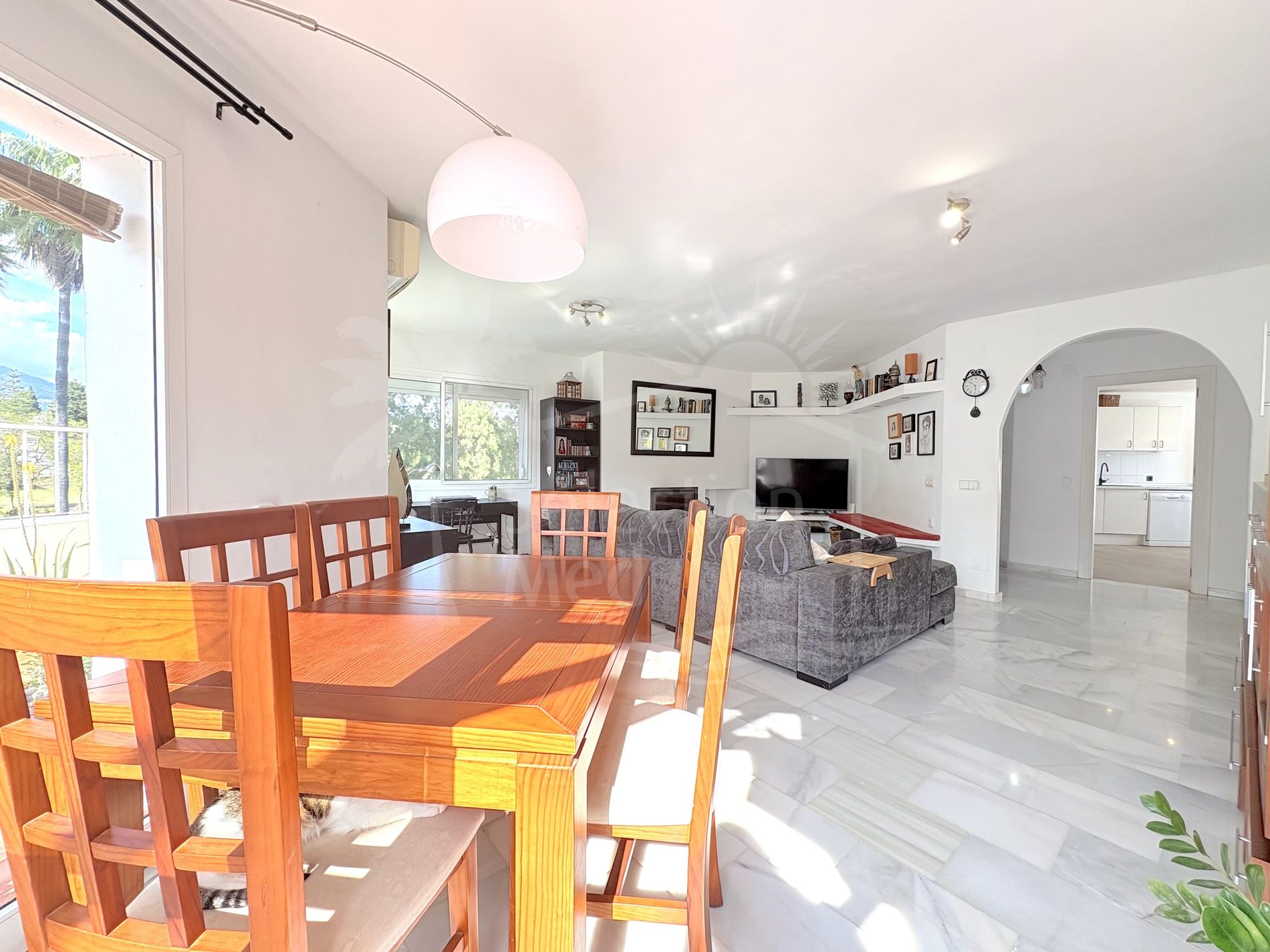 L'appartement offre 136 m2 d'espace intérieur plus 45 m2 de terrasses, créant un style de vie intérieur-extérieur merveilleux. Le salon lumineux avec cheminée s'ouvre sur une grande terrasse exposée sud-ouest avec vue sur le golf, parfait pour manger en plein air et profiter de couchers de soleil spectaculaires. La cuisine rénovée se connecte à une deuxième terrasse, idéale pour le petit déjeuner au soleil du matin.