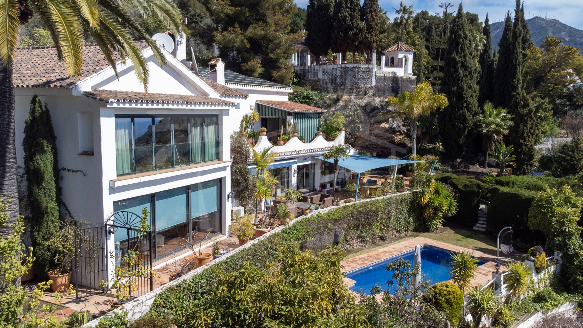 Villa à vendre à Mijas Pueblo, Mijas avec 4 chambres, 4 salles de bains, 4 salles de bain en-suite, 1 toilettes, construit à 1984 et a piscine (privé), garage (privé) et jardin (privé). Dimensions: 392m² construit et 1974m² parcelle.