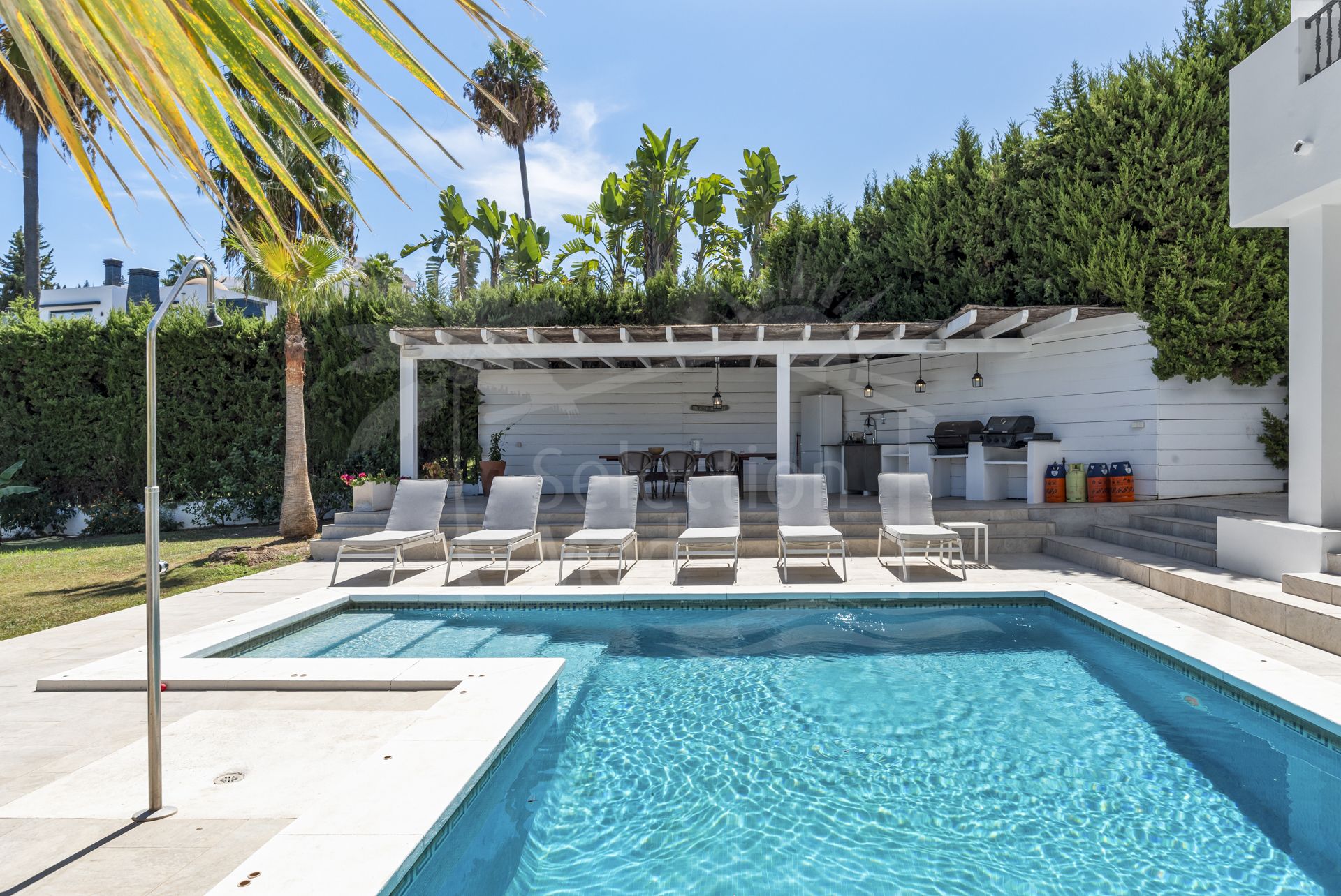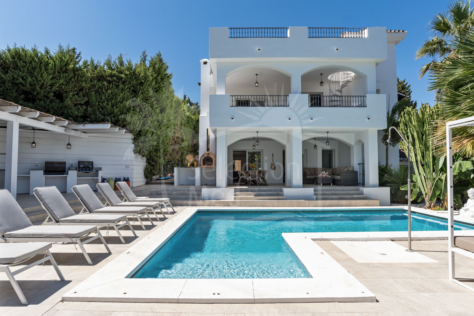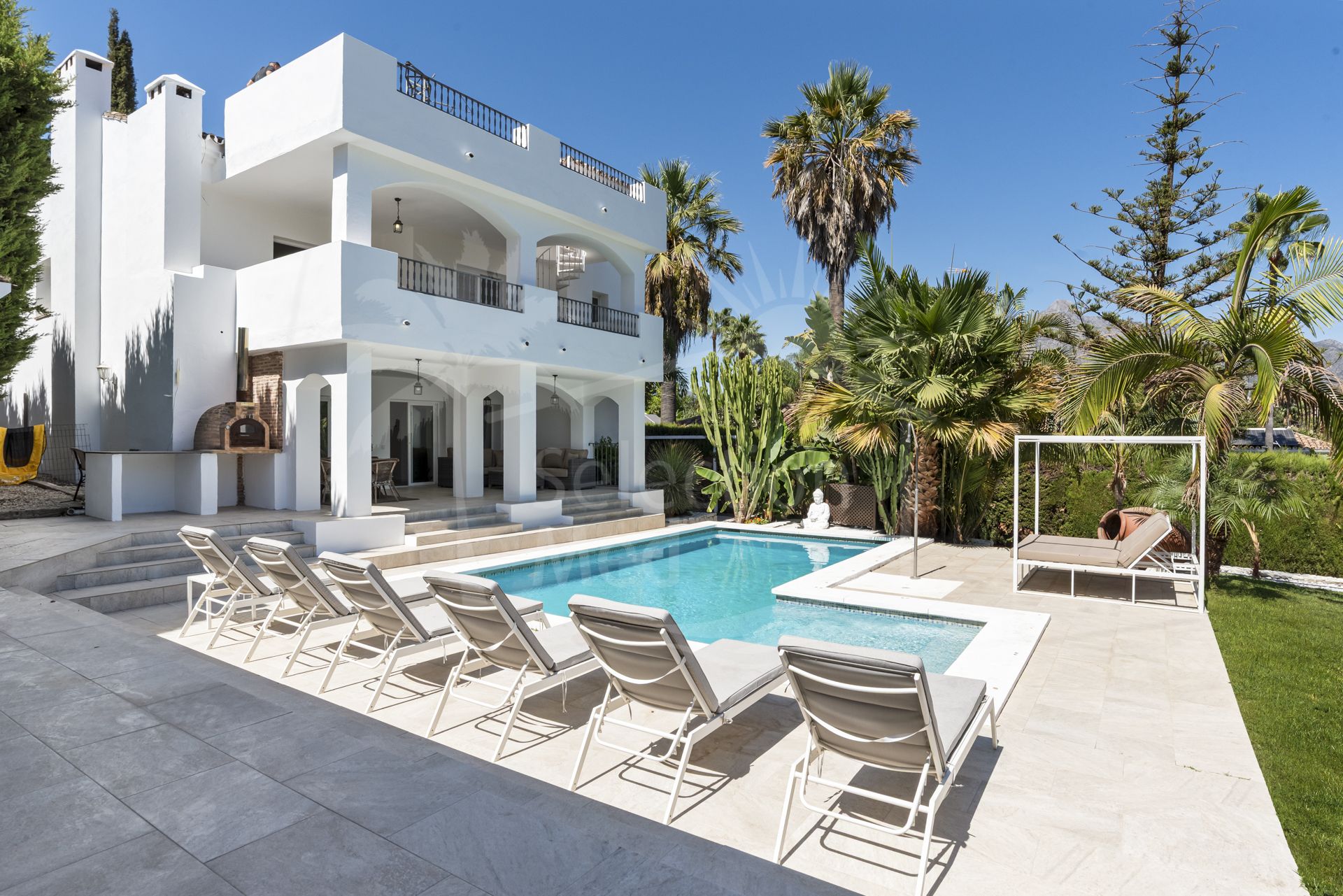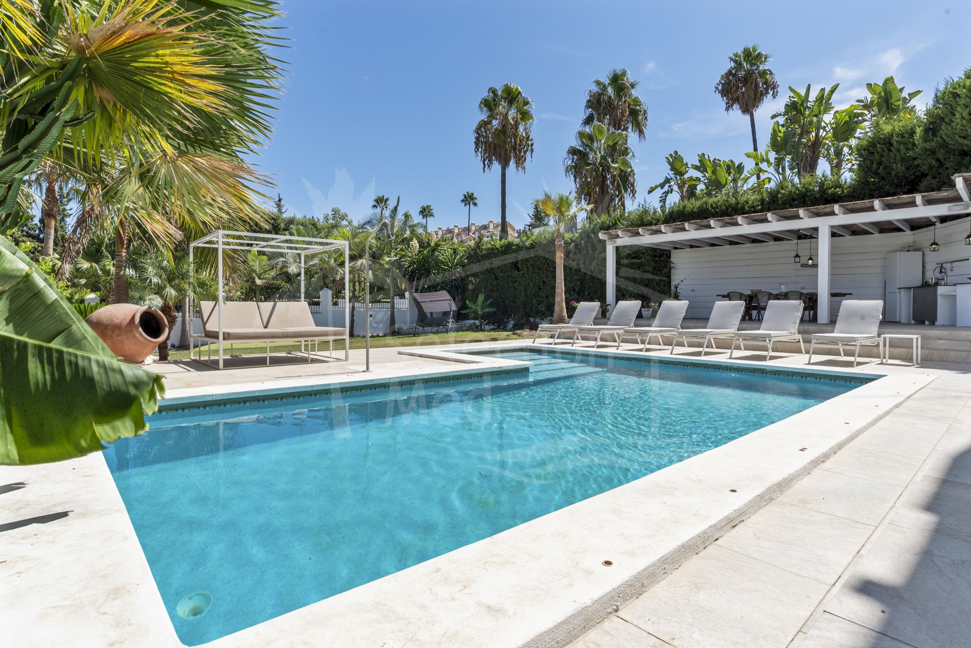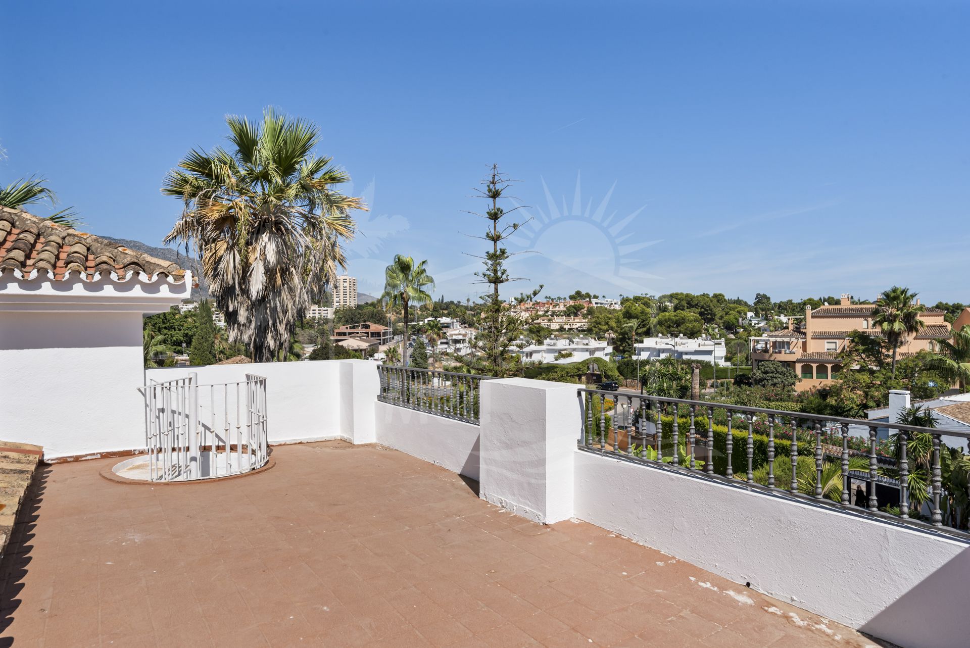 Maison à vendre à Nueva Andalucia, Marbella avec 4 chambres, 3 salles de bains, 1 toilettes et a piscine (privé), garage (privé) et jardin (privé). Dimensions: 336m² construit, 1028m² parcelle et 76m² terrasse.
