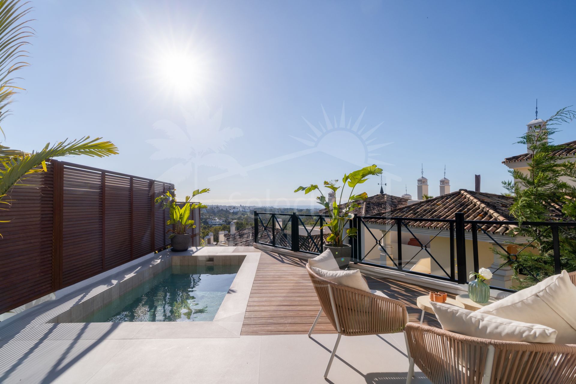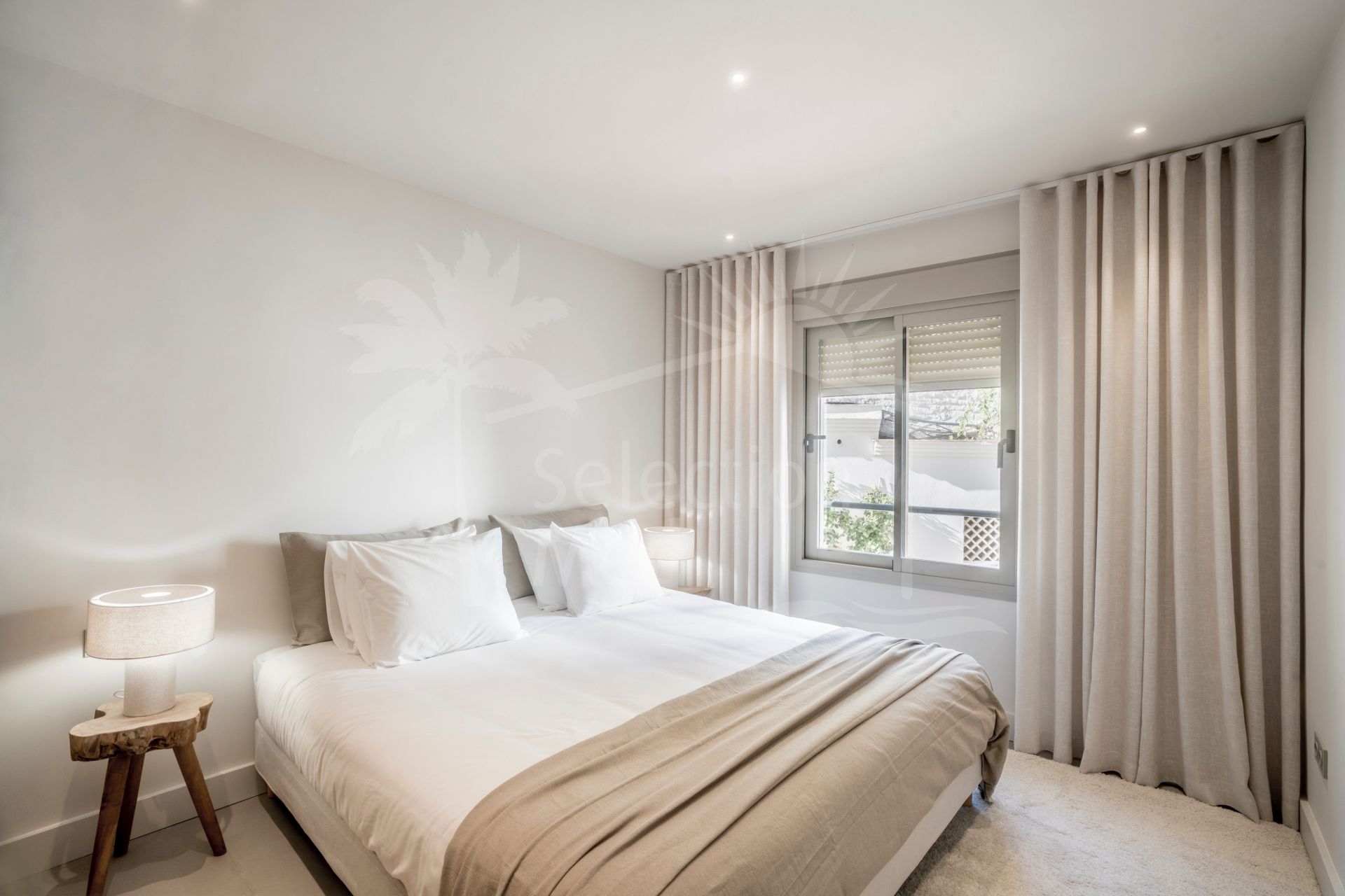 Appartement rez de chaussée à vendre à Palacetes Los Belvederes, Nueva Andalucia avec 3 chambres, 3 salles de bains, 3 salles de bain en-suite, construit à 2003 et a piscine (privé), garage (privé) et jardin (privé). Dimensions: 143m² construit et 35m² terrasse.