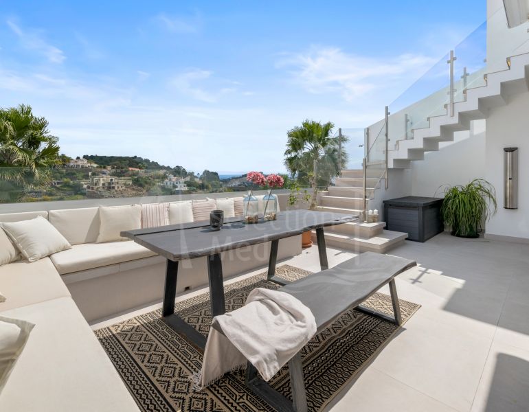 Duplex Penthouse à vendre à Serenity Views, Estepona Ouest avec 3 chambres, 3 salles de bains, construit à 2019 et a piscine (communautaire) et garage (privé). Dimensions: 126m² construit et 119m² terrasse. Cette propriété dispose des commodités suivantes: terrasse privée, roofterrace,...