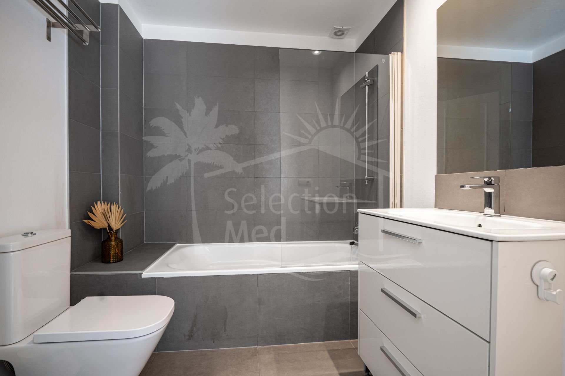 Située dans un petit complexe résidentiel calme, les résidents profitent de jardins paysagers, de deux piscines et d’un accès privé direct à la plage via le sentier côtier Senda Litoral, idéal pour des promenades au bord de la mer et profiter pleinement du style de vie méditerranéen.